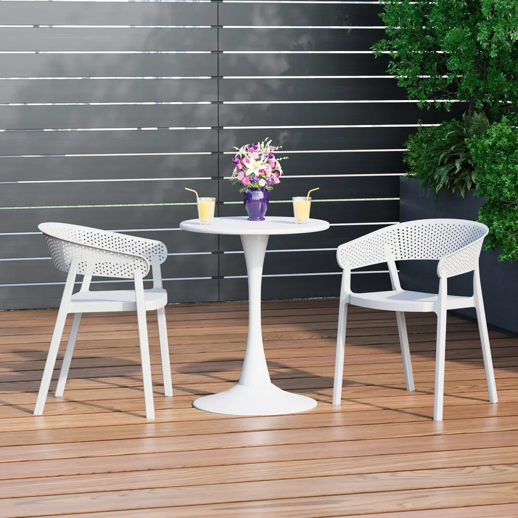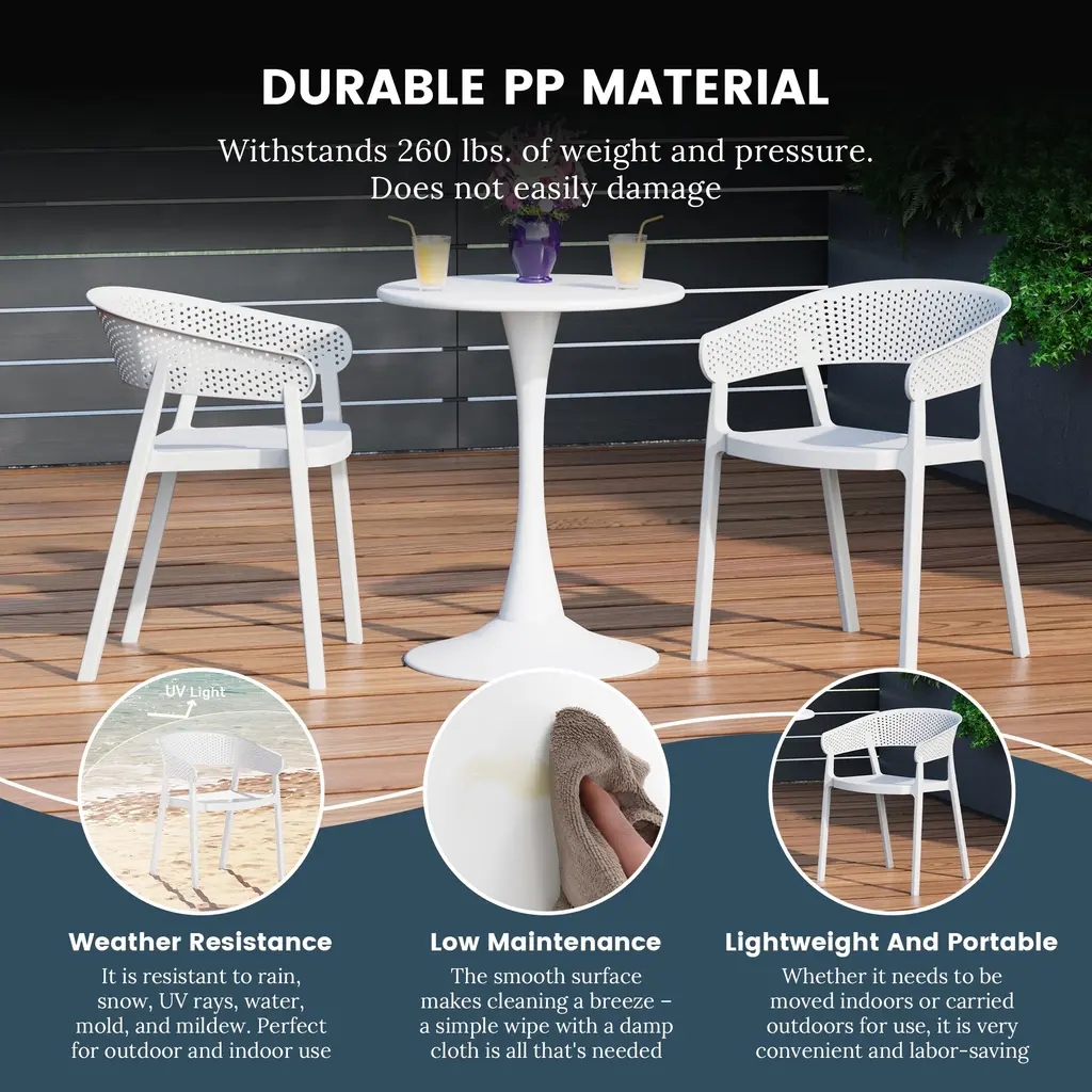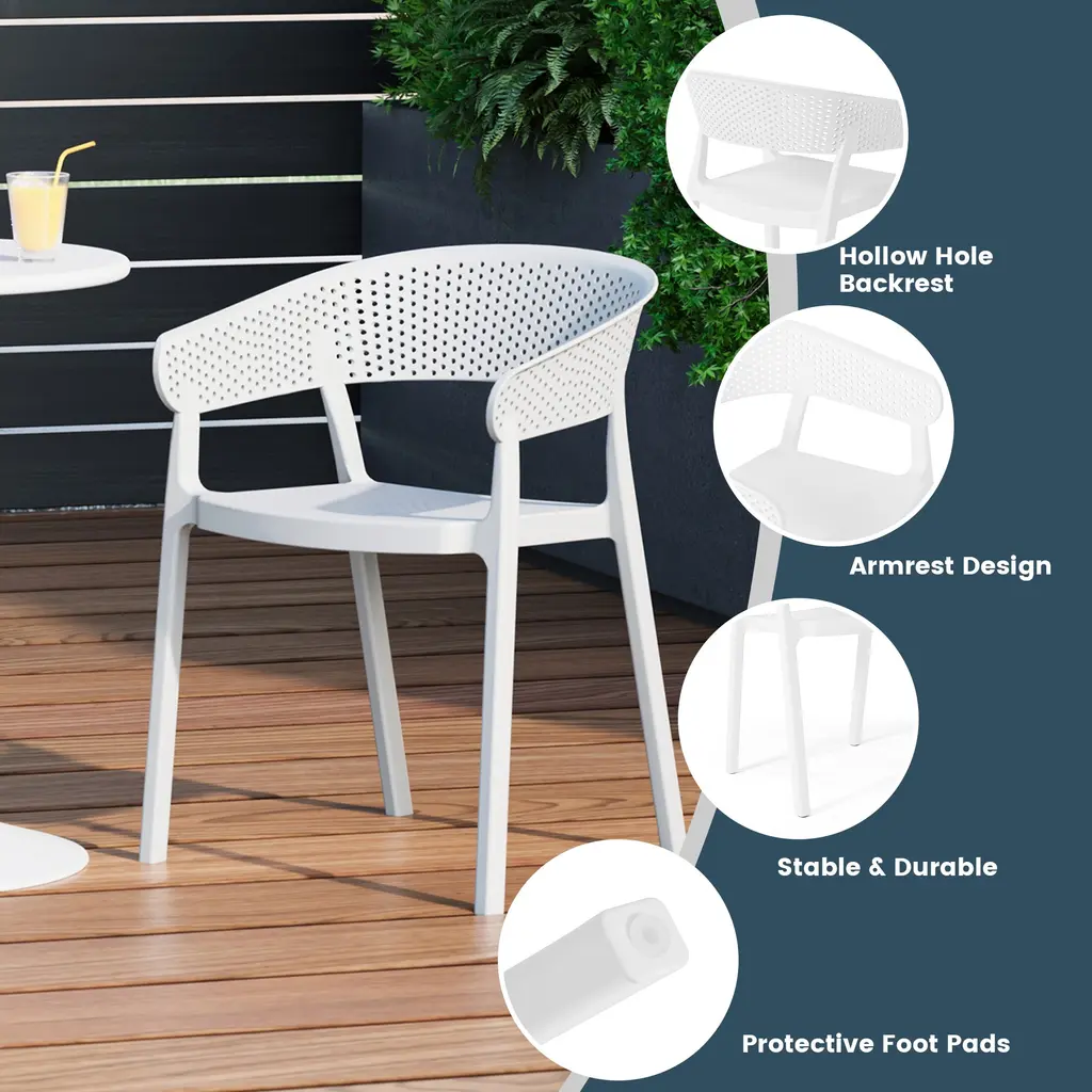 Elevate your space with the perfect balance of form and function. This set of two outdoor round arm chairs are perfect for soaking up the sun. With sturdy legs and barrel chair backrest design, the chair set is stackable and easy to take. Ideal for laid-back gatherings, this chair set definitely transforms any backyard space into a gorgeous masterpiece. Crafted from UV-resistant polypropylene resin, low maintenance needed and no assembly needed.While we strive to accurately represent product colors, please be aware that actual colors may vary slightly due to individual screen settings and lighting conditions. FeaturesDetails:Dining Chair