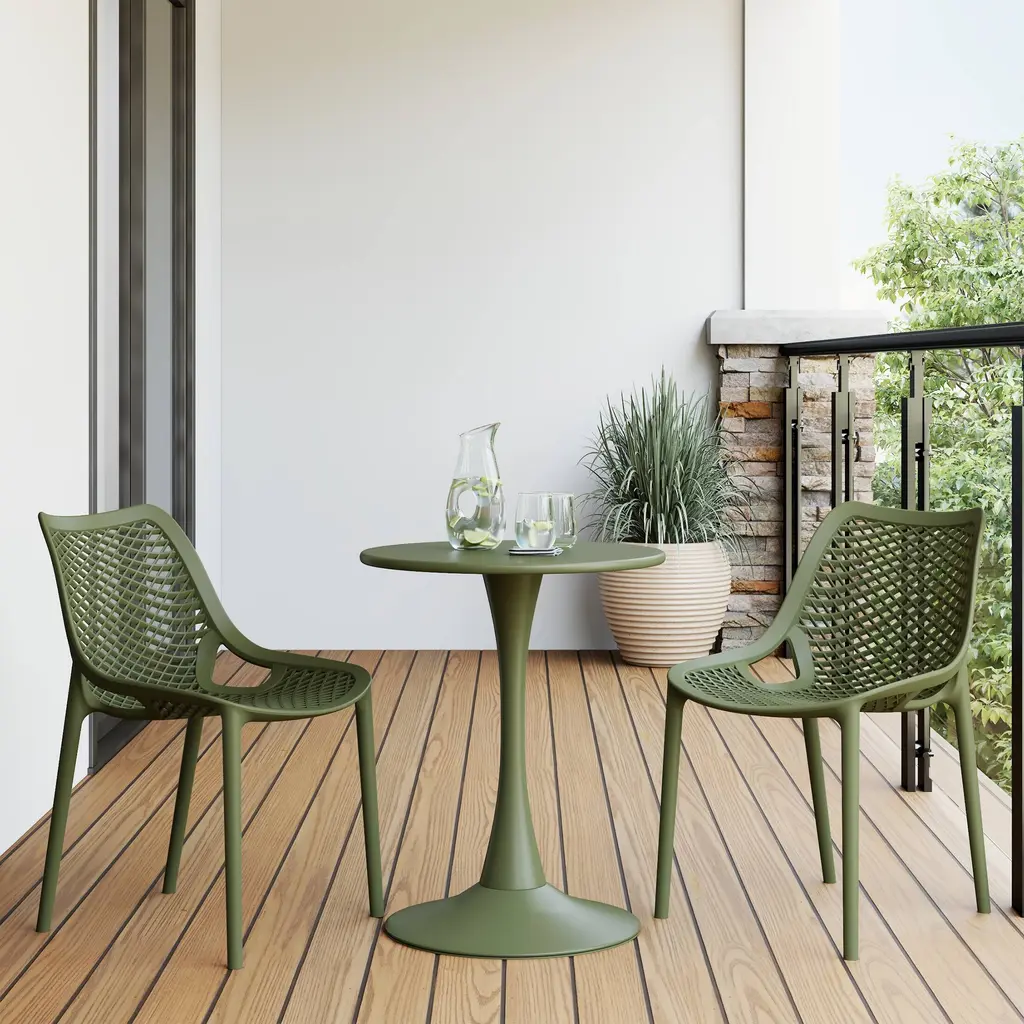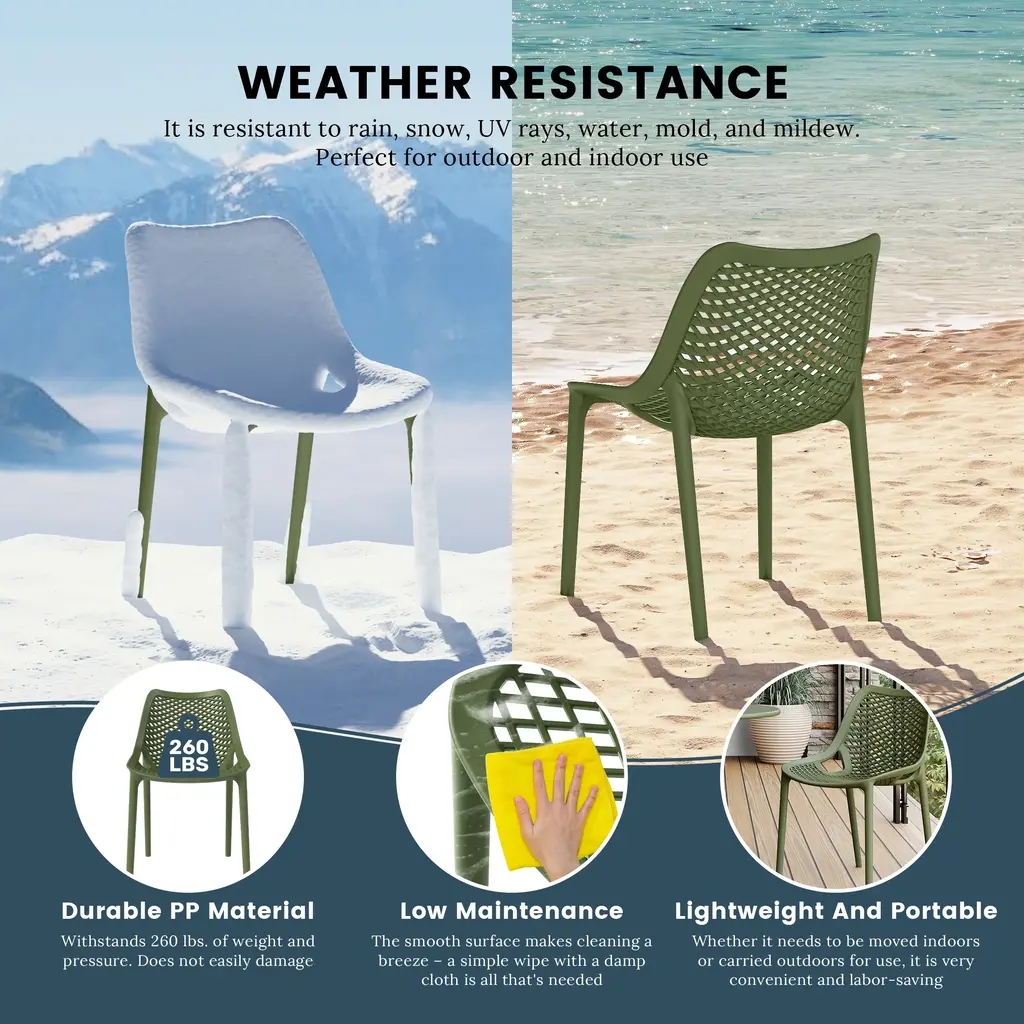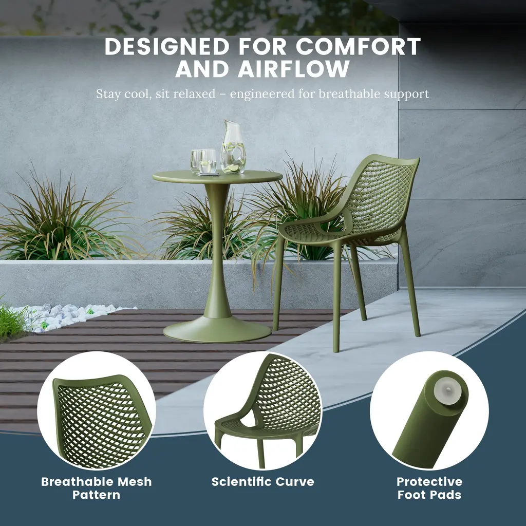 Add an inviting and relaxing touch to your outdoor patio or balcony with our attractive set of two modern outdoor dining chairs. Crafted from durable, all-weather polypropylene (PP) resin, able to withstand the elements while retaining their vibrant color year-round thanks to their UV and fade-resistant properties. Lightweight and simple to move, they are perfect for creating a flexible dining area on even the smallest balconies or patios. Stackable for easy storage and designed with a comfortable mesh back for enhanced comfortWhile we strive to accurately represent product colors, please be aware that actual colors may vary slightly due to individual screen settings and lighting conditions. FeaturesDetails:Dining Chair