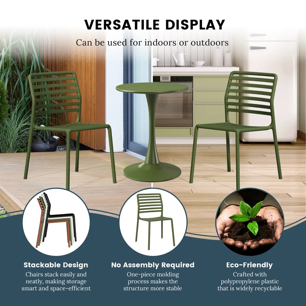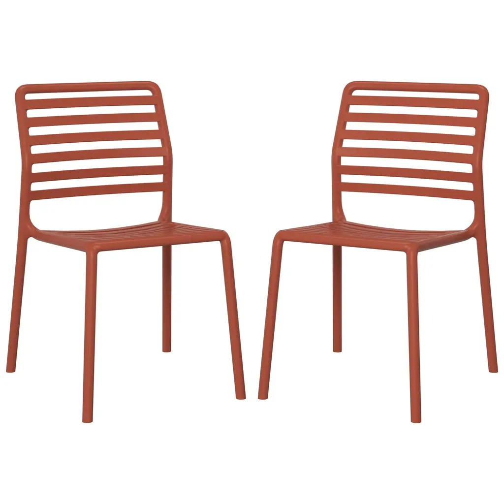 Appealing style that is sure to give your balcony or outdoor terrace some added charm with this set of two charming outdoor dining chairs. Crafted from durable, all-weather PP resin, prepared to withstand the elements while retaining their vibrant color year-round thanks to their UV and fade-resistant properties. Lightweight and simple to move, they are perfect for creating a flexible dining area on even the smallest balconies or patios. Designed with comfort in mind, a ventilated backrest keeps you cool on warm summer evenings. And when not in use, they stack neatly for easy storage.While we strive to accurately represent product colors, please be aware that actual colors may vary slightly due to individual screen settings and lighting conditions. FeaturesDetails:Dining Chair