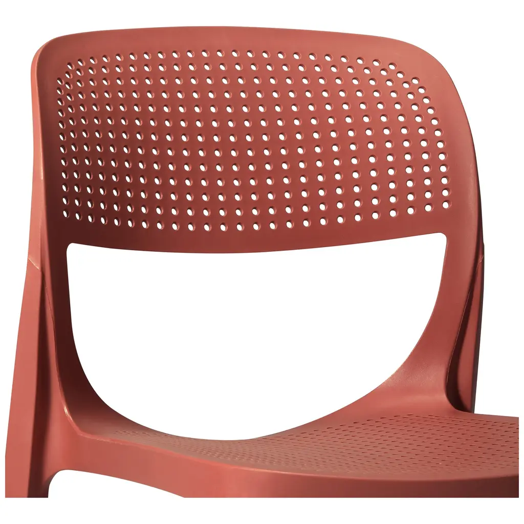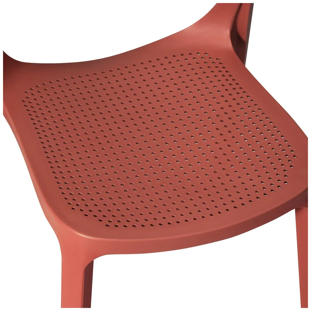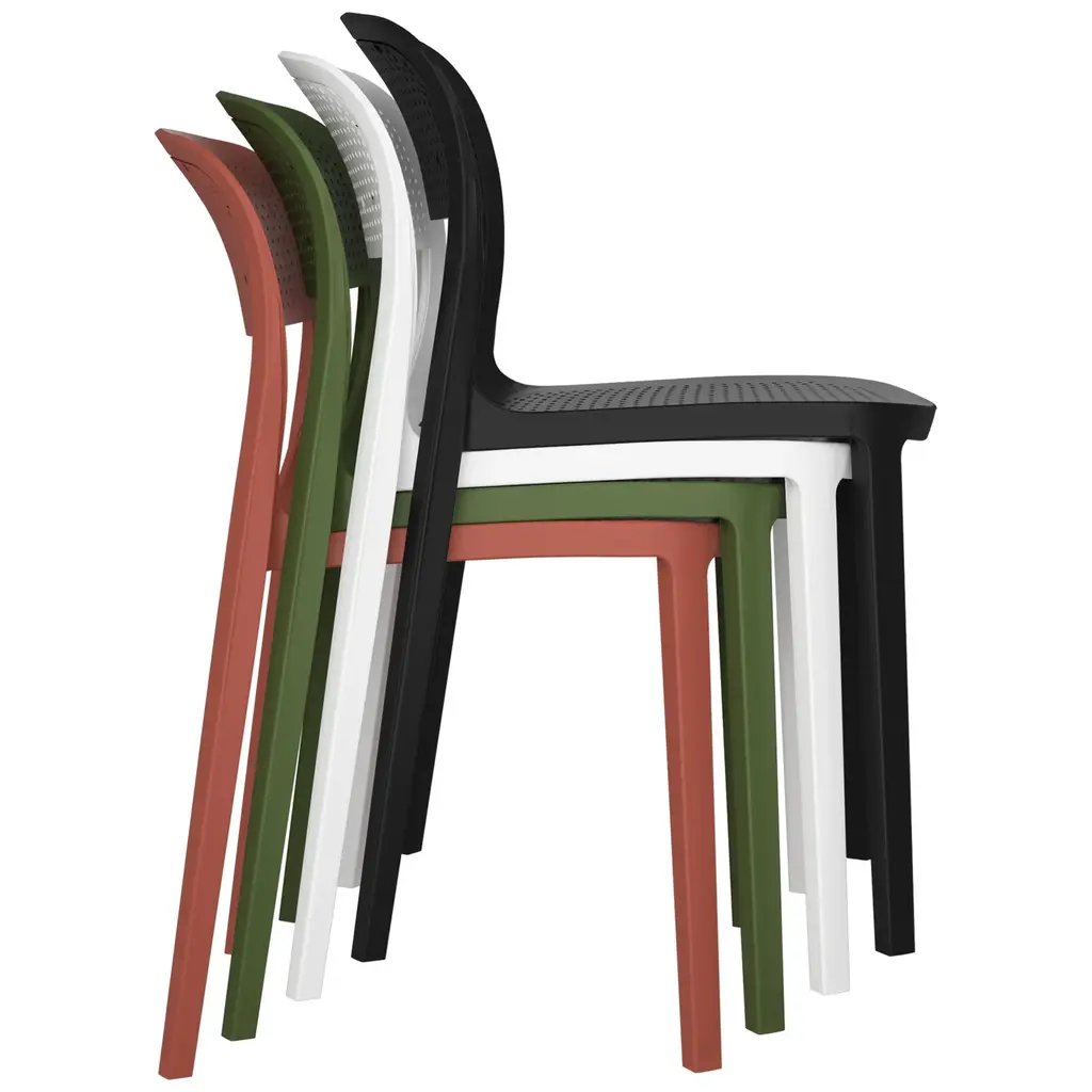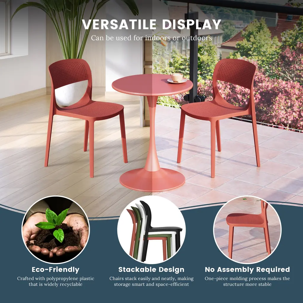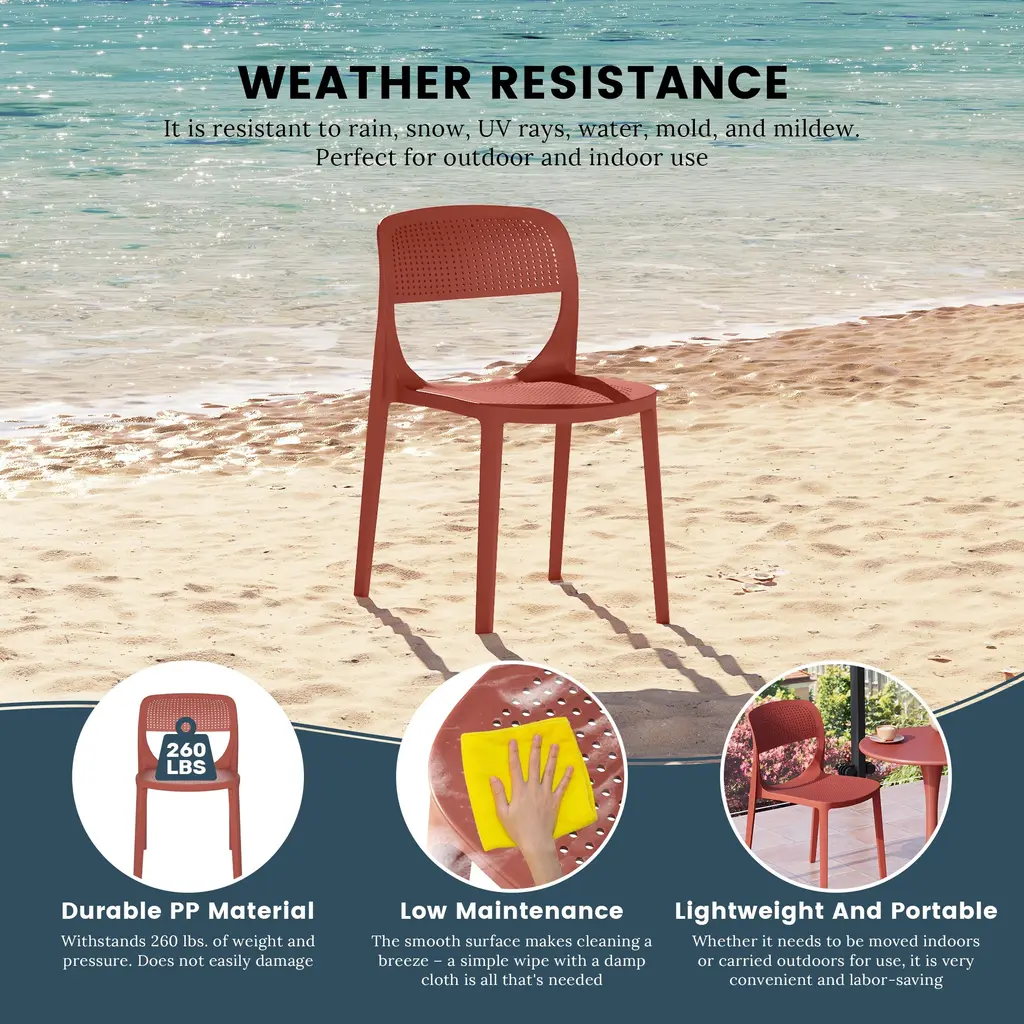 Sit down and grab a drink with a friend on these mesmerizing and refreshing stackable patio dining side chairs. Crafted from a durable all-weather PP resin material that is perfect for the outdoors, these chairs feature UV and fade-resistant properties that ensure vibrant color stays year-round. Lightweight and easy to move, they are perfect for those with small balconies or patios. Designed for comfort, featuring a smooth armrest, perforated backrest and seat that allow fresh air to flow through and keep you cool during those warmer days combined with the curved backrest that adds extra comfort, and a stackable dining side chair design to save storage space. The chairs also are equipped with protective rubber foot pads to keep your floors and chairs protected and splayed back legs that help add stability. Make this the perfect outdoor resin polypropylene dining side chairs with needing no assembly and ready right out the box to set up your dining area with ease.While we strive to accurately represent product colors, please be aware that actual colors may vary slightly due to individual screen settings and lighting conditions. FeaturesDetails:Dining Chair