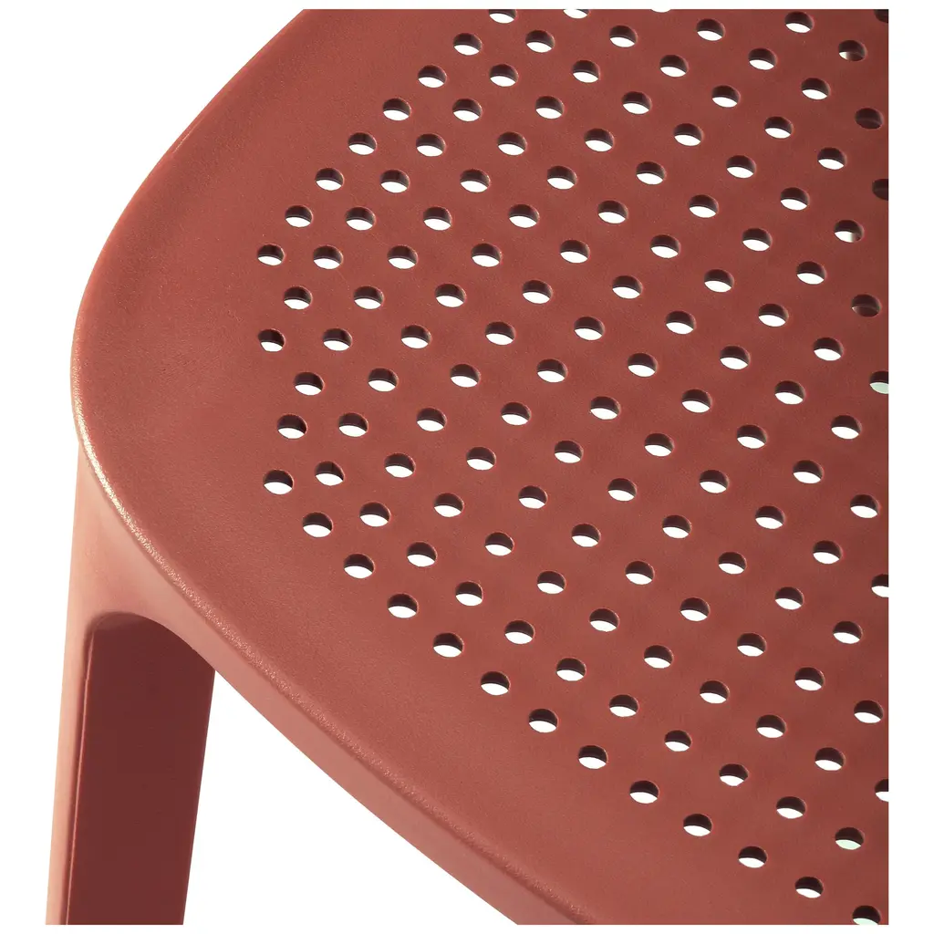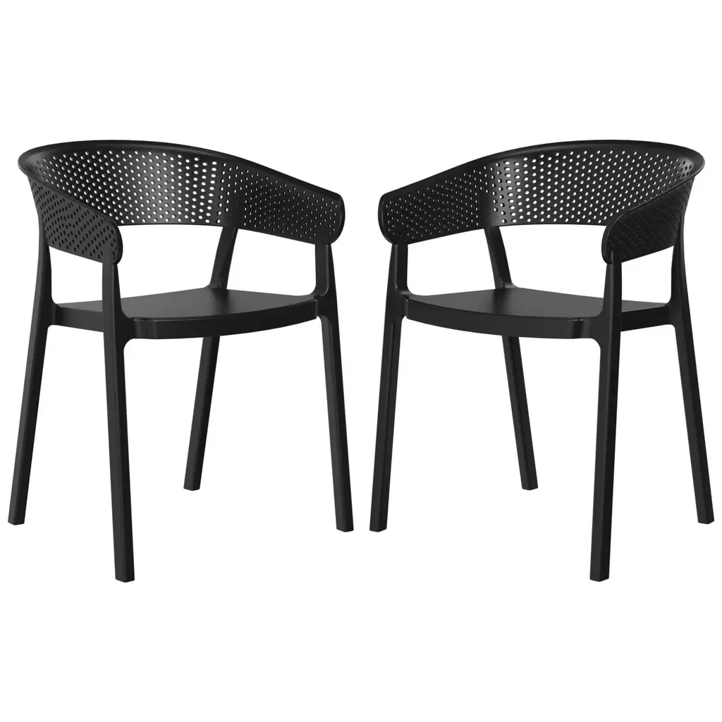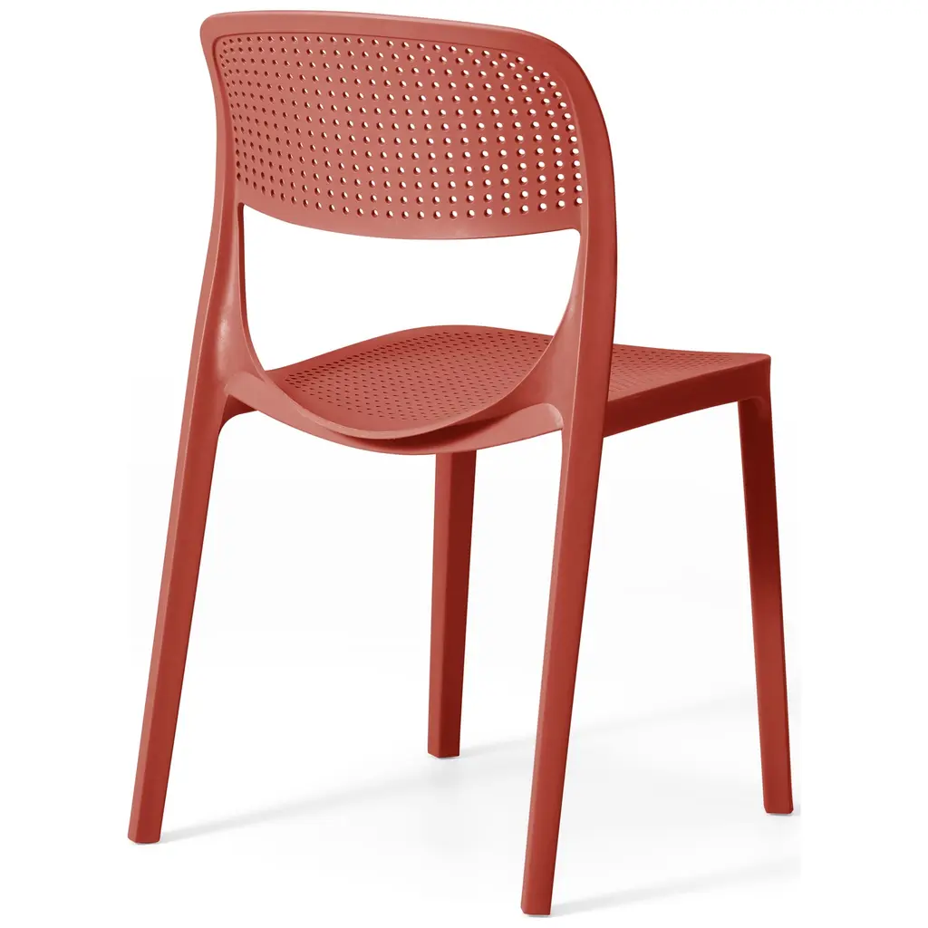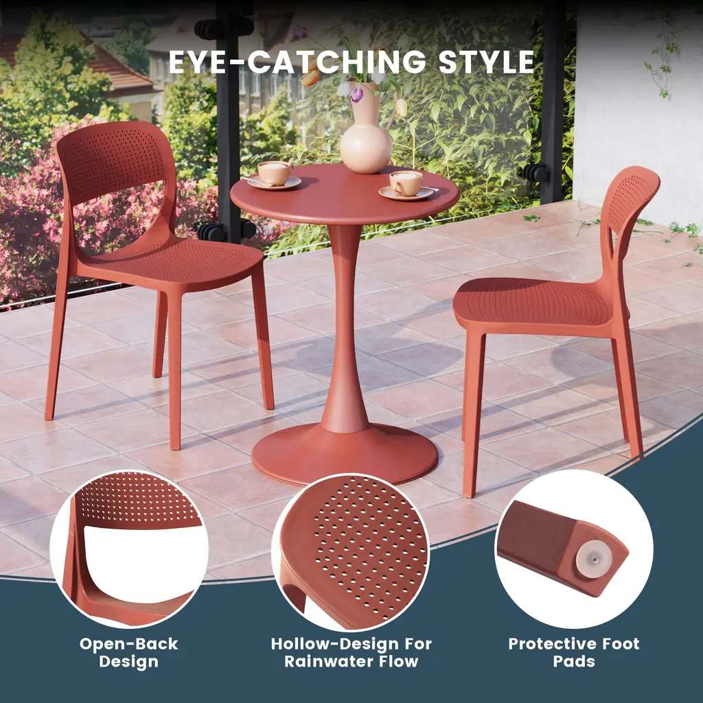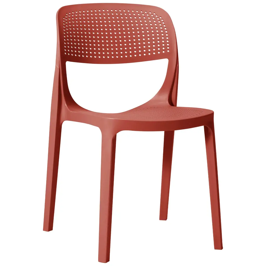 Sit down and grab a drink with a friend on these mesmerizing and refreshing stackable patio dining side chairs. Crafted from a durable all-weather PP resin material that is perfect for the outdoors, these chairs feature UV and fade-resistant properties that ensure vibrant color stays year-round. Lightweight and easy to move, they are perfect for those with small balconies or patios. Designed for comfort, featuring a smooth armrest, perforated backrest and seat that allow fresh air to flow through and keep you cool during those warmer days combined with the curved backrest that adds extra comfort, and a stackable dining side chair design to save storage space. The chairs also are equipped with protective rubber foot pads to keep your floors and chairs protected and splayed back legs that help add stability. Make this the perfect outdoor resin polypropylene dining side chairs with needing no assembly and ready right out the box to set up your dining area with ease.While we strive to accurately represent product colors, please be aware that actual colors may vary slightly due to individual screen settings and lighting conditions. FeaturesDetails:Dining Chair