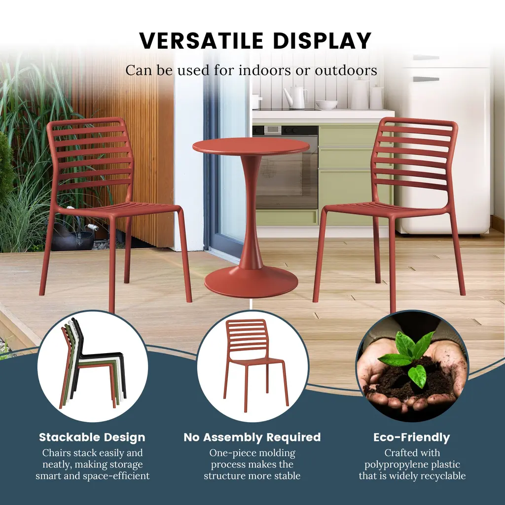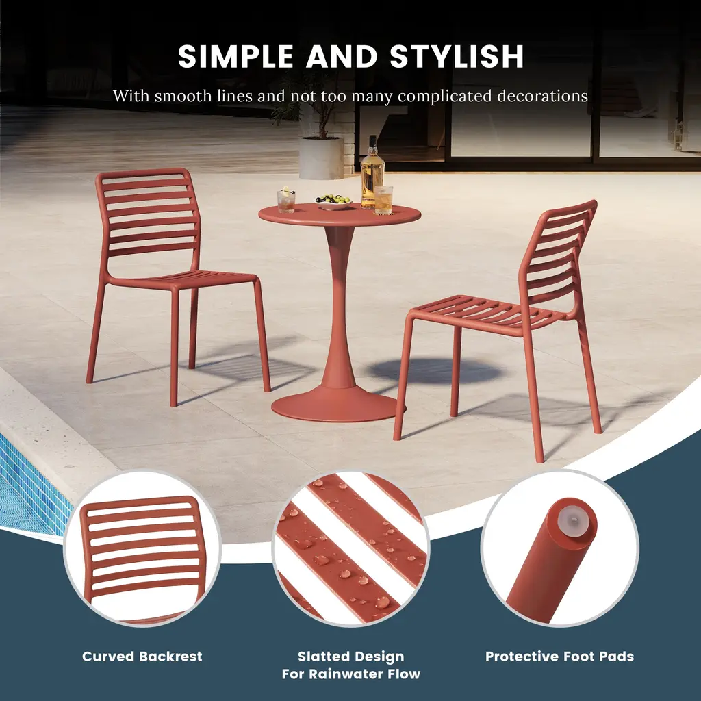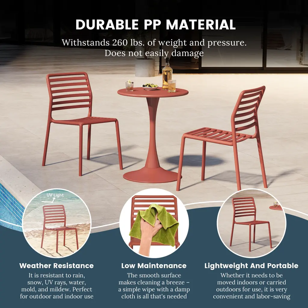 Appealing style that is sure to give your balcony or outdoor terrace some added charm with this set of two charming outdoor dining chairs. Crafted from durable, all-weather PP resin, prepared to withstand the elements while retaining their vibrant color year-round thanks to their UV and fade-resistant properties. Lightweight and simple to move, they are perfect for creating a flexible dining area on even the smallest balconies or patios. Designed with comfort in mind, a ventilated backrest keeps you cool on warm summer evenings. And when not in use, they stack neatly for easy storage.While we strive to accurately represent product colors, please be aware that actual colors may vary slightly due to individual screen settings and lighting conditions. FeaturesDetails:Dining Chair