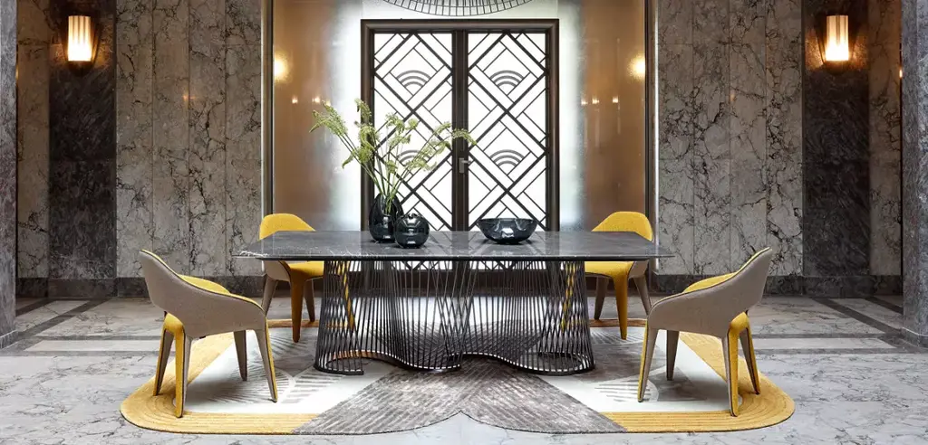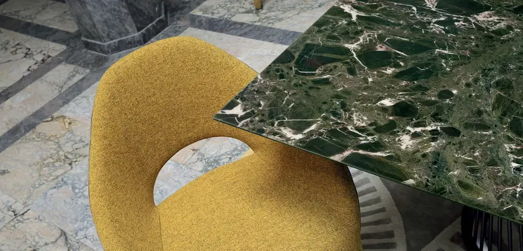 The interior and exterior surfaces of this dining armchair intersect around each other. The result is a beautiful piece that is also very functional.