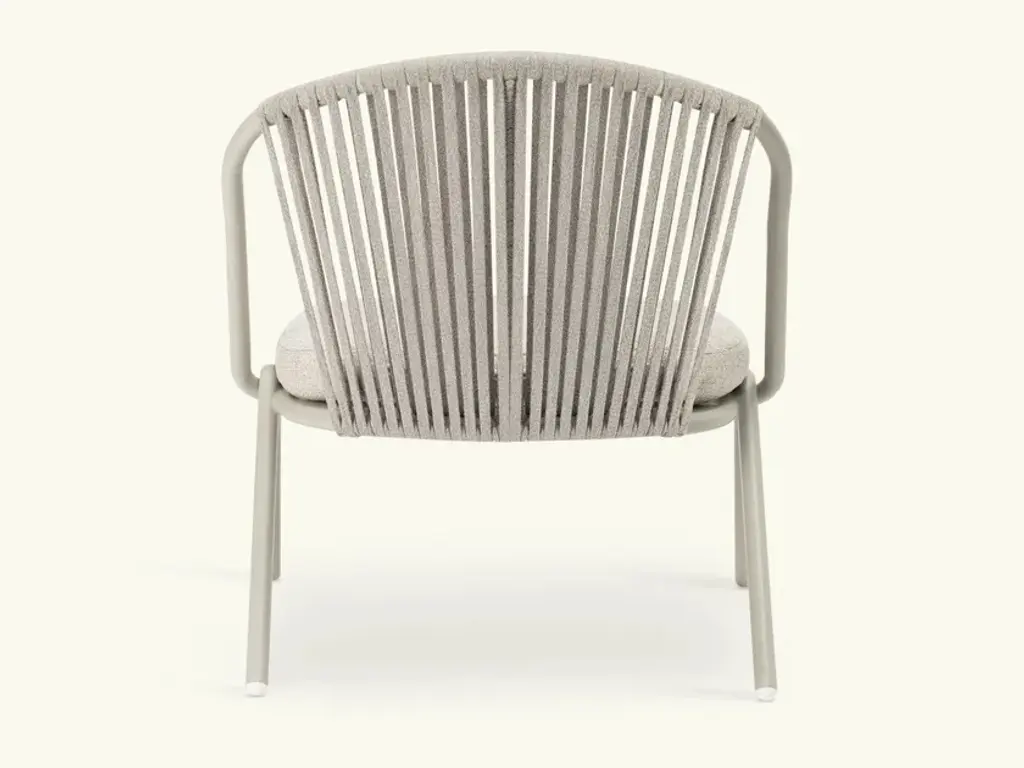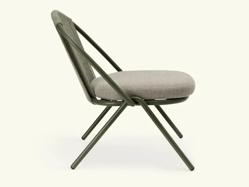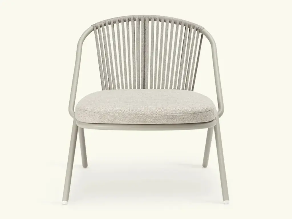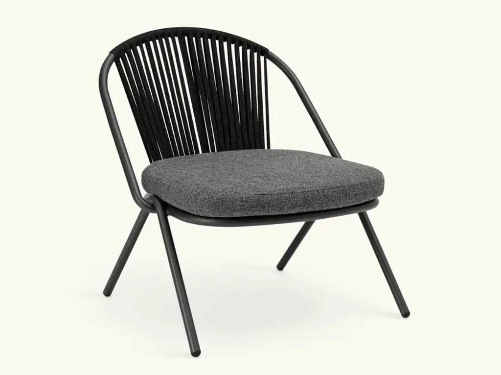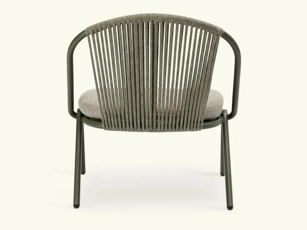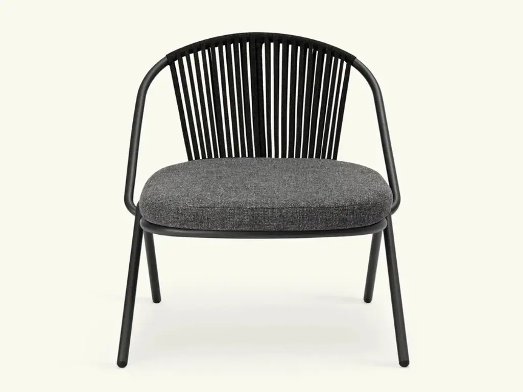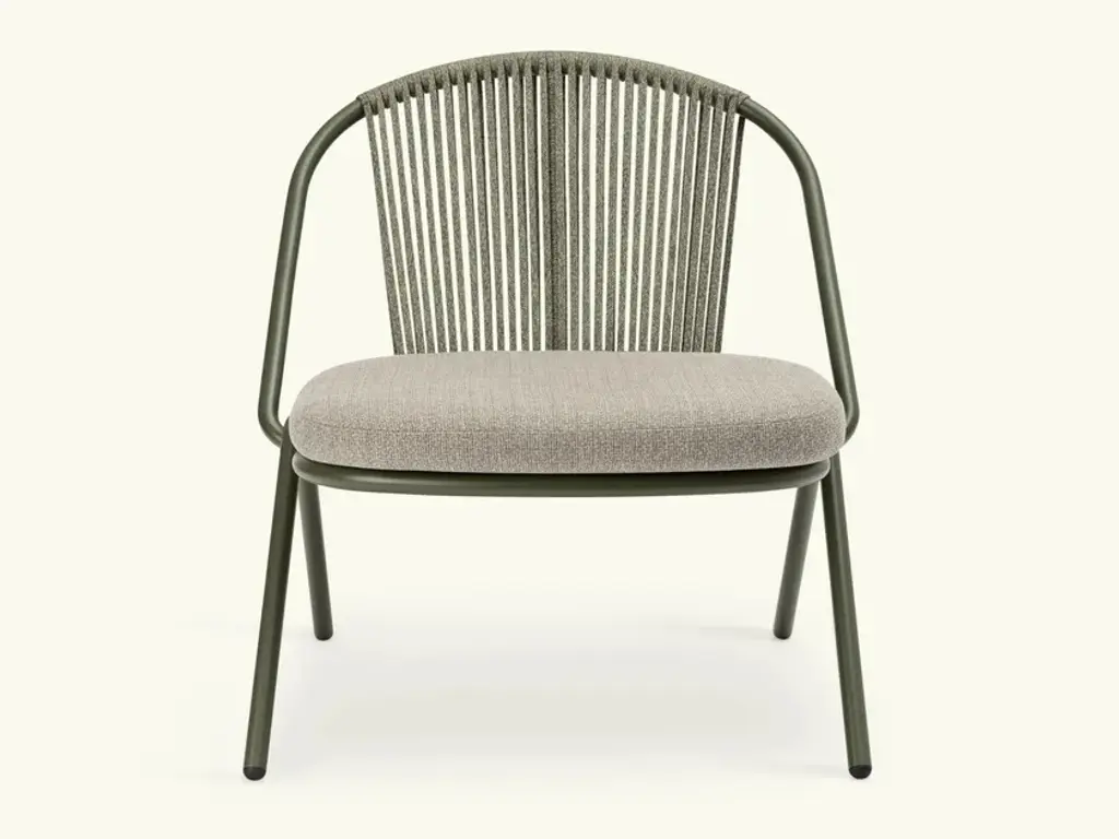 Fune is a vertically stackable lounge chair with four legs, in painted aluminum with a padded permeable cushion as a seat and woven backrest. Available with additional cushion as lumbar support.Colors:6000106 - Fune anthracite lounge chair6000107 - Fune grey lounge chair6000108 - Fune green lounge chairFrom the aluminum frame to the fabric backrest: the Fune collection plays with weaving to its fullest expression.Fune is developed for both dining and lounge areas, declined in two sizes with different sizes and designs, both of which can be combined with the series of coffee tables. The structure is made of painted aluminum tubes: solid and at the same time extremely light. The cushions are padded and drained to provide even more satisfying comfort.The shades evoke the warmth of the earth. The aluminum frame is paired tone-on-tone with fabrics and webbing.