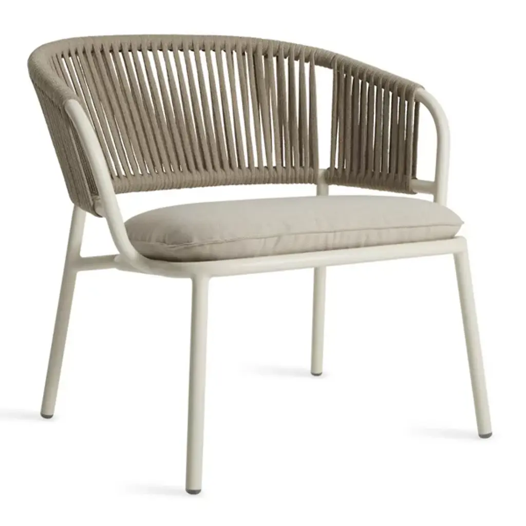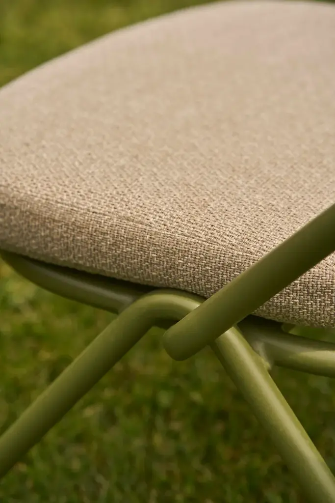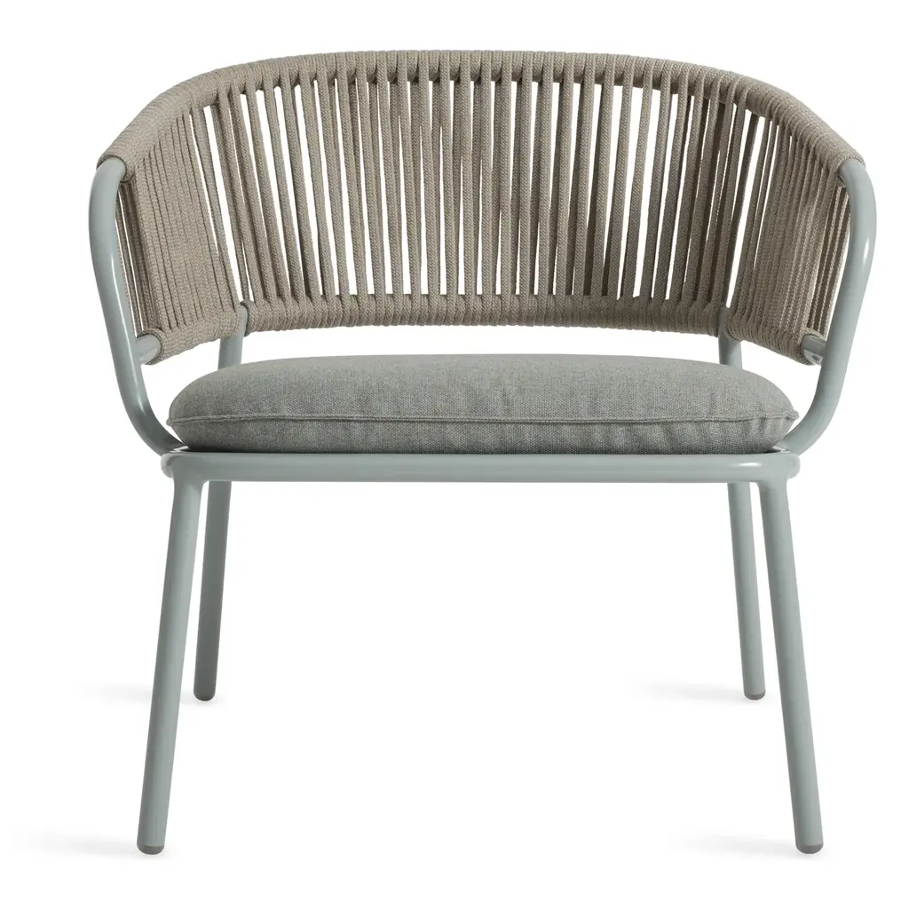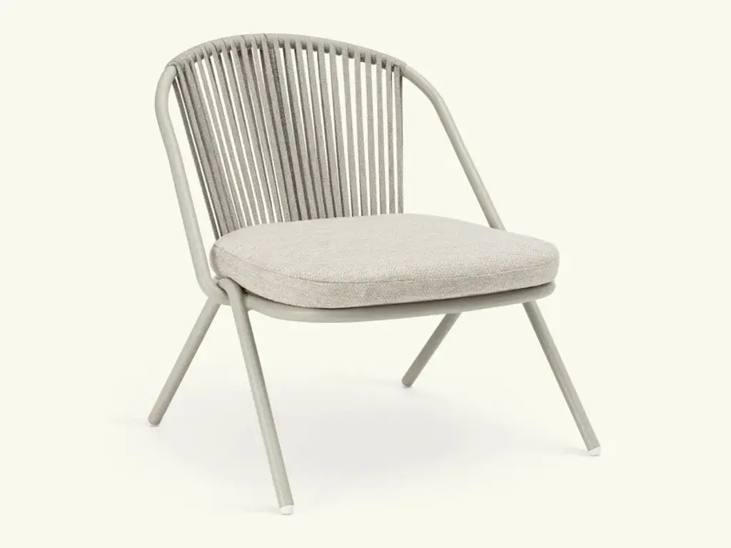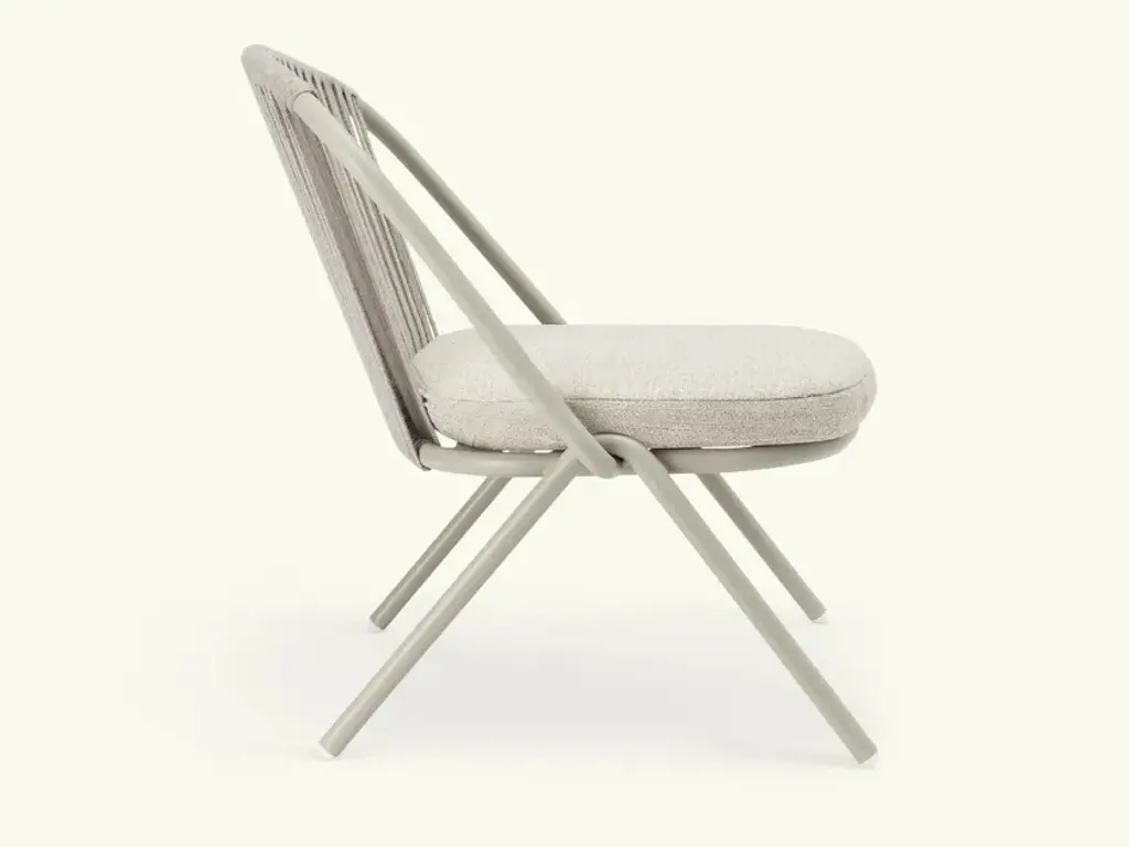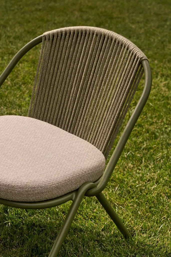 Fune is a vertically stackable lounge chair with four legs, in painted aluminum with a padded permeable cushion as a seat and woven backrest. Available with additional cushion as lumbar support.Colors:6000106 - Fune anthracite lounge chair6000107 - Fune grey lounge chair6000108 - Fune green lounge chairFrom the aluminum frame to the fabric backrest: the Fune collection plays with weaving to its fullest expression.Fune is developed for both dining and lounge areas, declined in two sizes with different sizes and designs, both of which can be combined with the series of coffee tables. The structure is made of painted aluminum tubes: solid and at the same time extremely light. The cushions are padded and drained to provide even more satisfying comfort.The shades evoke the warmth of the earth. The aluminum frame is paired tone-on-tone with fabrics and webbing.