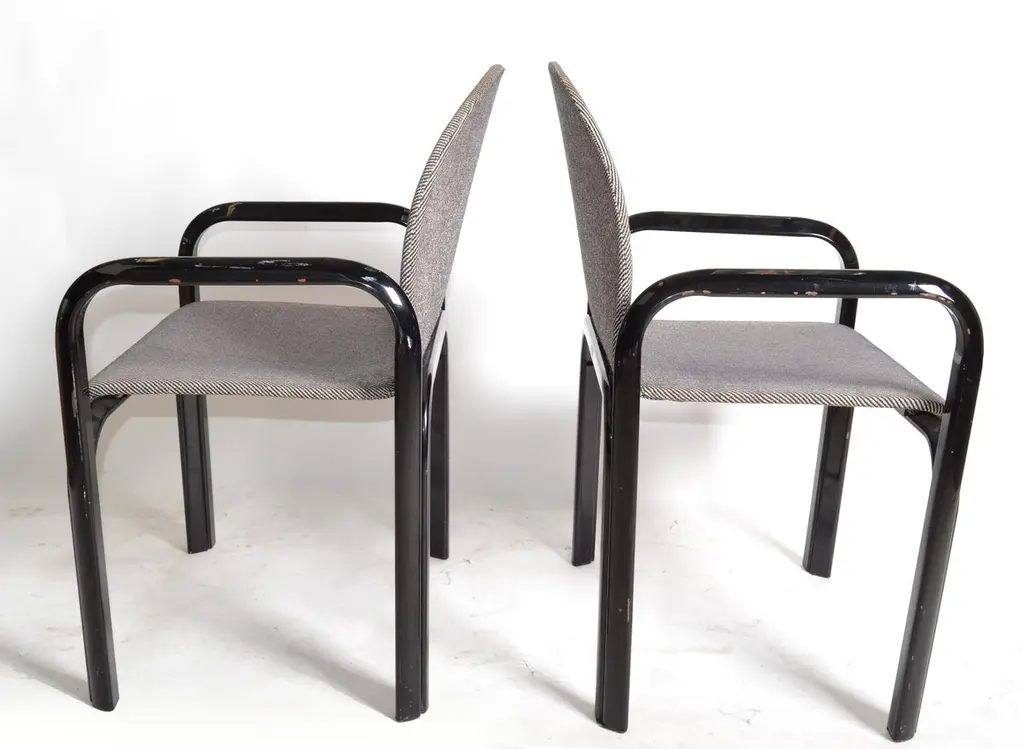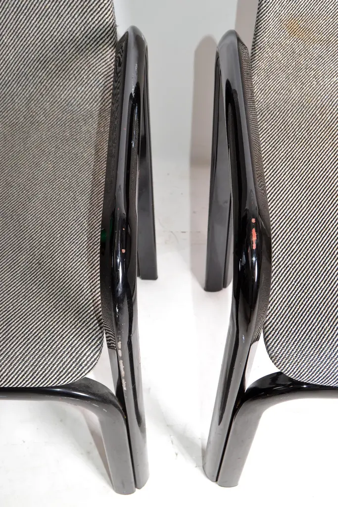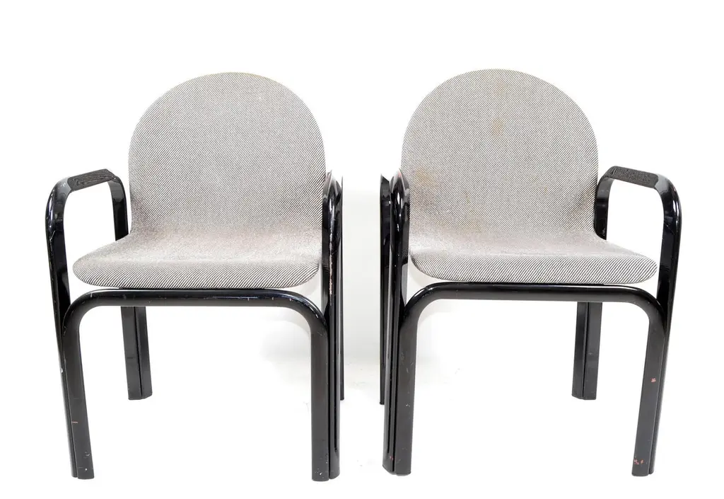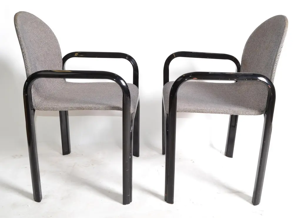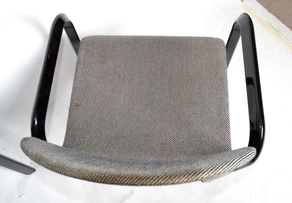 Pair of armchairs or conference chairs by Gae Aulenti for Knoll International. We have 5 sets available.The frames of the chairs are constructed by sculpted metal tubes, sinuous bent plywood seats with its original fabric upholstery.Knoll Mark and Knoll International Label underneath each seat.This set is great as Dining Chairs or useful in an office or conference room.Priced by pair.In good vintage condition with scuffs to the black finish and we recommend having the fabric renewed. It has lots of wear and tear.F-531-335