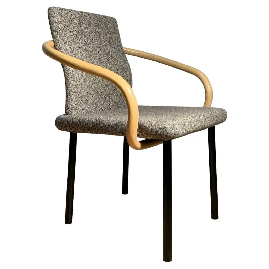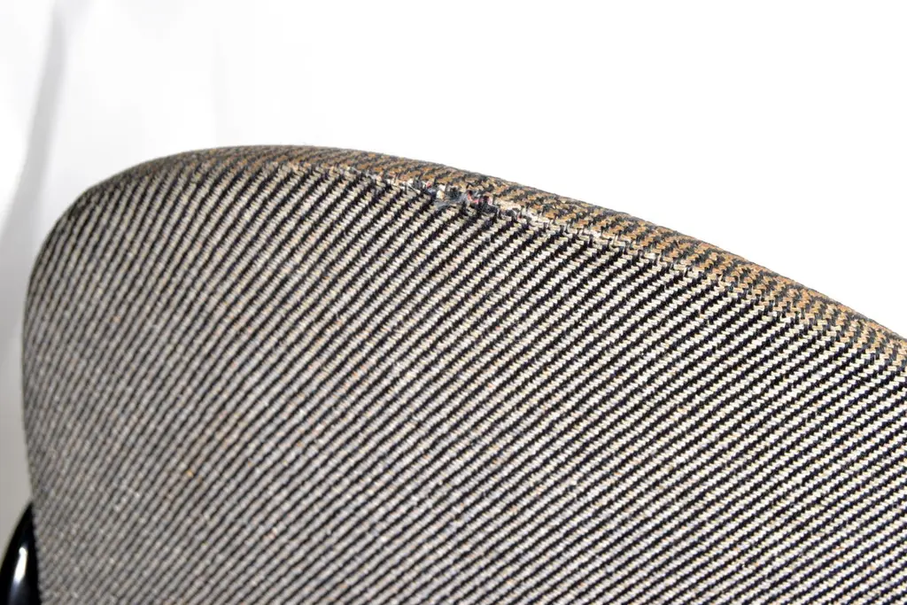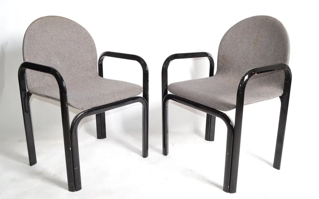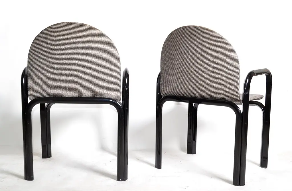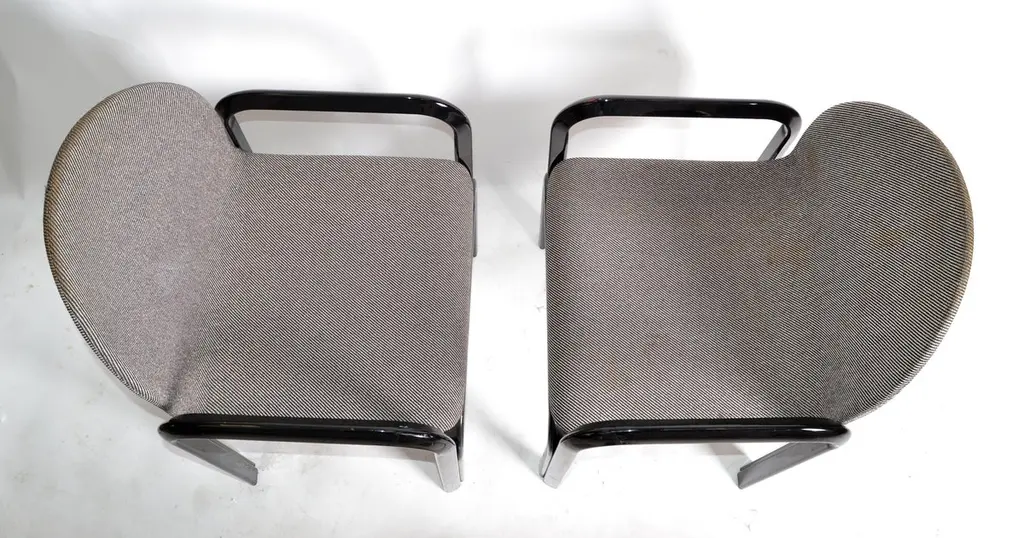 Pair of armchairs or conference chairs by Gae Aulenti for Knoll International. We have 5 sets available.The frames of the chairs are constructed by sculpted metal tubes, sinuous bent plywood seats with its original fabric upholstery.Knoll Mark and Knoll International Label underneath each seat.This set is great as Dining Chairs or useful in an office or conference room.Priced by pair.In good vintage condition with scuffs to the black finish and we recommend having the fabric renewed. It has lots of wear and tear.F-531-335