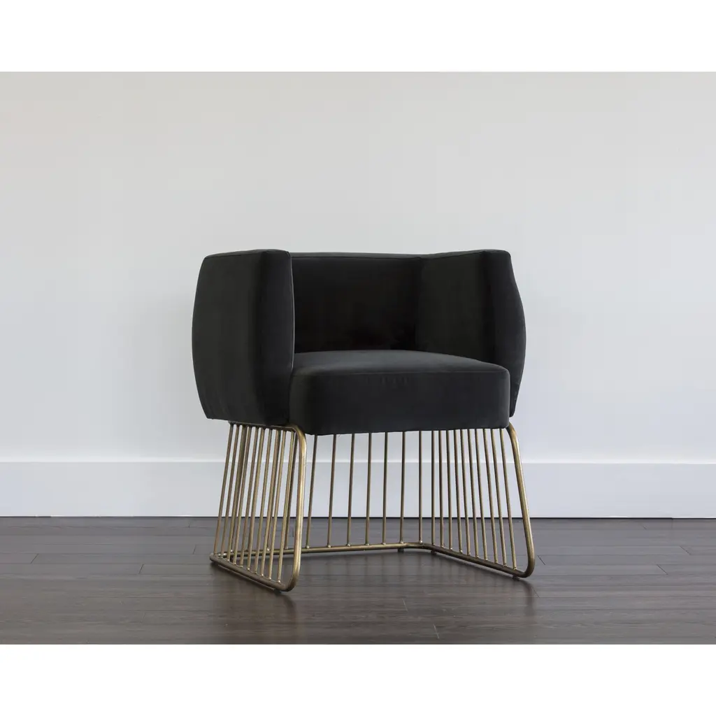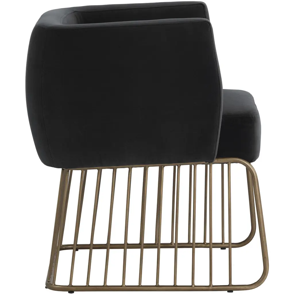 Rustic and modern charm come together in this dining chair. Stocked in our soft shadow grey fabric with a comfortable seat and unique brushed antique brass cage-style base. Perfect for dining, lounge and office spaces.