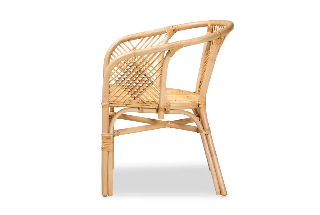 The Gamora Modern Natural Brown Rattan Dining Chair is a perfect blend of contemporary design and natural materials, making it an ideal addition to any dining space. Its sloping armrests and geometric accents add a touch of elegance, while the crisscross base ensures stability and style. Constructed from natural rattan, this chair offers both durability and a warm, earthy aesthetic.