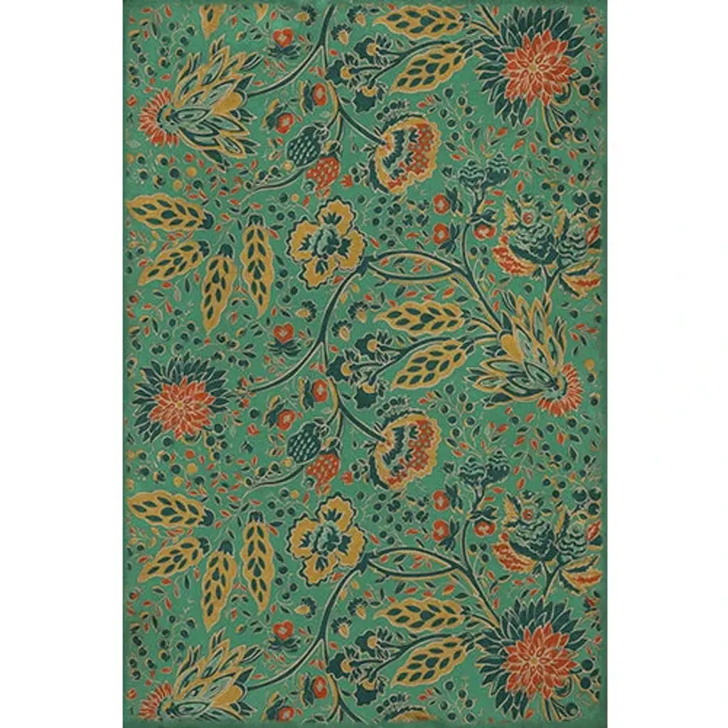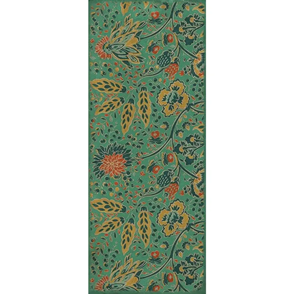 Mustard yellow with teal green florals on vinyl floor mats, suggest a nostalgic vibe. Inspired by old floor mats and vintage linoleum, these vibrant vinyl floor cloths offer warm colors with beautiful aged characteristic. Their worn appeal makes them great in kitchens and baths, while the smooth surface is perfect in an office where rolling chairs can glide. The cloths can be used in controlled outdoor settings such as a screened-in porch or covered lanai. These wonderful designs are printed on durable, certified non-slip, lay-flat vinyl. Due to their mastered printing process please expect some variation in hue and saturation. With a wide range of color combinations and sizes to choose from, enjoy picking your favorites to dress up your floor.