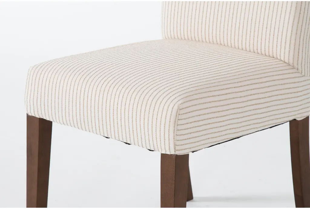 Enhance your dining area with the Garten Chino Fabric Armless With Back Dining Chair set. These chairs feature a traditional design that complements various dining room or kitchen styles. The dark walnut finish on the Malaysian hardwood legs provides a striking contrast to the beige fabric upholstery.