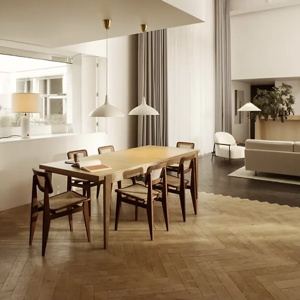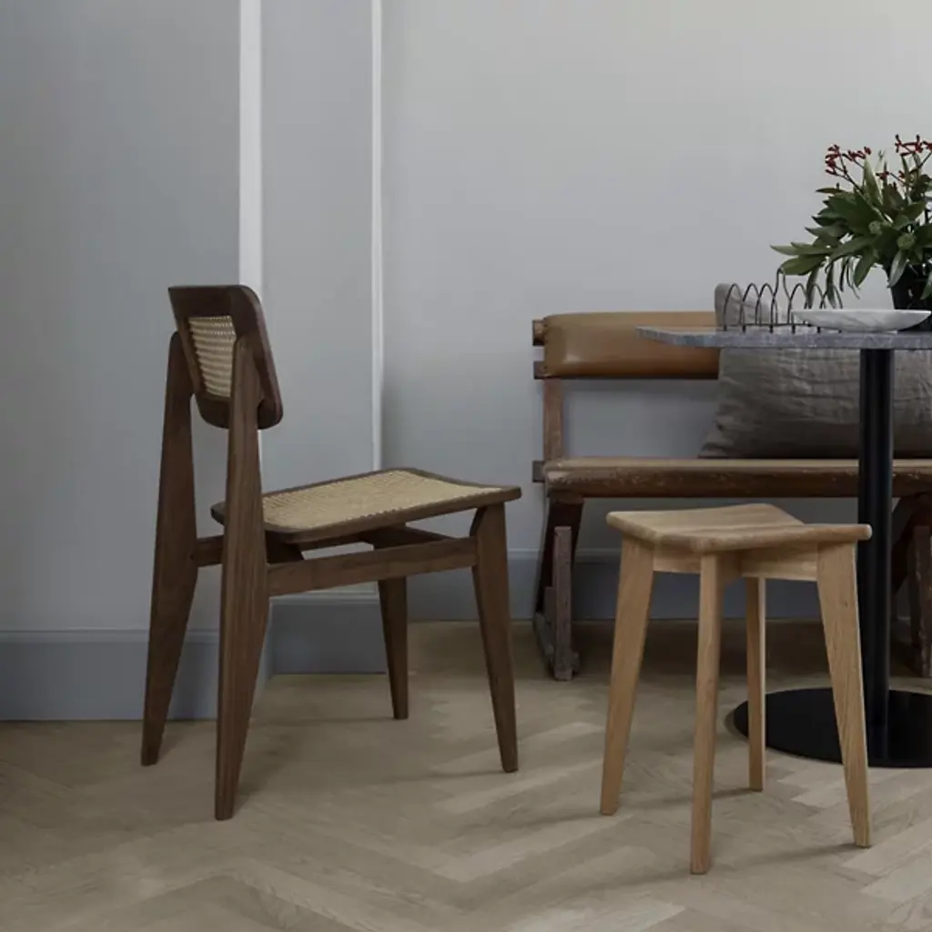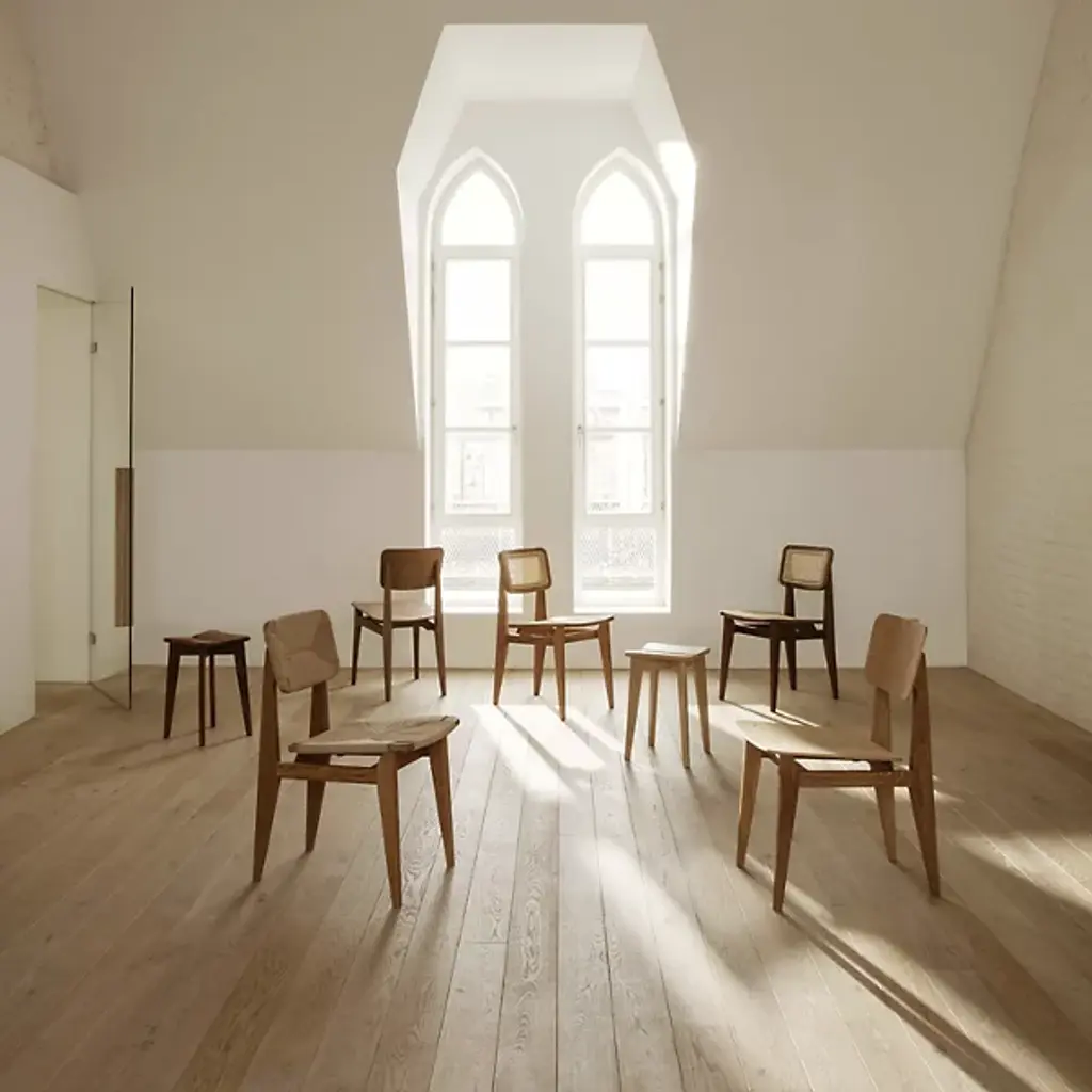 Marcel Gascoin conceived of the Gascoin C-Chair Dining Chair in post-war France, 1947. C-Chair came to be known as one of Gascoin’s most prolific designs, embodying not only the designer’s impactful practical aesthetic, but his clear social conscience during these years. Changing home sizes at the end of World War II necessitated a new furniture footprint and a simple, functional shape. C-Chair speaks to a sense of minimalism while displaying contrasting details of gentle cane, hand woven paper-cord, or veneer seats with solid, sculptural legs. The C-Chair explores craft, material, and utilization of space with an inviting sensibility.