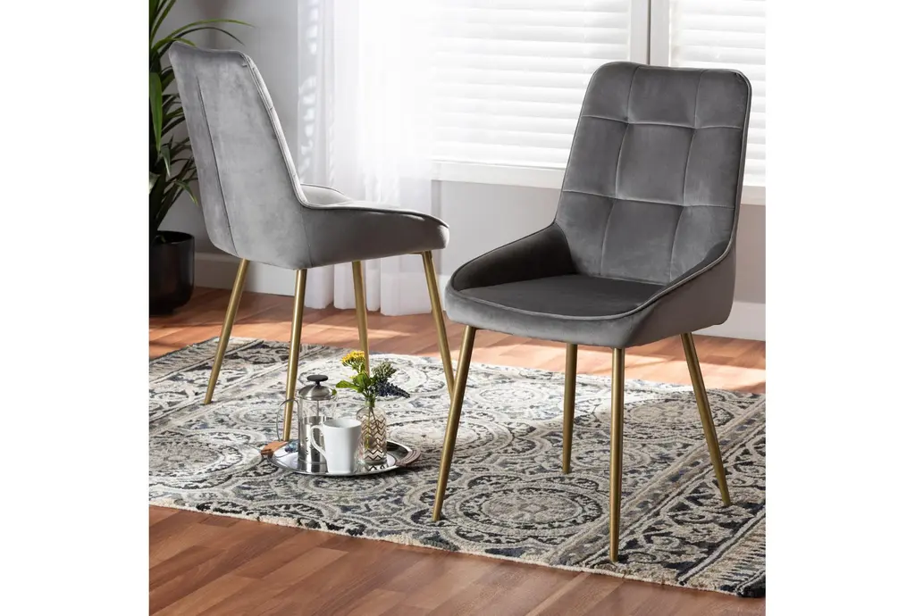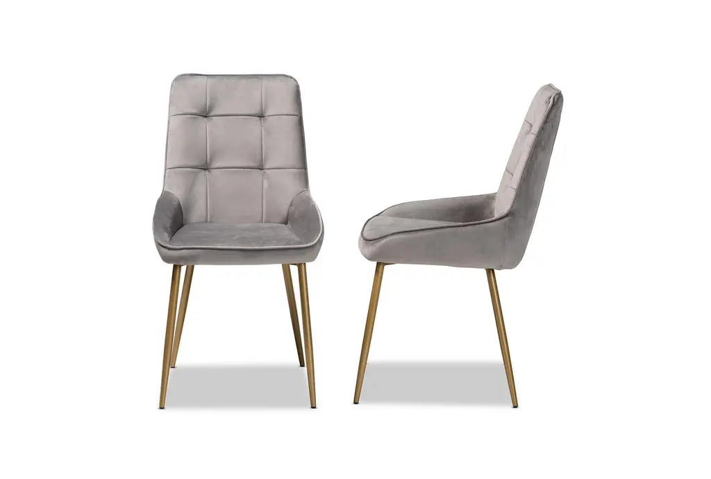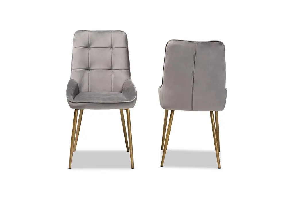 Introducing the Gavino Modern Grey Velvet Fabric Upholstered & Gold Metal Dining Chair Set Of 2. These armless chairs are designed in a mid-century modern style, perfect for adding a touch of sophistication to your dining room or kitchen. The grey velvet fabric upholstery is complemented by gold metal legs, creating a chic and contemporary look.