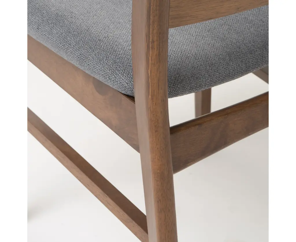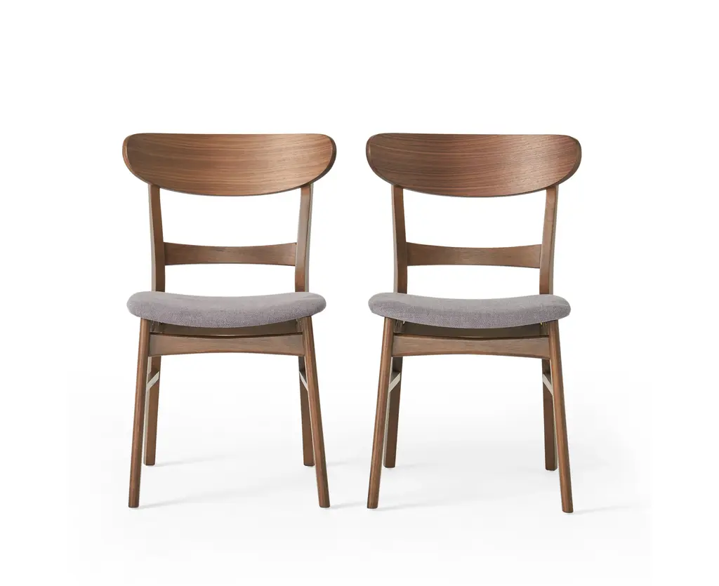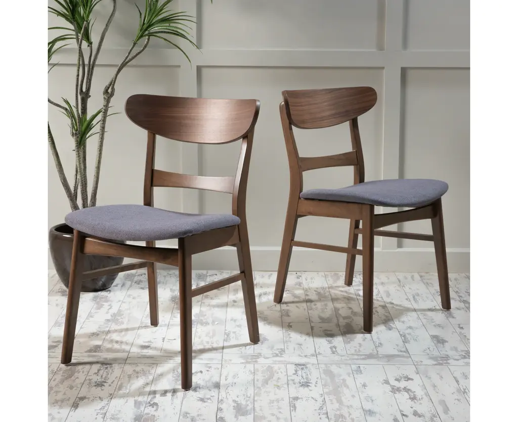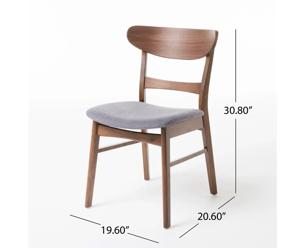 Mid-century modern design makes a stylish appearance in your dining room with these lovely dining chairs. These striking chairs feature soft, upholstered seats and beautifully-finished wood frames. Stunning curves and splayed legs bring even more intrigue and depth to the chic aesthetic. The combination of textures and colors adds dimension to any well-edited space. Fill your dining room with retro charm by pairing these bold and unique chairs with an equally charming dining table, a bold rug, and a coordinating sideboard.MID-CENTURY DESIGN: Blending together smooth upholstery with iconic splayed legs and a stunning wood frame, our chair set offers a mid-century look to your lounge space. With its clean lines and understated look, this set uses new materials to reimagine a traditional design.RUBBERWOOD LEGS: Our environmentally-friendly wood not only offers plenty of durability, but it also gives this piece a beautiful natural-grain look. Combined with a gorgeous finish, this wood will truly stand out in any room.UPHOLSTERED: Our chairs are generously upholstered, giving any room a refined appearance. This provides a smooth, immaculate texture for this piece as well as comfortable seating.DIMENSIONS: Choose an accessory that is the perfect size for you and your furniture. Each chair is 19.60" W x 20.60" D x 30.80" H. You will love how much your space can transform with the simple addition of this charming chair set.ASSEMBLY REQUIRED: Some assembly is required for this chair set. All of the instructions and tools needed for assembly are included. This comes as a set of two. Please note that chairs are not for commercial use.Includes: Two (2) Dining ChairsMaterial: RubberwoodSeat Material: FabricMultiple Color OptionsAssembly RequiredDimensions: 20.60 inches deep x 19.60 inches wide x 30.80 inches highSeat Dimensions: 17.60 inches deep x 16.60 inches wide x 18.00 inches high