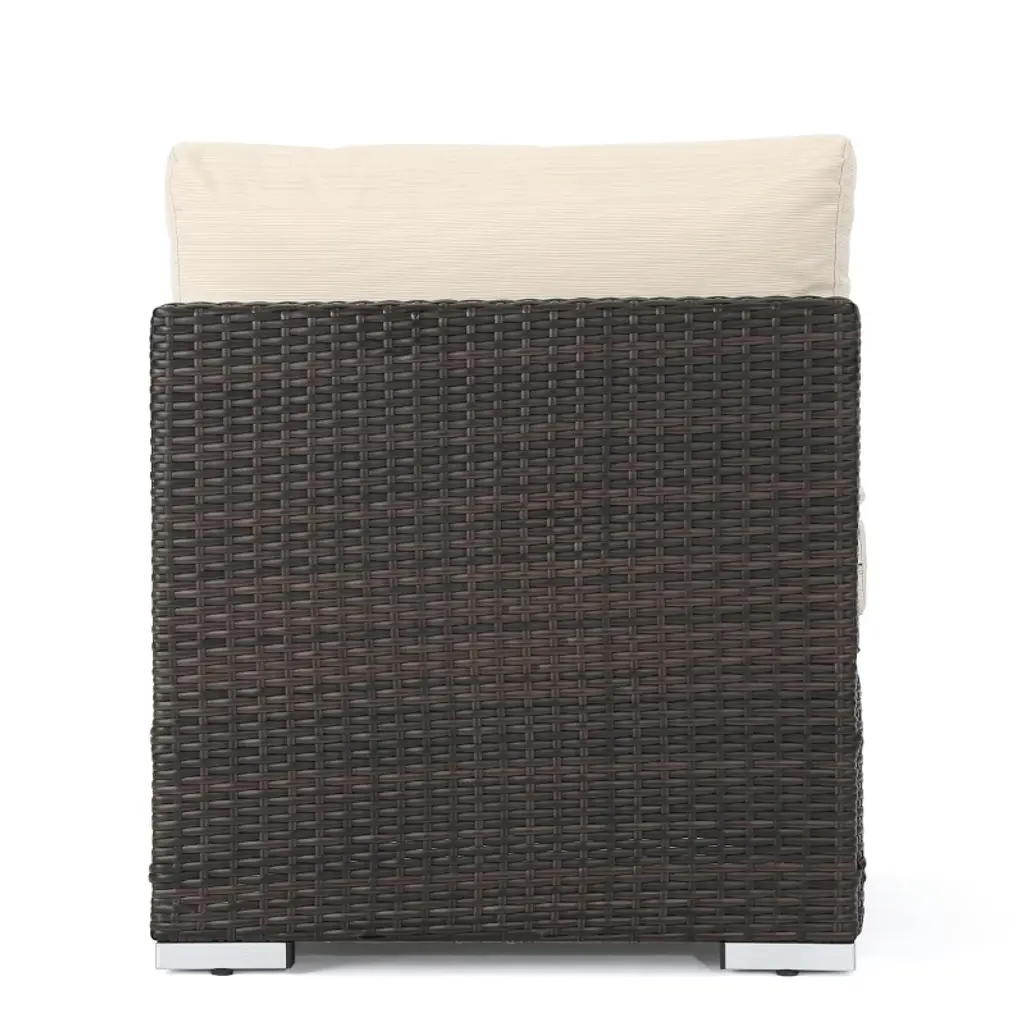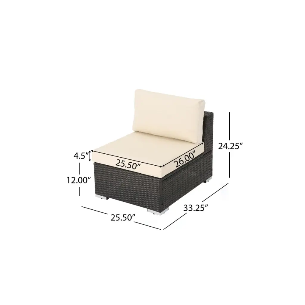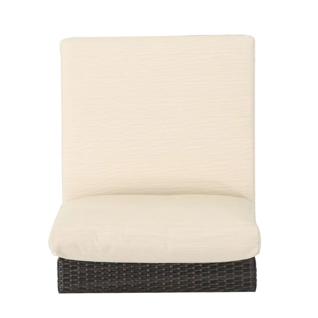 Upgrade your outdoor sectional with the Armless Chair. Designed with premium rattan, a sturdy aluminum frame, and plush water-resistant cushions, this chair adds style and comfort to any patio setup. Its versatile, armless design allows for easy expansion of your seating area. With multiple color options and a 400 lb weight capacity, it's built for lasting durability and all-season relaxation. Assembly required. Includes removable cushion for easy cleaning. Includes:One (1) Armless Chairs Material:Rattan Cushion Material: Water Resistant Fabric Fabric Composistion: 100% Polyester Frame Material: Iron Dimensions: 33.25 inches deep x 25.50 inches wide x 24.25 inches high Seat Dimensions: 26.00 inches deep x 25.50 inches wide x 12.00 inches high Seat Cushion Thickness: 4.50 inches No Assembly Required