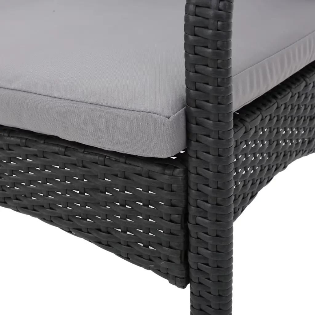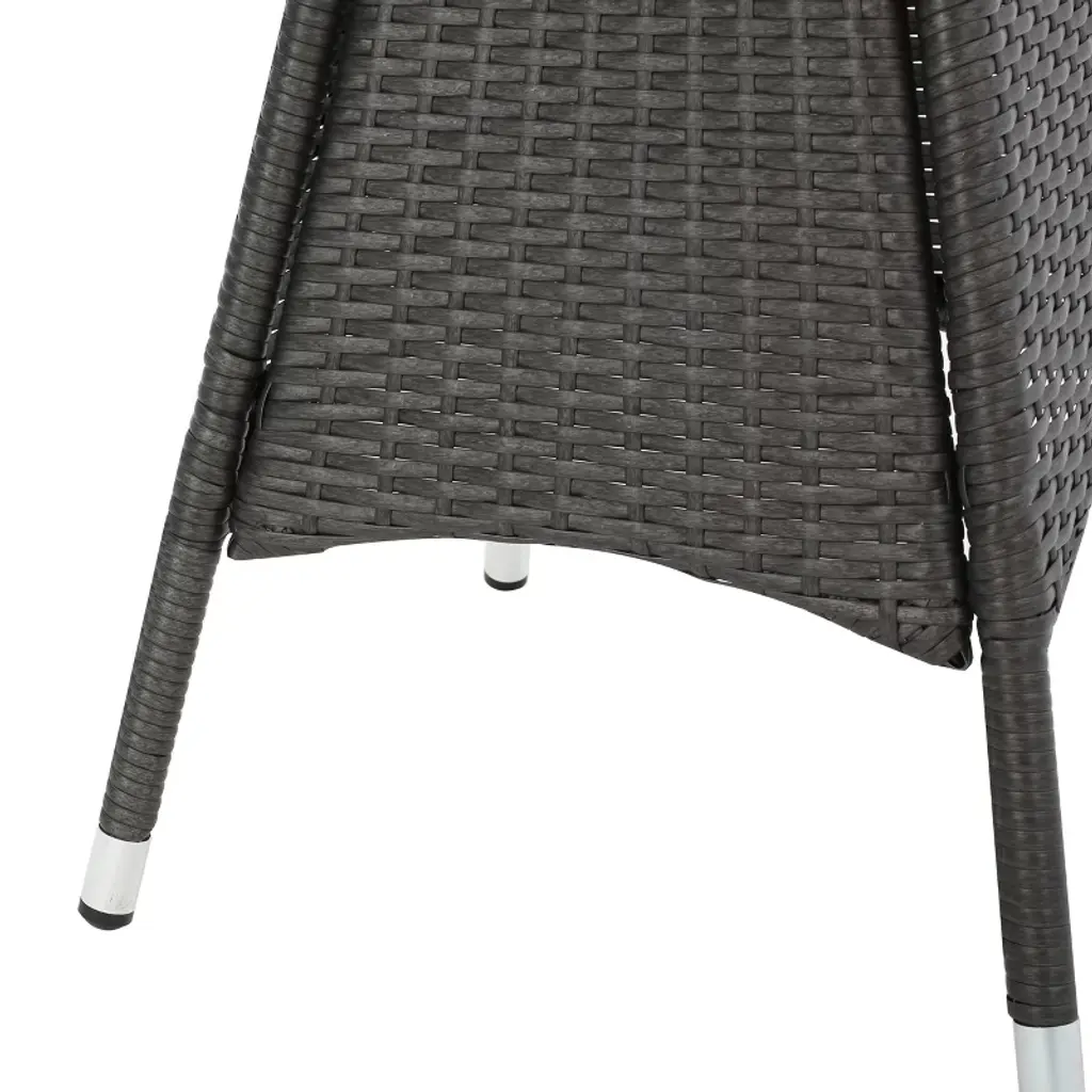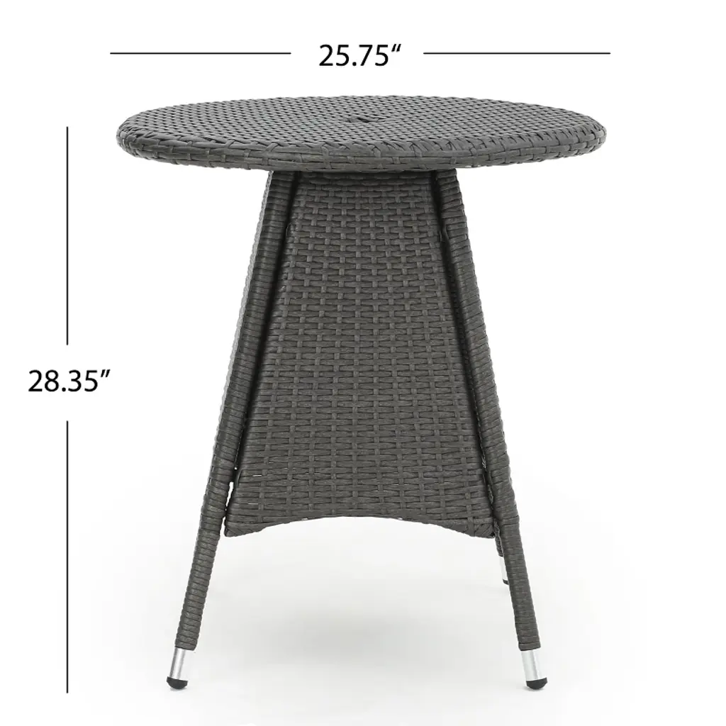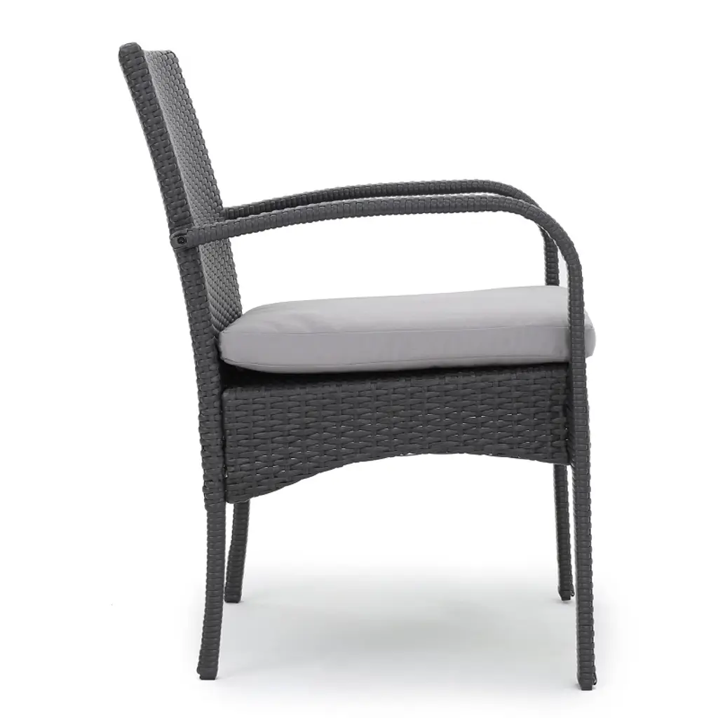 Relish the outdoors with a set just as unique as your outdoor patio with this dining set. This set offers a solid foundation of metal and resin wicker that creates a look that is not only trendy but functional. Whether you are entertaining guests or simply enjoying the outdoors this dining set, is perfect for any evening party you host. Material: Faux Rattan Cushion Material: Water Resistant Fabric Fabric Composition: 100% Polyester Frame Material: Iron Multiple Finish Options Multiple Cushion Color Options Assembly Required Table Dimensions: 26.25 inches deep x 26.25 inches wide x 28.75 inches high Chair Dimensions: 22.10 inches deep x 23.50 inches wide x 32.75 inches high Seat Dimensions: 18.25 inches deep x 18.25 inches wide x 16.50 inches high Arm Height: 24.60 inches