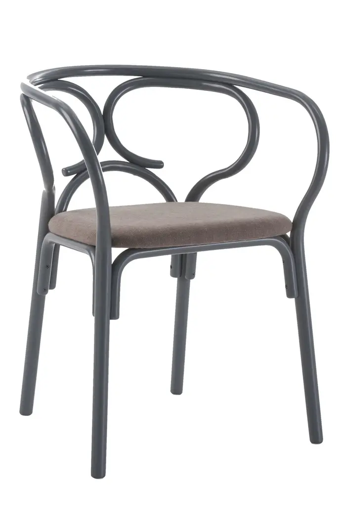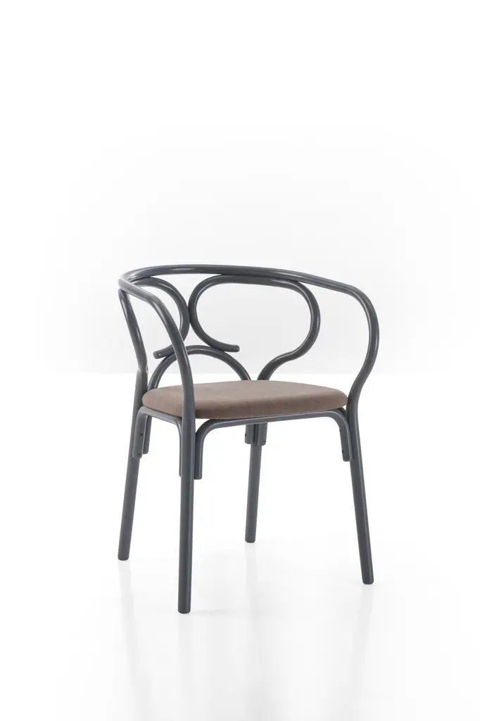 The armchair, Brezel, by the creative duo Lucidi Pevere, enriches the home with its playful and versatile presence. Its wooden structure is enriched with decorative curved beech elements that define the profile of the backrest with a fun reference to the bread that it is named after. The padded version is available with its seat and the inside of the backrest covered in the fabrics listed in the catalogue, revealing the characteristic decoration created by the wood on the backrest.Additional Information:Materials: Beechwood with upholstered seatDimensions: H 30.3 x W 22 x D 21.2 inch.Seat Height: 18.5 inchWIENER GTV DESIGN is a trademark which distinguishes the historical and contemporary collection of Gebrüder Thonet Vienna GmbH (GTV).