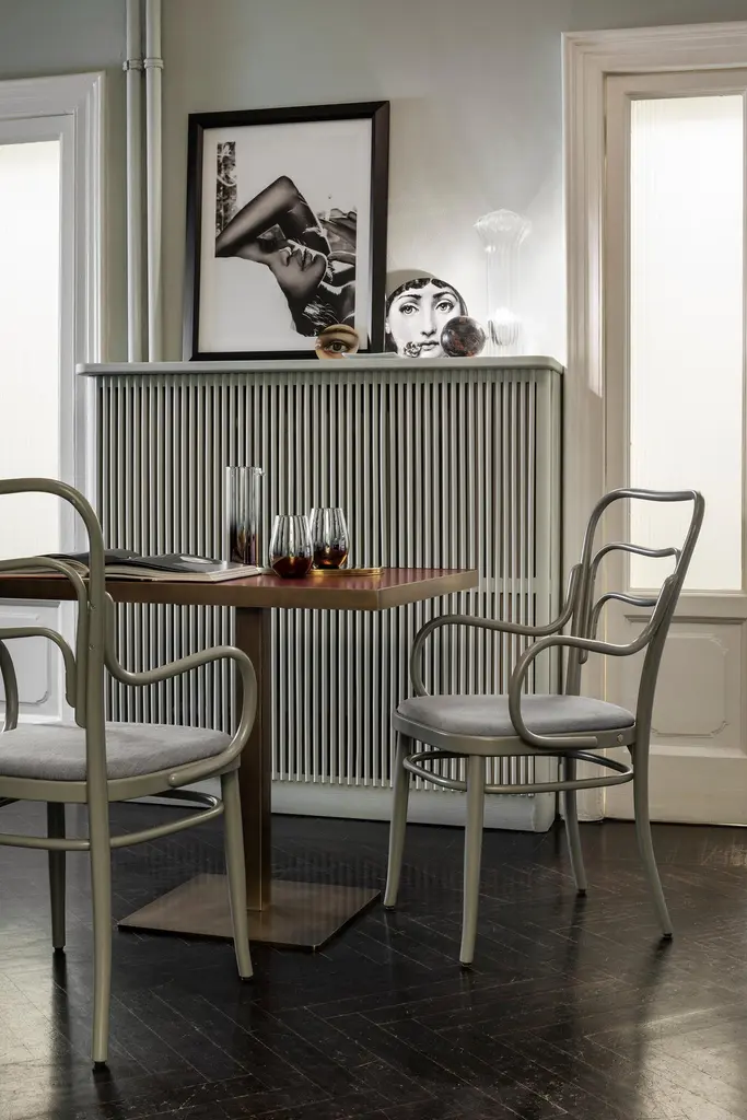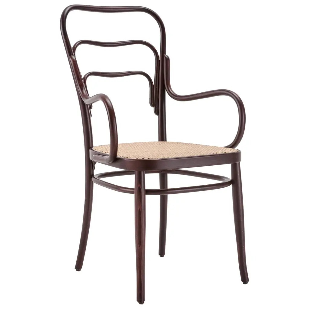 An unusual classic. Elegant and comfortable. The new color variants of this chair evoke the ambiance of the cafe society. A new edition of the model originally designed by Adolf Loos, with an austere steam bentwood beech design that slims the backrest and redesigns space. The ring-shaped seat stabilizes the feet bent from a single piece of wood. Back legs and backrest have also been formed from a single piece of bentwood. Available with a wide range of different seats.Additional Info:Materials: Walnut.Dimensions: H 37 x W 21.6 x D 23.6 inchSeat height: 17.7 inch Armrest height: 25.5 inchWIENER GTV DESIGN is a trademark which distinguishes the historical and contemporary collection of Gebrüder Thonet Vienna GmbH (GTV)