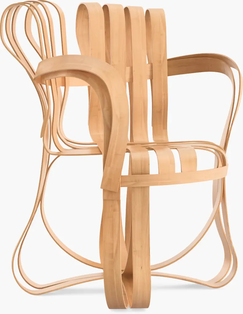 Inspired by the strength of the apple crates he played on as a child, Frank Gehry created his thoroughly original Gehry Collection (1990) of bentwood furniture for Knoll. Paying homage to his Canadian roots, he named the pieces after ice hockey terms. One of those designs, the Gehry Cross Check Armchair, implements wafer-thin strips of laminated maple into featherweight yet sturdy forms, evoking the simple strength and resilience of hockey sticks themselves.