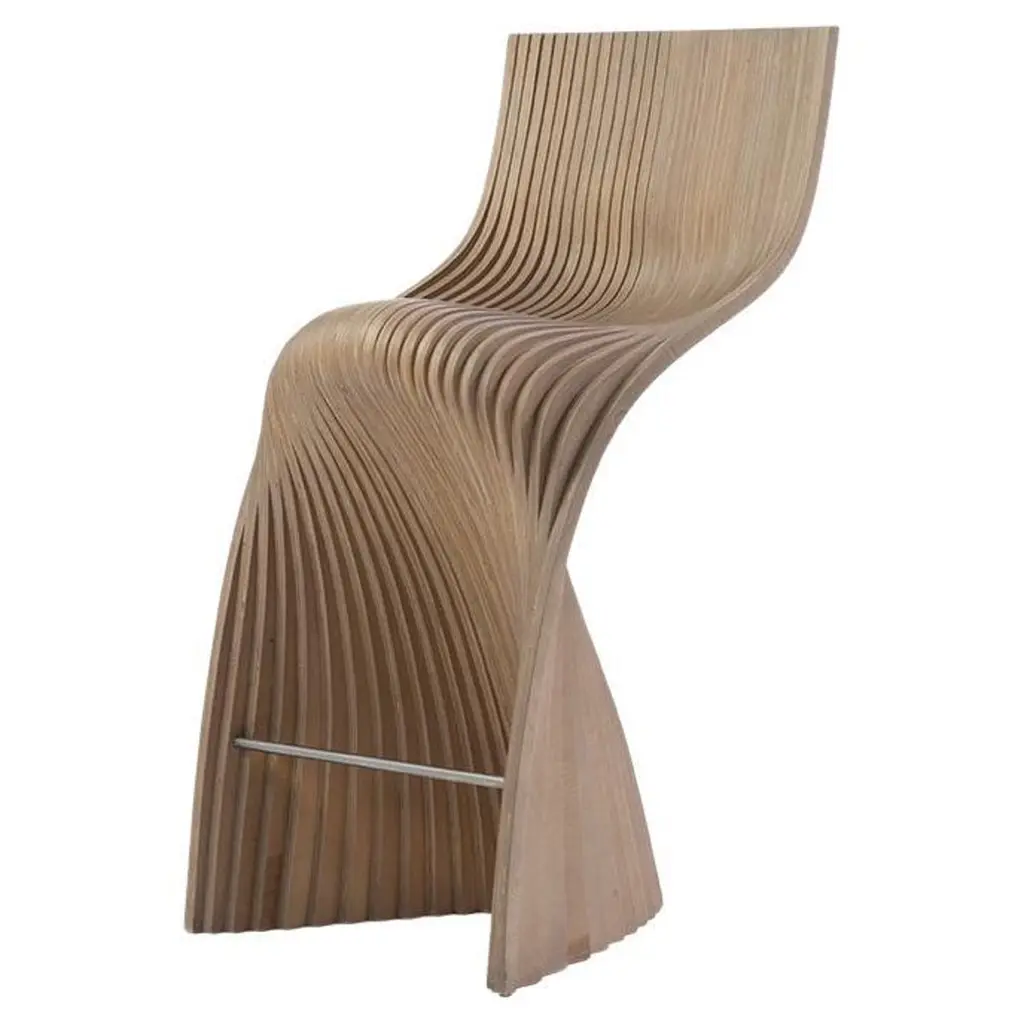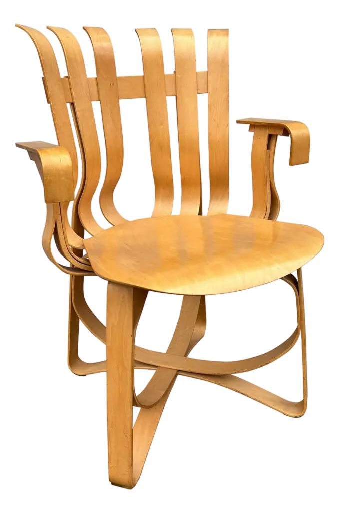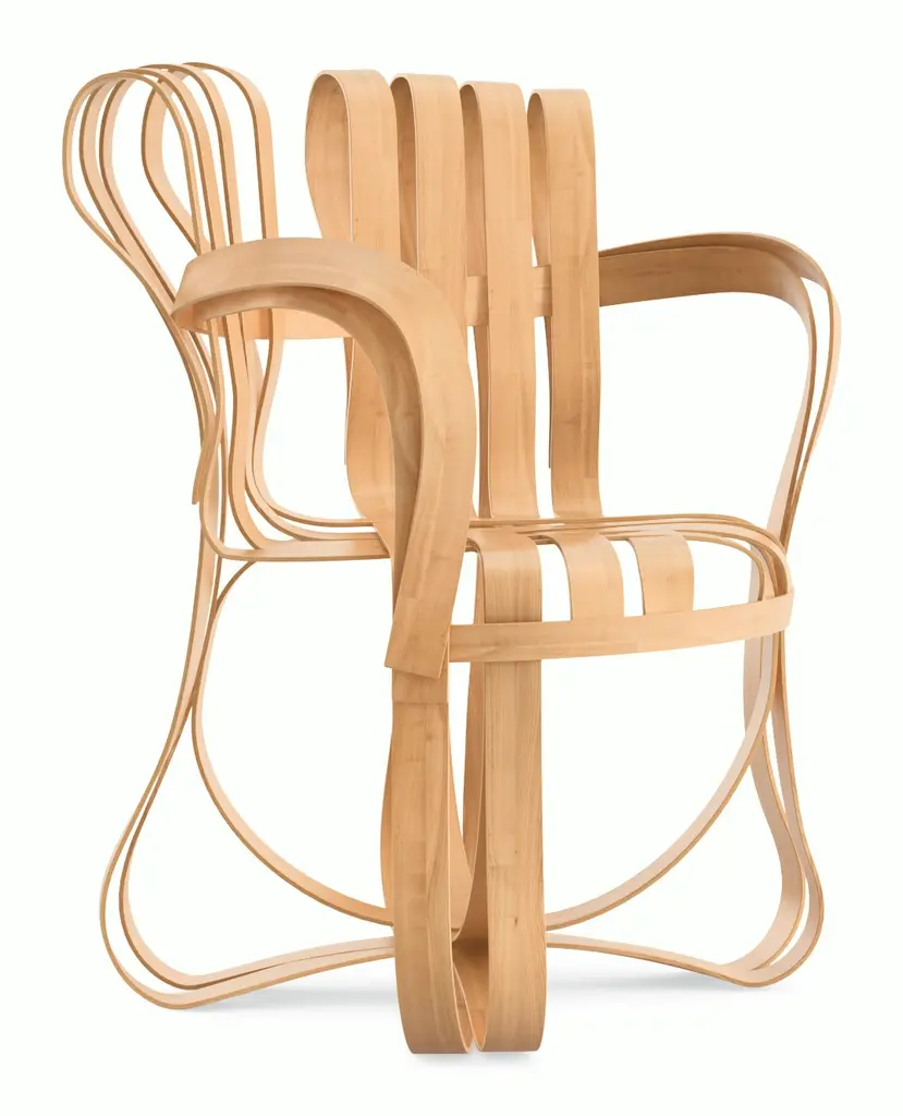Inspired by the strength of the apple crates he played on as a child, Frank Gehry created his thoroughly original Gehry Collection of bentwood furniture for Knoll (1990). Paying homage to his Canadian roots, he named the pieces after ice hockey terms. One of those designs, the Gehry High Sticking High Back Chair, implements wafer-thin strips of laminated maple into featherweight yet sturdy forms, evoking the simple strength and resilience of hockey sticks themselves.