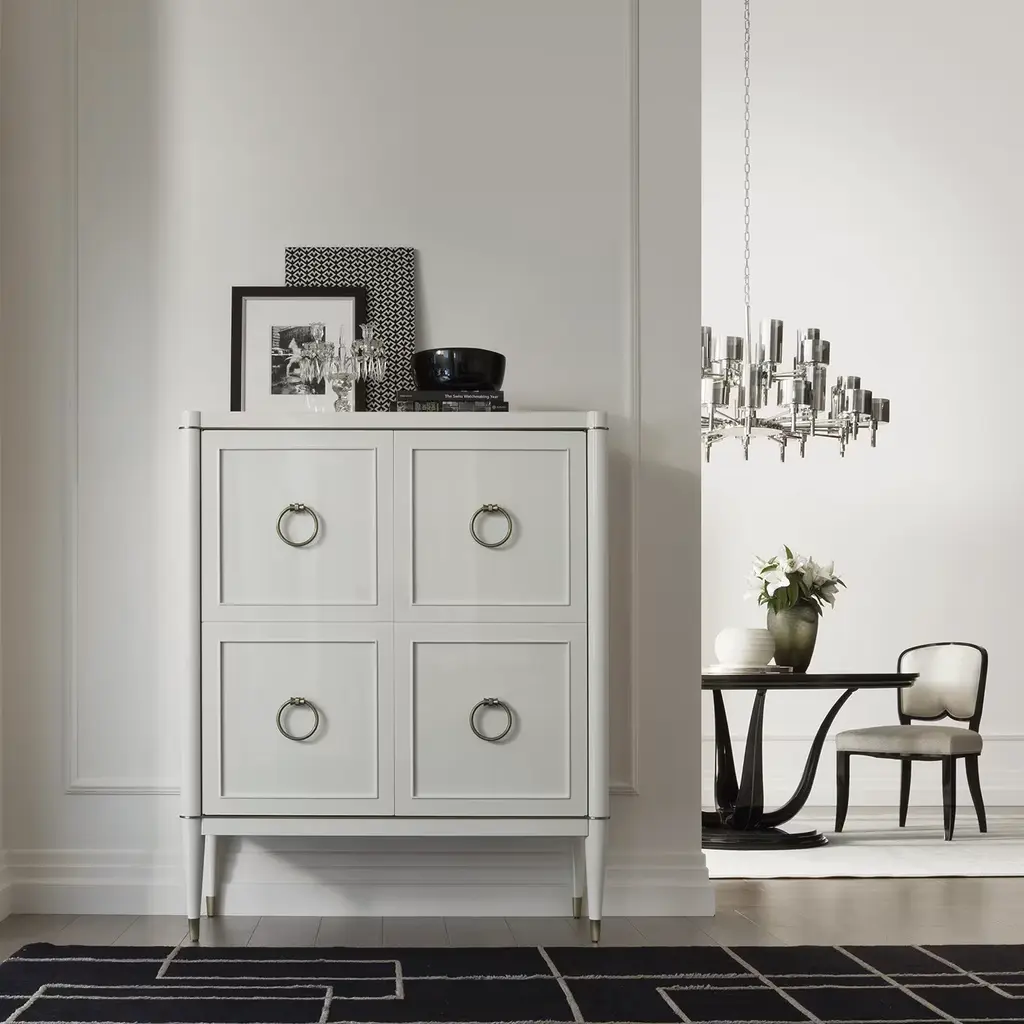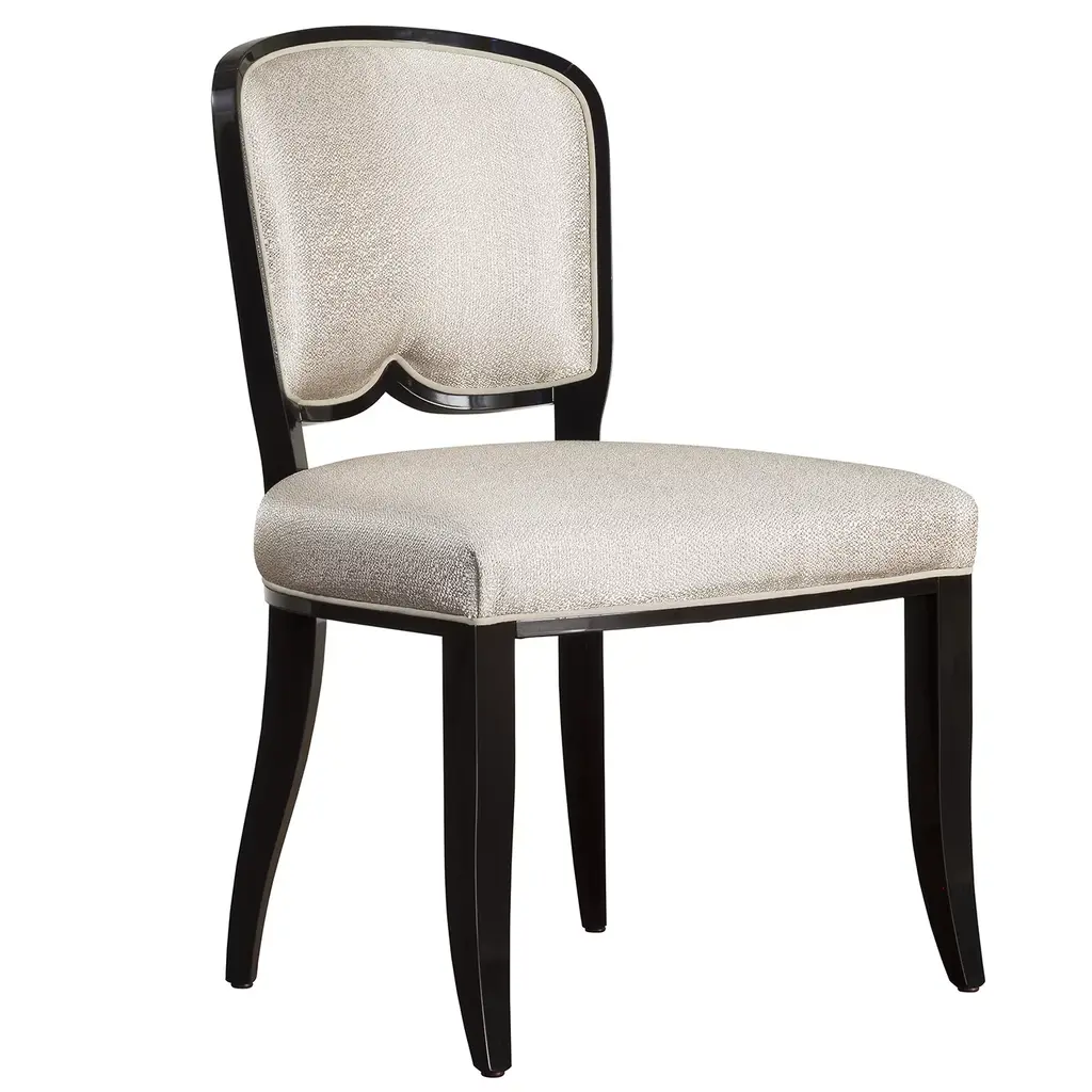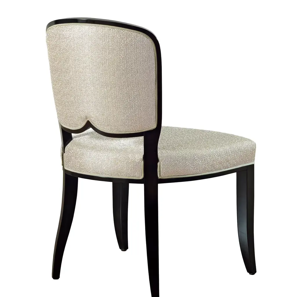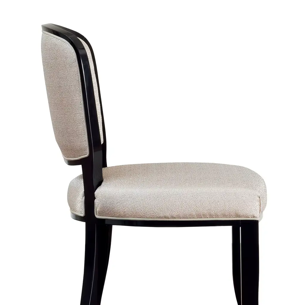 This timeless design is an ideal complement to the desks and dining tables designed by Nino Galimberti, boasting retro-chic glamour and exquisite craftsmanship. The structure in solid beechwood features a squared seat with slightly slanted back legs and a backrest cushion adorned with a scalloped bottom rim. The dark stain on the wood strikingly contrasts with the non-removable ivory fabric the covers the two cushions. Internally the padding is in polyurethane with lining in polyester fiber, supported by elastic belts.