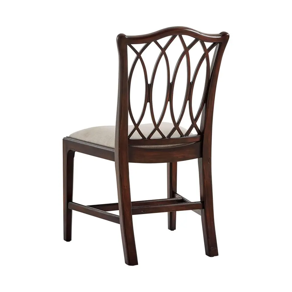 George III style mahogany dining chair with a serpentine side chair, with an interlacing trellis back, above a bowed upholstered seat, on chamfered legs. The original George III circa 1780.Dimensions: 21.25" W x 23" D x 38" Hseat height - 20.25"Shown in Draper Performance-UP5409 Fabric.