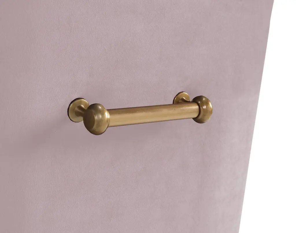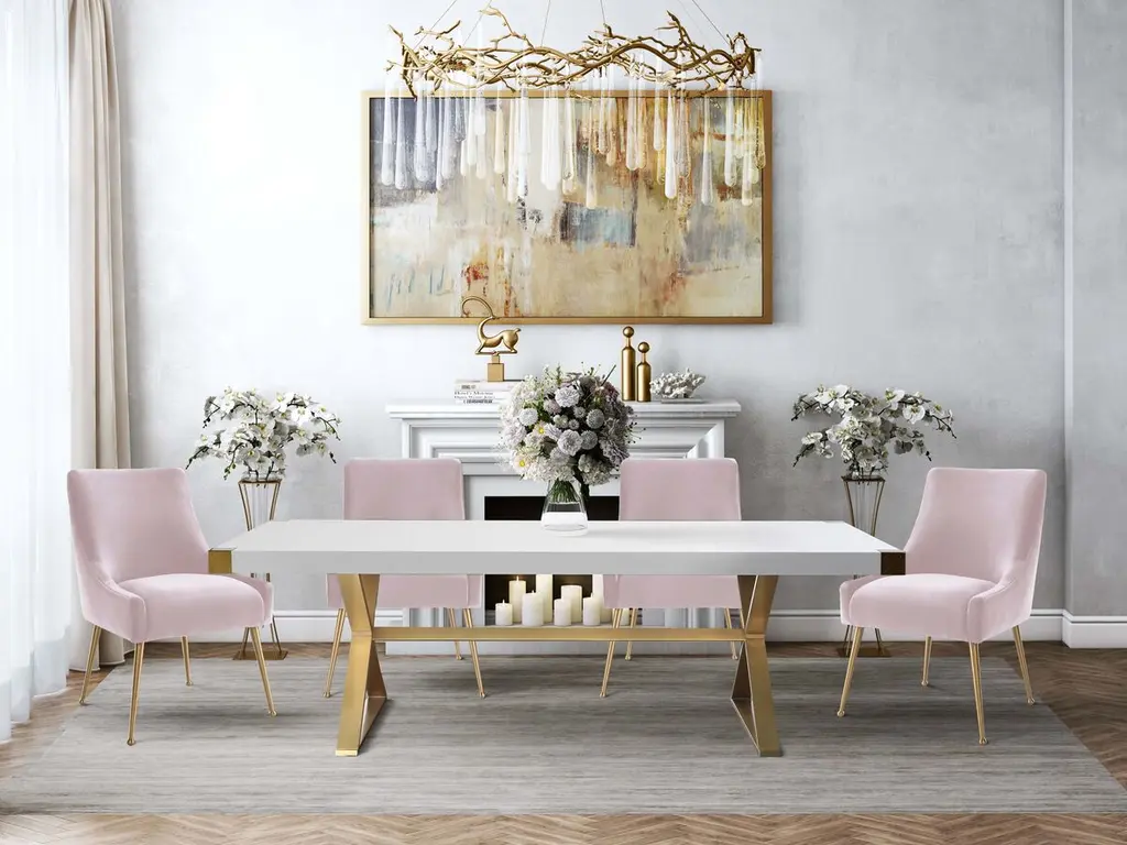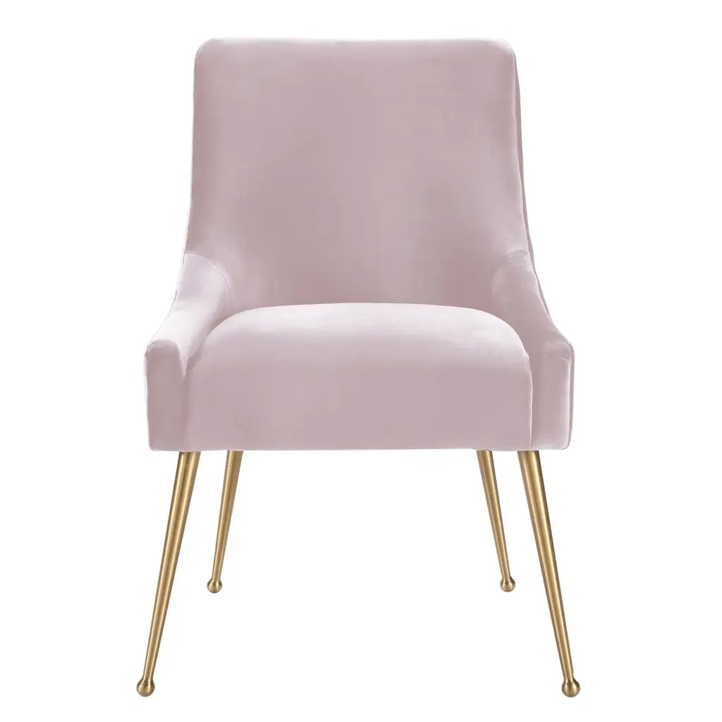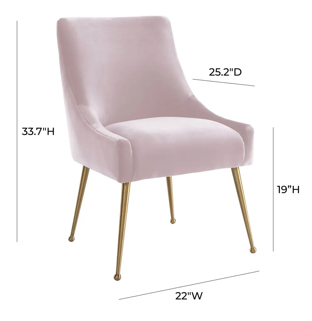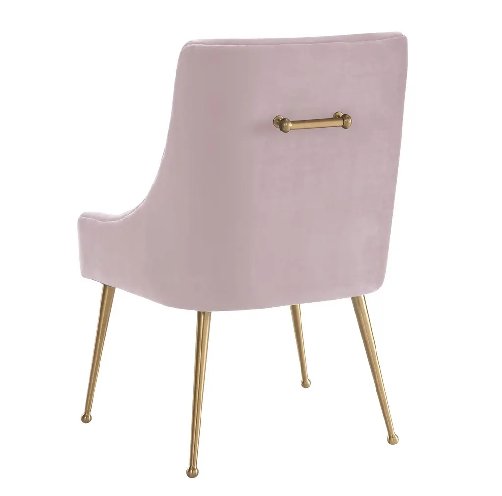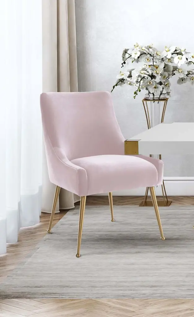 The arms of this chair are low enough to slide under a dining table. Unlike many other dining chairs, however, this one is equally at home in a living room or a bedroom. Splayed golden legs and a gold handle on the back accentuate the glamour of the velvet upholstery. Ample foam padding provides long-lasting comfort.
