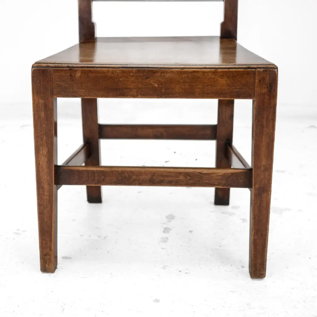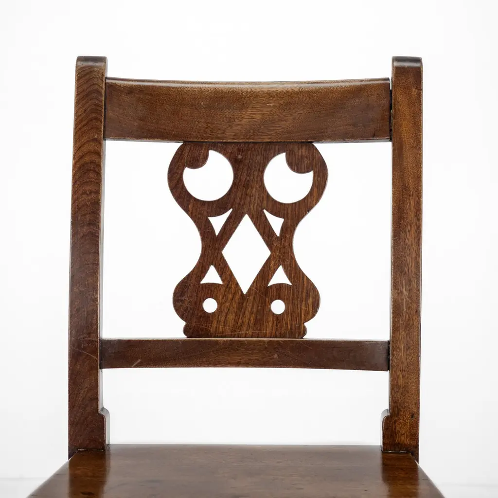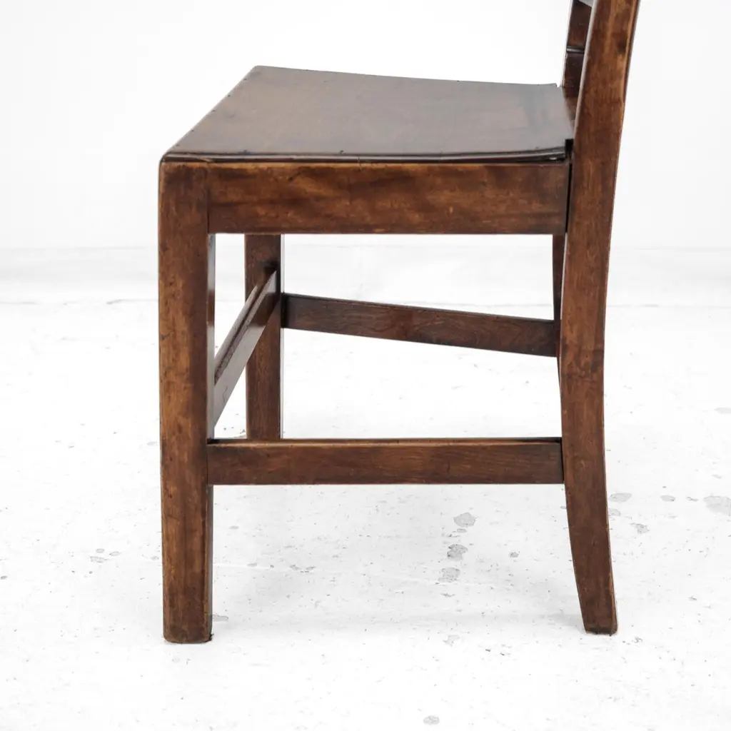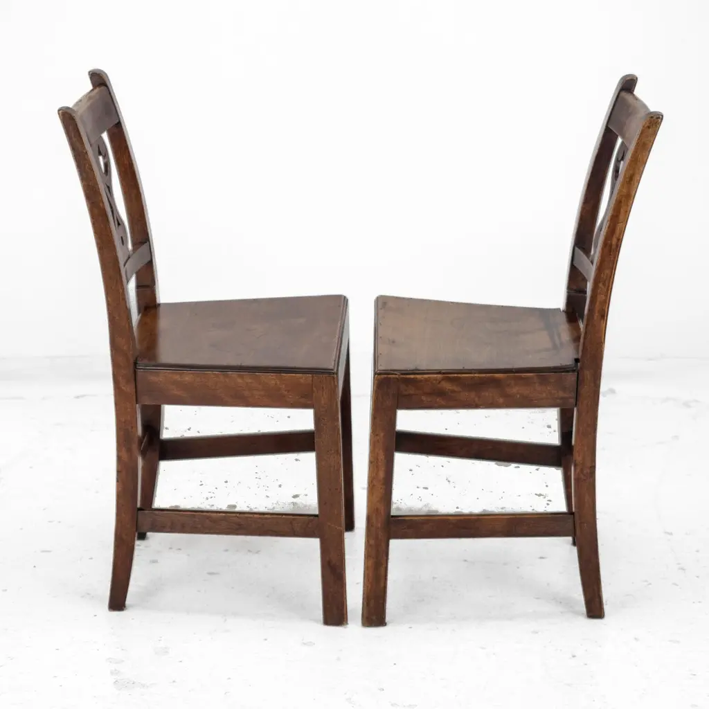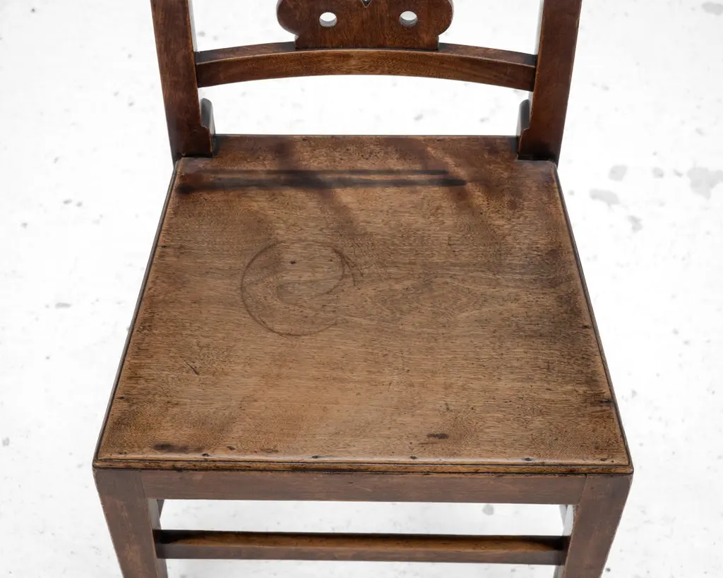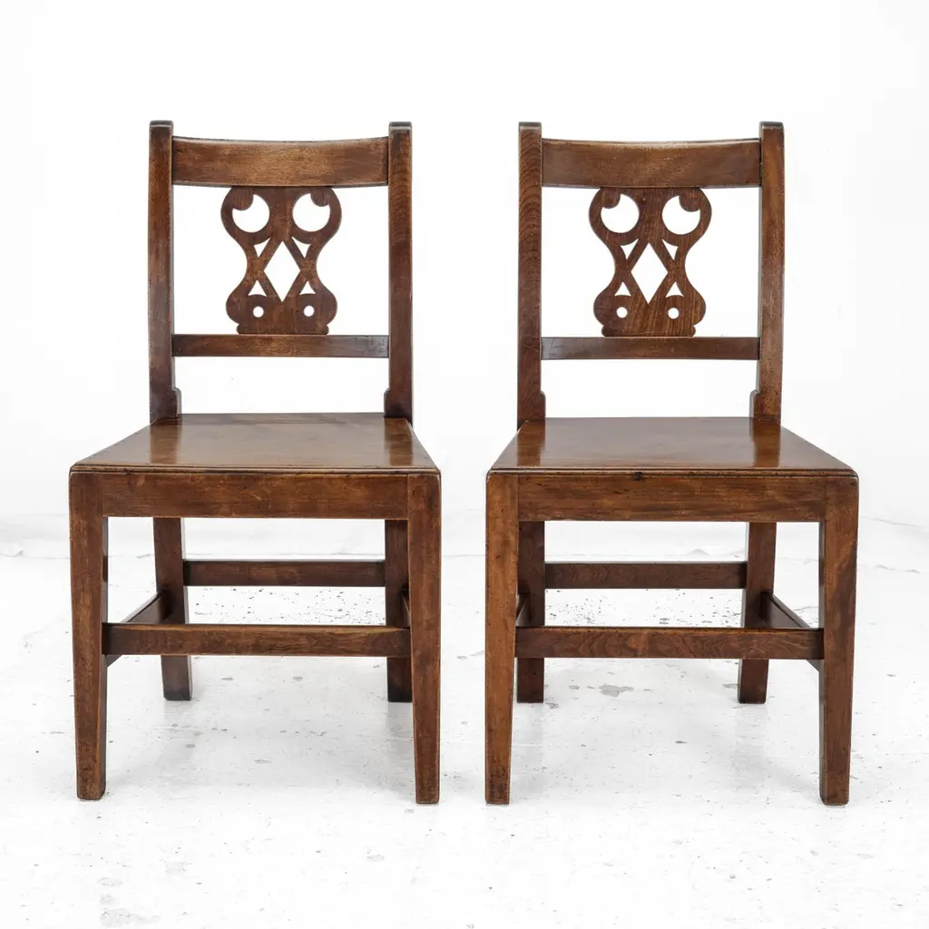 A pair of Georgian period, stained elm country chairs, dating from the early 19th century. Solid elm frames with plain plank seats. Pierced back splats.Quality country chairs. Very well presented and ready for use.Dimensions:These chairs measure approximately 87 cm (34.25") tall, 48 cm (19") wide, and 47 cm (18.5") deep. The seat height is approximately 45.75 cm (18").Condition:Please see the pictures for details of the items condition. - These chairs are in a good original condition and are structurally sound and sturdy. There are some minor marks, blemishes and wear on the frame. No loose joints. One front foot on one chair hasa small repair to a corner, the other chair has a few worm holes to the front edge. Whicch does not affect the sturdiness in anyway, is typical of old elm furniture, and has been treated by way of precaution. The back edge of the seat on one chair has aged and warped slightly, creating a gap. This has been left as repairing it would cause damage.This is the original seat and the warping does not affect it structually in any way. Lovely aged patina with appropriate aged wear through some of the stained timber, good colour and pleasing wax polish throughout. These chairs have been through the workshop and have been sensitively cleaned and waxed, and are very much ready to be used. - As with all vintage & antique furniture there will be signs of use, marks, wear & tear, etc.