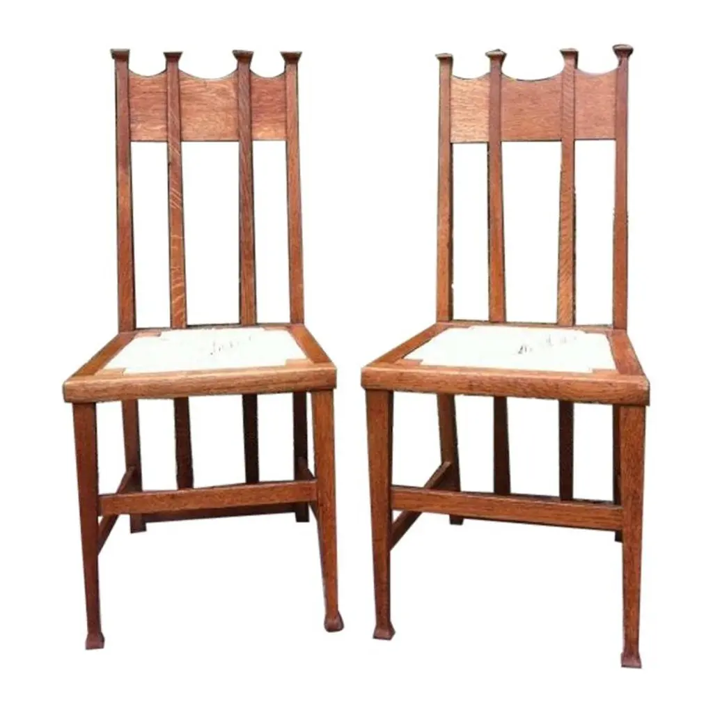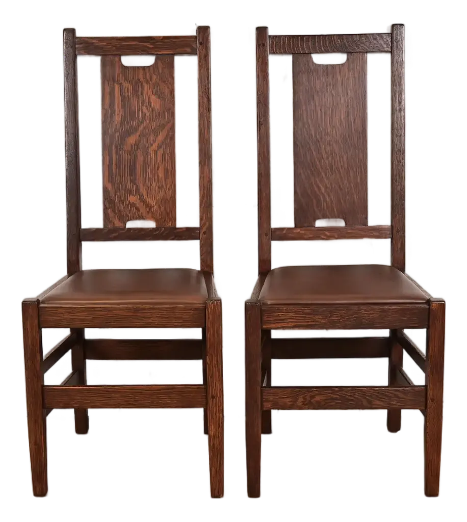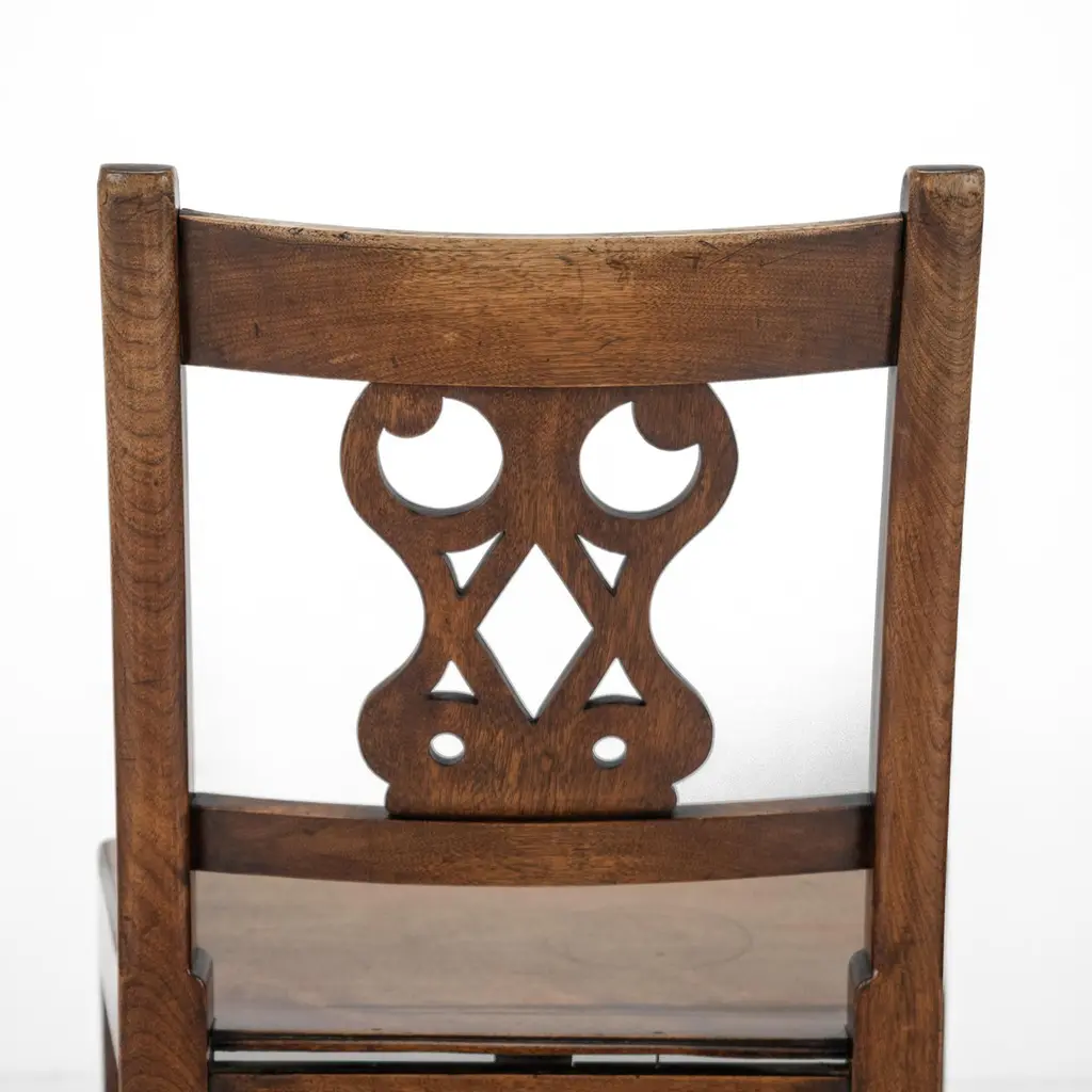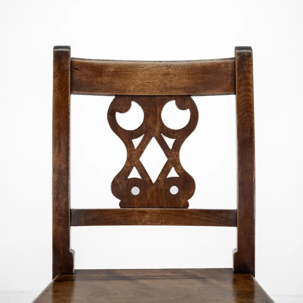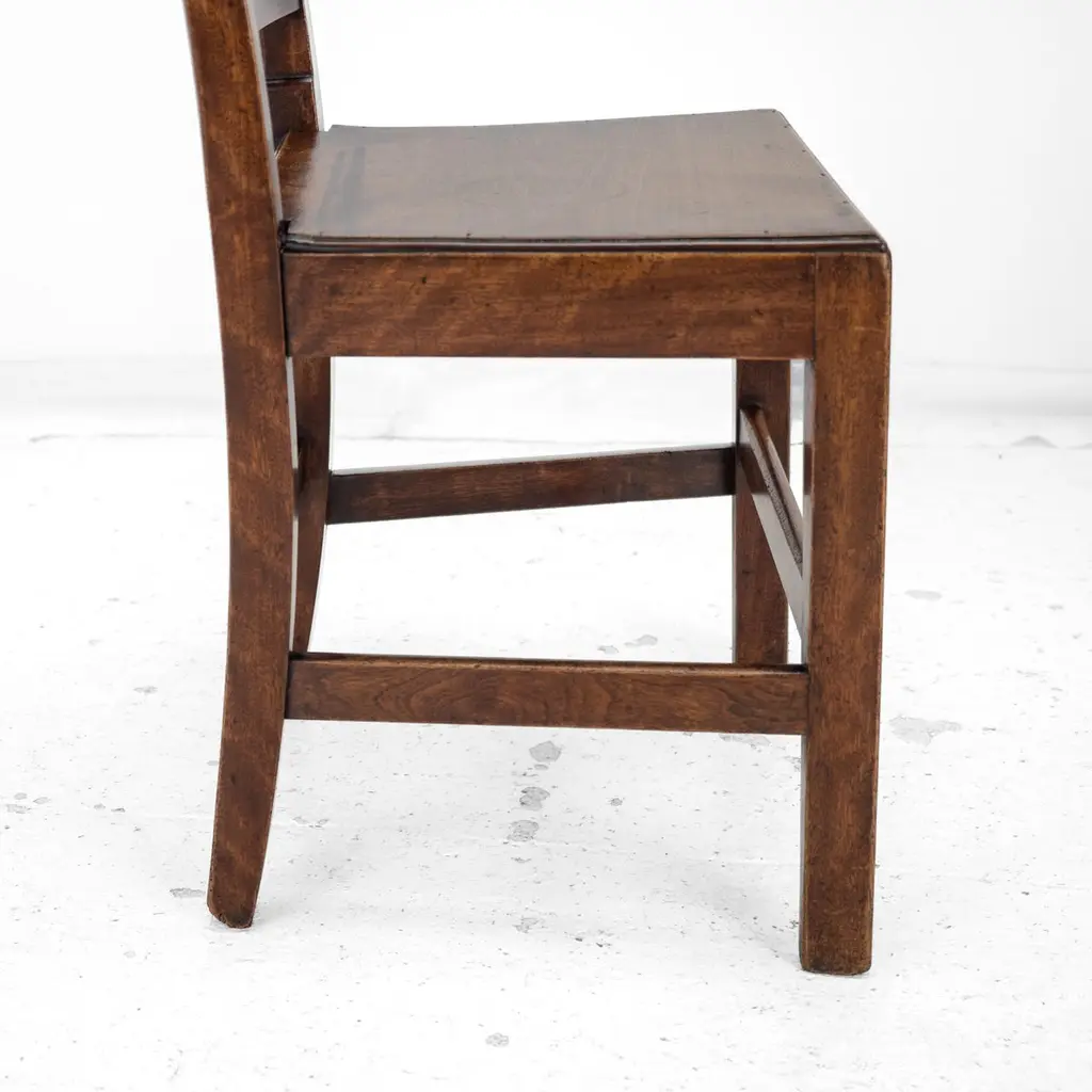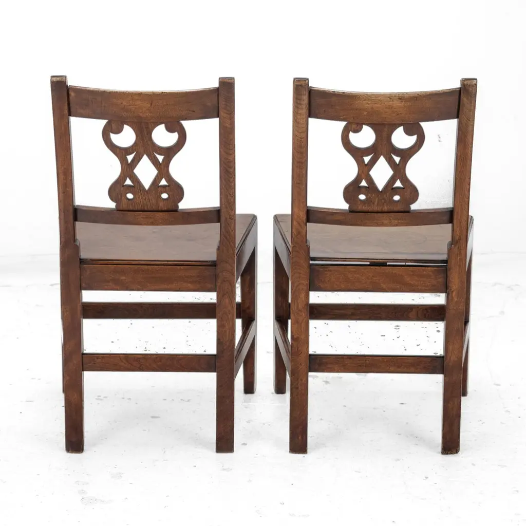 A pair of Georgian period, stained elm country chairs, dating from the early 19th century. Solid elm frames with plain plank seats. Pierced back splats.Quality country chairs. Very well presented and ready for use.Dimensions:These chairs measure approximately 87 cm (34.25") tall, 48 cm (19") wide, and 47 cm (18.5") deep. The seat height is approximately 45.75 cm (18").Condition:Please see the pictures for details of the items condition. - These chairs are in a good original condition and are structurally sound and sturdy. There are some minor marks, blemishes and wear on the frame. No loose joints. One front foot on one chair hasa small repair to a corner, the other chair has a few worm holes to the front edge. Whicch does not affect the sturdiness in anyway, is typical of old elm furniture, and has been treated by way of precaution. The back edge of the seat on one chair has aged and warped slightly, creating a gap. This has been left as repairing it would cause damage.This is the original seat and the warping does not affect it structually in any way. Lovely aged patina with appropriate aged wear through some of the stained timber, good colour and pleasing wax polish throughout. These chairs have been through the workshop and have been sensitively cleaned and waxed, and are very much ready to be used. - As with all vintage & antique furniture there will be signs of use, marks, wear & tear, etc.