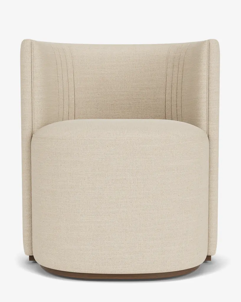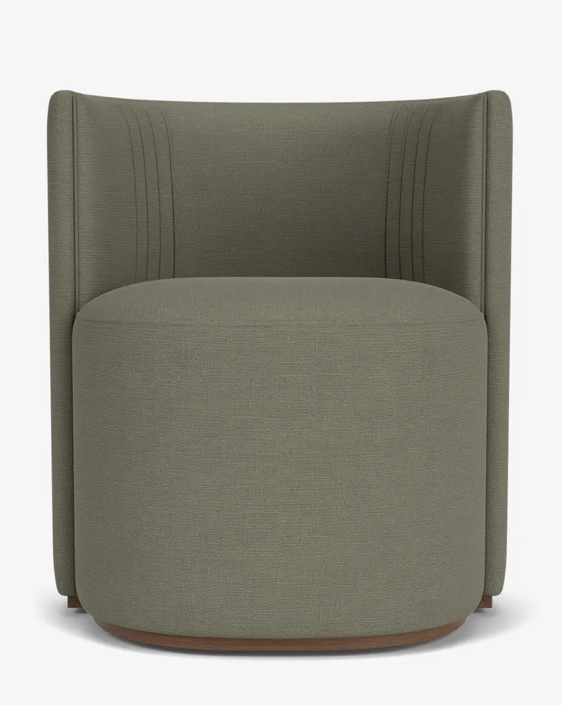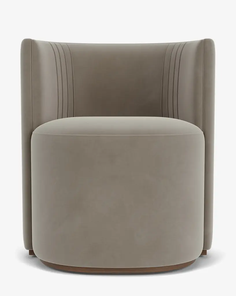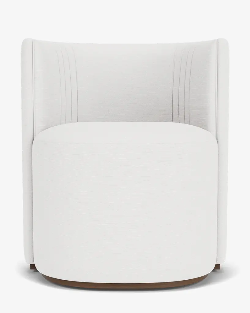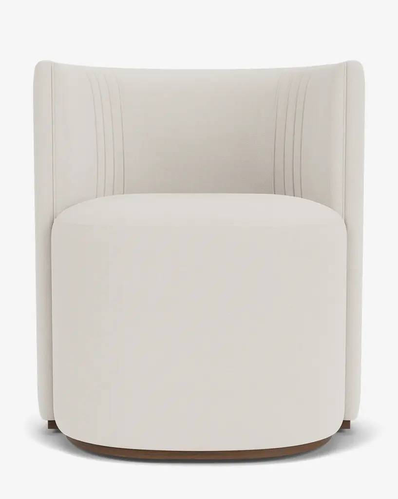 Dramatic and shapely, our Georgina Dining Chair is designed with subtle art deco inspiration. Bench-made by craftsmen, the chair provides sophisticated seating in your dining room with its intentional details, barrel back, and your choice of designer upholstery.