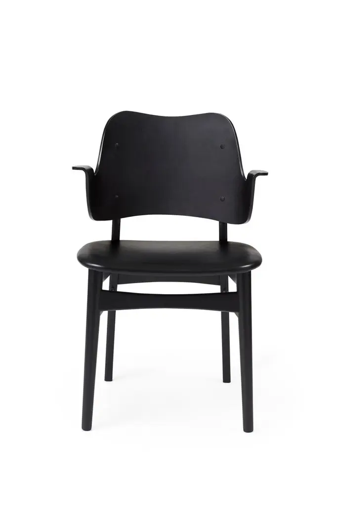 Gesture chair Black Beech Black Leather by Warm NordicDimensions: D56 x W53 x H 80 cmMaterial: Teak or white oiled solid oak, Black lacquered solid beech, Veneer seat and back, textile upholsteryWeight: 7.5 kgAlso available in different colours and finishes. This beautiful, moulded Gesture Chair, designed in the 1950s, was the work of the acclaimed Danish architect, Hans Olsen. Gesture Chair is now available in an exclusive anniversary edition with a sustainable fabric launched to celebrate the 100th anniversary of Hans Olsen. With its welcoming design, the Gesture Chair creates a warm atmosphere around a dining table or at a desk in the living room, where it does not hurt if a chair is something special. The armrests invite you to sit down and relax in the moulded design and are also constructed so you cannot get too close to the table. Gesture is a designer chair with a certain weight, offset by its light, playful charm. As a tribute to the 1950s' adoration of colour, the Gesture Chair is available in an abundance of stunning colours and comes with upholstery on seat and back, upholstery on the seat; or a unique type of wood - depending on the desired look. Choose from high quality leather or several different exclusive fabrics in the most beautiful colours from the Warm Nordic universe. The frame is available in several exclusive types of wood and a variety of surface treatments. The anniversary edition of the Gesture Chair is constructed of black lacquered beech with leather upholstery on the back and a sustainable fabric from Kvadrat on the seat. The fabric, Merit by Maharam, is available in four exclusively selected colours with a modern lightness. The back and seat are made of FSC-certified wood on the anniversary edition of the chair.Warm Nordic is an ambitious design brand anchored in Nordic design history and with a timeless, aesthetic style that inspires you to appreciate the little things in life. The company is the result of several years’ intense work on developing a new design brand with design history, quality and personality at its core. Warm Nordic boasts a colourful and charming universe of furniture, lamps and accessories full of personality. Our designs encapsulate the Nordic spirit, which in its essence is timeless, inclusive and warm.