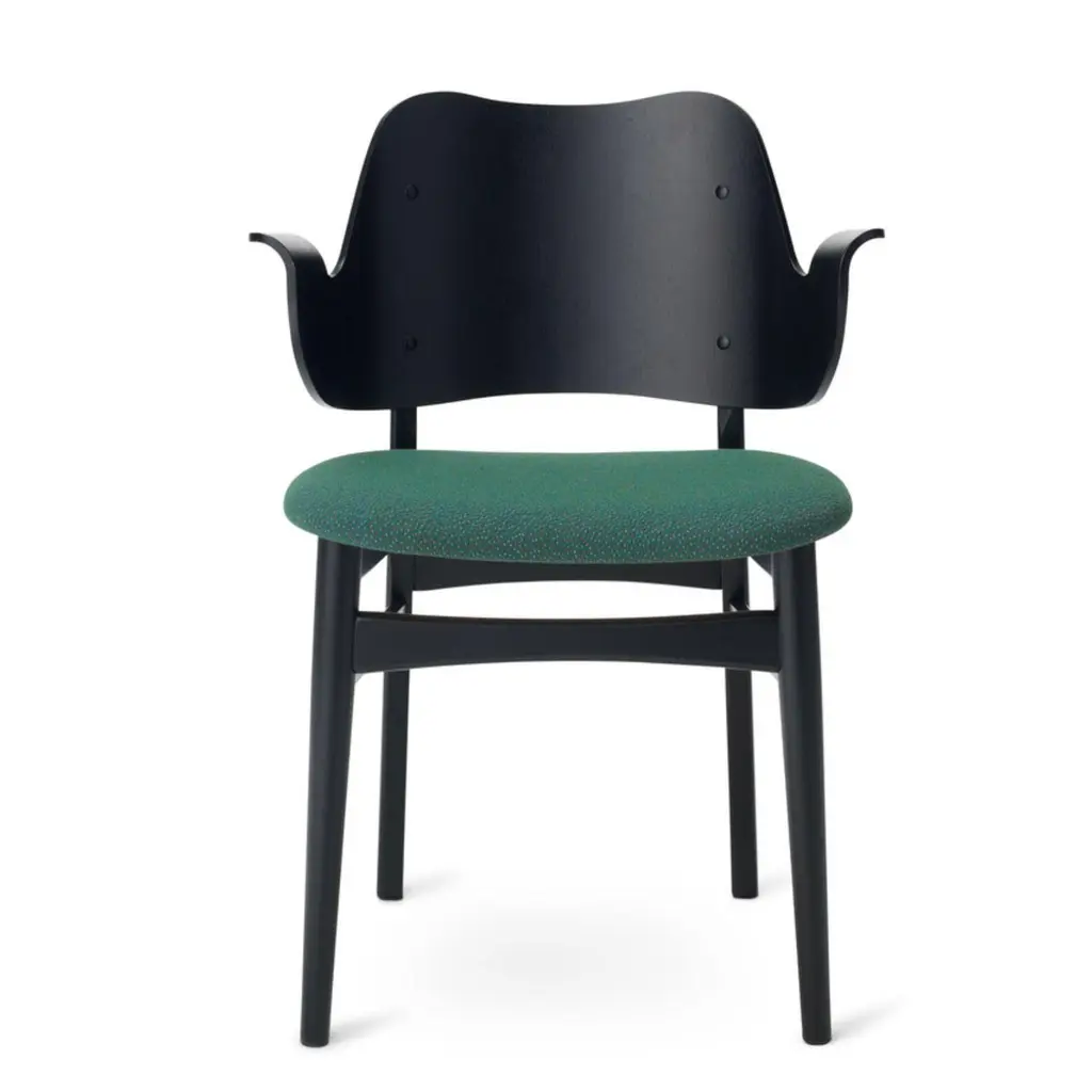 Gesture chair Black Beech Hunter Green by Warm NordicDimensions: D56 x W53 x H 80 cmMaterial: Teak or white oiled solid oak, Black lacquered solid beech, Veneer seat and back, textile upholsteryWeight: 7.5 kgAlso available in different colors and finishes. This beautiful, moulded Gesture Chair, designed in the 1950s, was the work of the acclaimed Danish architect, Hans Olsen. Gesture Chair is now available in an exclusive anniversary edition with a sustainable fabric launched to celebrate the 100th anniversary of Hans Olsen. With its welcoming design, the Gesture Chair creates a warm atmosphere around a dining table or at a desk in the living room, where it does not hurt if a chair is something special. The armrests invite you to sit down and relax in the moulded design and are also constructed so you cannot get too close to the table. Gesture is a designer chair with a certain weight, offset by its light, playful charm. As a tribute to the 1950s' adoration of colour, the Gesture Chair is available in an abundance of stunning colours and comes with upholstery on seat and back, upholstery on the seat; or a unique type of wood - depending on the desired look. Choose from high quality leather or several different exclusive fabrics in the most beautiful colours from the Warm Nordic universe. The frame is available in several exclusive types of wood and a variety of surface treatments. The anniversary edition of the Gesture Chair is constructed of black lacquered beech with leather upholstery on the back and a sustainable fabric from Kvadrat on the seat. The fabric, Merit by Maharam, is available in four exclusively selected colours with a modern lightness. The back and seat are made of FSC-certified wood on the anniversary edition of the chair.Warm Nordic is an ambitious design brand anchored in Nordic design history and with a timeless, aesthetic style that inspires you to appreciate the little things in life. The company is the result of several years’ intense work on developing a new design brand with design history, quality and personality at its core. Warm Nordic boasts a colourful and charming universe of furniture, lamps and accessories full of personality. Our designs encapsulate the Nordic spirit, which in its essence is timeless, inclusive and warm.