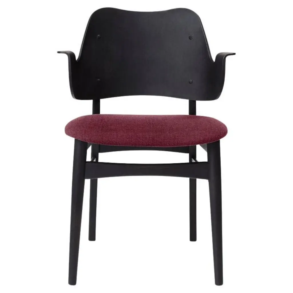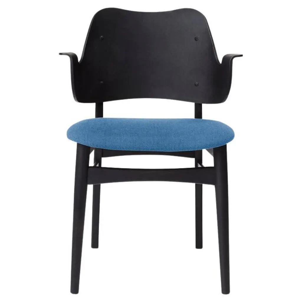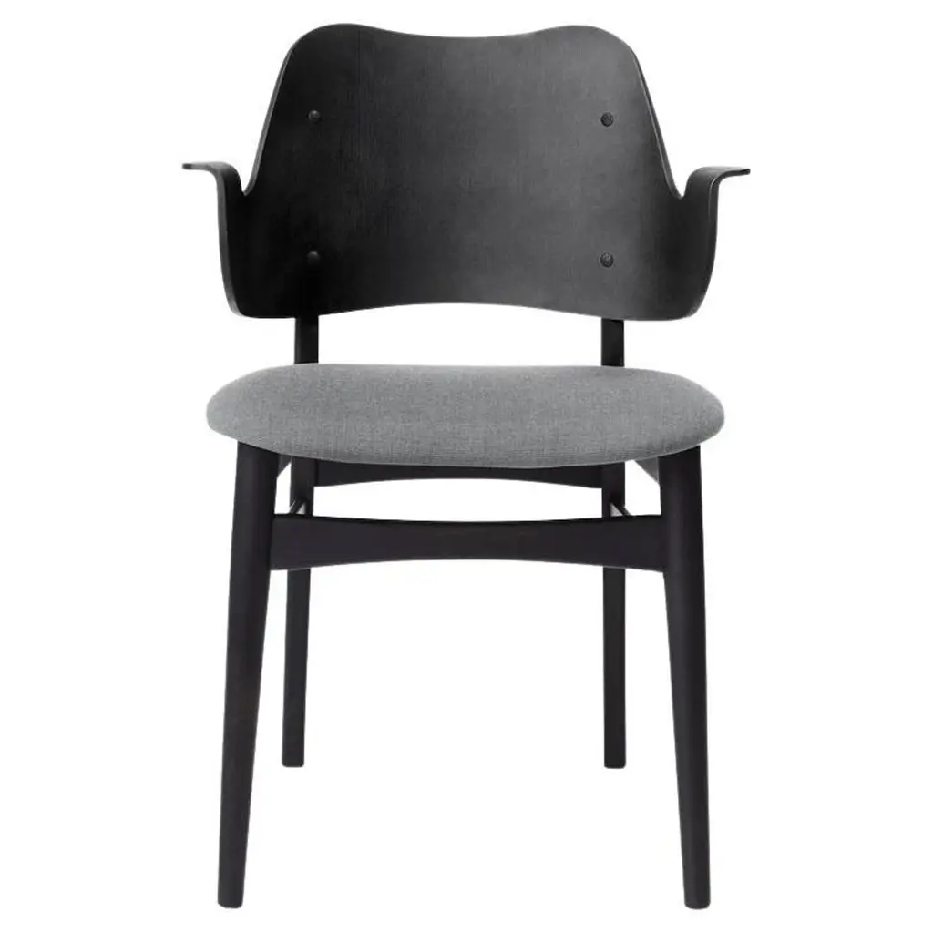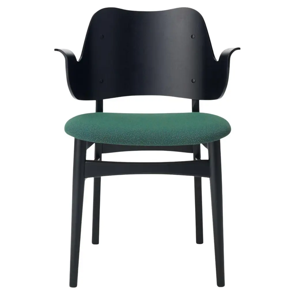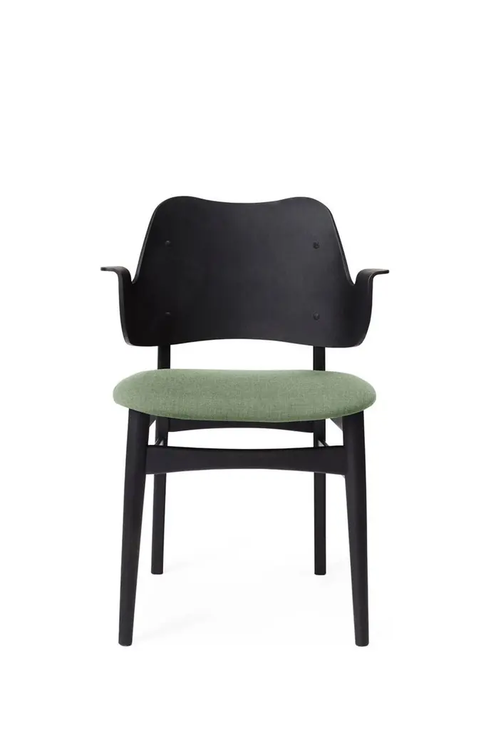 Gesture chair Canvas Black Beech Sage Green by Warm NordicDimensions: D56 x W53 x H 80 cmMaterial: Teak or white oiled solid oak, Black lacquered solid beech, Veneer seat and back, Textile upholsteryWeight: 7.5 kgAlso available in different colors and finishes. This beautiful, moulded Gesture Chair, designed in the 1950s, was the work of the acclaimed Danish architect, Hans Olsen. Gesture Chair is now available in an exclusive anniversary edition with a sustainable fabric launched to celebrate the 100th anniversary of Hans Olsen. With its welcoming design, the Gesture Chair creates a warm atmosphere around a dining table or at a desk in the living room, where it does not hurt if a chair is something special. The armrests invite you to sit down and relax in the moulded design and are also constructed so you cannot get too close to the table. Gesture is a designer chair with a certain weight, offset by its light, playful charm. As a tribute to the 1950s' adoration of colour, the Gesture Chair is available in an abundance of stunning colours and comes with upholstery on seat and back, upholstery on the seat; or a unique type of wood - depending on the desired look. Choose from high quality leather or several different exclusive fabrics in the most beautiful colours from the Warm Nordic universe. The frame is available in several exclusive types of wood and a variety of surface treatments. The anniversary edition of the Gesture Chair is constructed of black lacquered beech with leather upholstery on the back and a sustainable fabric from Kvadrat on the seat. The fabric, Merit by Maharam, is available in four exclusively selected colours with a modern lightness. The back and seat are made of FSC-certified wood on the anniversary edition of the chair.Warm Nordic is an ambitious design brand anchored in Nordic design history and with a timeless, aesthetic style that inspires you to appreciate the little things in life. The company is the result of several years’ intense work on developing a new design brand with design history, quality and personality at its core. Warm Nordic boasts a colourful and charming universe of furniture, lamps and accessories full of personality. Our designs encapsulate the Nordic spirit, which in its essence is timeless, inclusive and warm.
