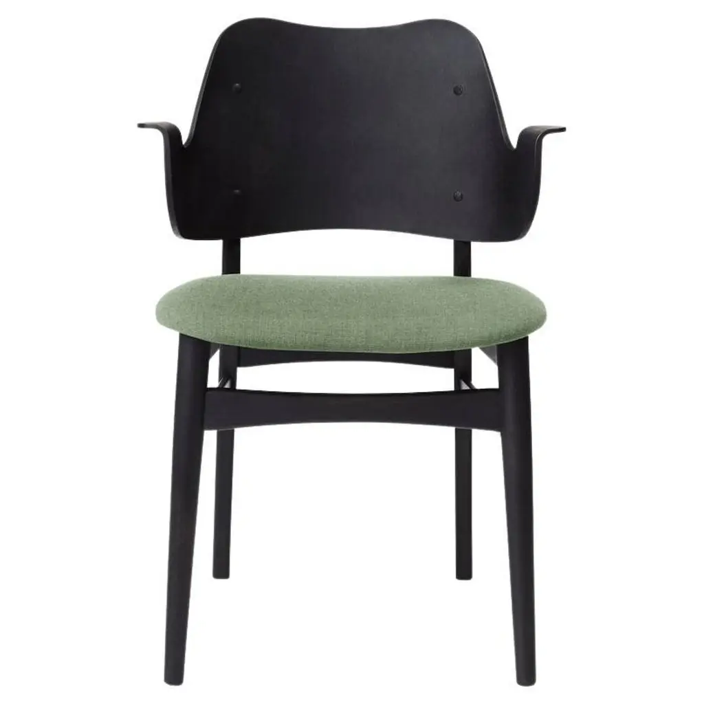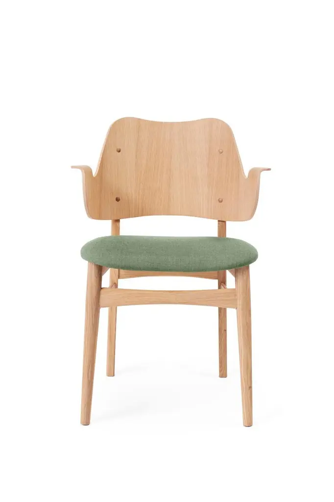 Gesture chair canvas white oiled oak sage green by Warm NordicDimensions: D56 x W53 x H 80 cmMaterial: teak or white oiled solid oak, black lacquered solid beech, veneer seat and back, textile upholsteryWeight: 7.5 kgAlso available in different colours and finishes. This beautiful, moulded Gesture Chair, designed in the 1950s, was the work of the acclaimed Danish architect, Hans Olsen. Gesture Chair is now available in an exclusive anniversary edition with a sustainable fabric launched to celebrate the 100th anniversary of Hans Olsen. With its welcoming design, the Gesture Chair creates a warm atmosphere around a dining table or at a desk in the living room, where it does not hurt if a chair is something special. The armrests invite you to sit down and relax in the moulded design and are also constructed so you cannot get too close to the table. Gesture is a designer chair with a certain weight, offset by its light, playful charm. As a tribute to the 1950s' adoration of colour, the Gesture Chair is available in an abundance of stunning colours and comes with upholstery on seat and back, upholstery on the seat; or a unique type of wood - depending on the desired look. Choose from high quality leather or several different exclusive fabrics in the most beautiful colours from the Warm Nordic universe. The frame is available in several exclusive types of wood and a variety of surface treatments. The anniversary edition of the Gesture Chair is constructed of black lacquered beech with leather upholstery on the back and a sustainable fabric from Kvadrat on the seat. The fabric, Merit by Maharam, is available in four exclusively selected colours with a modern lightness. The back and seat are made of FSC-certified wood on the anniversary edition of the chair.Warm Nordic is an ambitious design brand anchored in Nordic design history and with a timeless, aesthetic style that inspires you to appreciate the little things in life. The company is the result of several years’ intense work on developing a new design brand with design history, quality and personality at its core. Warm Nordic boasts a colourful and charming universe of furniture, lamps and accessories full of personality. Our designs encapsulate the Nordic spirit, which in its essence is timeless, inclusive and warm.