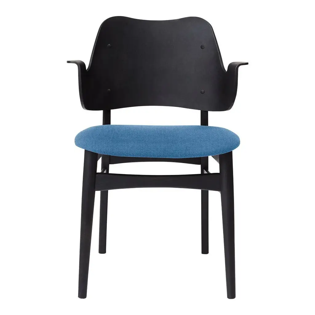 This beautiful, moulded Gesture chair, designed in the 1950s, was the work of the acclaimed Danish architect, Hans Olsen. With its welcoming design, the Gesture chair creates a warm atmosphere around a dining table or at a desk in the living room, where it does not hurt if a chair is something special. The armrests invite you to sit down and relax in the moulded design and are also constructed so you cannot get too close to the table. Gesture is a designer chair with a certain weight, offset by its light, playful charm. As a tribute to the 1950s' adoration of colour, the Gesture chair is available in an abundance of stunning colours in three versions: fully upholstered; with upholstery on the seat; or a unique type of wood depending on the look you after. Choose from high quality leather or several different exclusive fabrics in the most beautiful colours from the Warm Nordic universe. The frame is available in several exclusive types of wood and a variety of surface treatments.