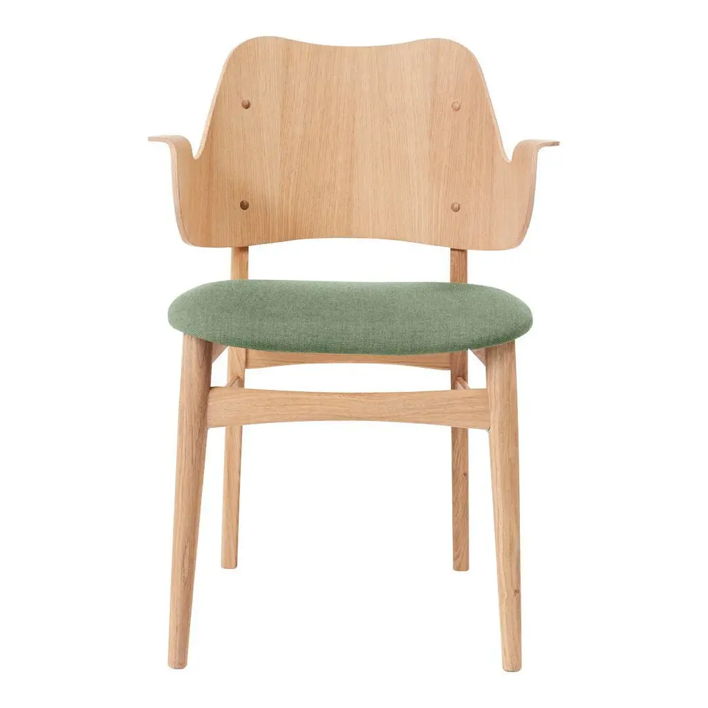 This beautiful, moulded Gesture chair, designed in the 1950s, was the work of the acclaimed Danish architect, Hans Olsen. With its welcoming design, the Gesture chair creates a warm atmosphere around a dining table or at a desk in the living room, where it does not hurt if a chair is something special. The armrests invite you to sit down and relax in the moulded design and are also constructed so you cannot get too close to the table. Gesture is a designer chair with a certain weight, offset by its light, playful charm. As a tribute to the 1950s' adoration of colour, the Gesture chair is available in an abundance of stunning colours in three versions: fully upholstered; with upholstery on the seat; or a unique type of wood depending on the look you after. Choose from high quality leather or several different exclusive fabrics in the most beautiful colours from the Warm Nordic universe. The frame is available in several exclusive types of wood and a variety of surface treatments.