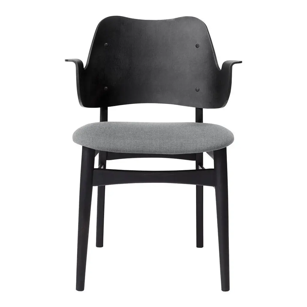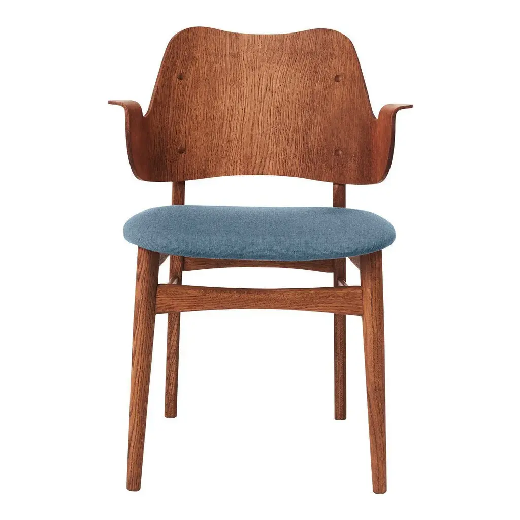 This beautiful, moulded Gesture chair, designed in the 1950s, was the work of the acclaimed Danish architect, Hans Olsen. With its welcoming design, the Gesture chair creates a warm atmosphere around a dining table or at a desk in the living room, where it does not hurt if a chair is something special. The armrests invite you to sit down and relax in the moulded design and are also constructed so you cannot get too close to the table. Gesture is a designer chair with a certain weight, offset by its light, playful charm. As a tribute to the 1950s' adoration of colour, the Gesture chair is available in an abundance of stunning colours in three versions: fully upholstered; with upholstery on the seat; or a unique type of wood depending on the look you after. Choose from high quality leather or several different exclusive fabrics in the most beautiful colours from the Warm Nordic universe. The frame is available in several exclusive types of wood and a variety of surface treatments.