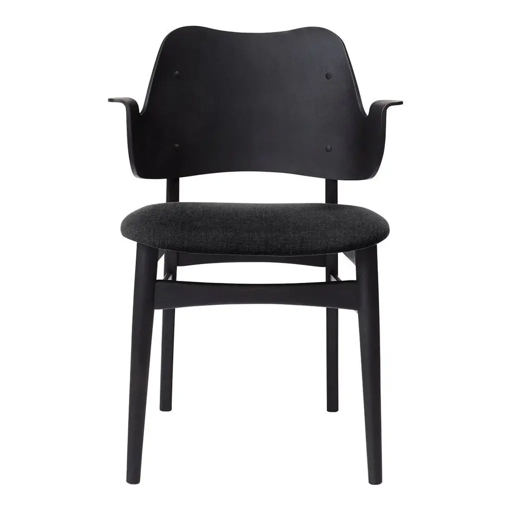 This beautiful, moulded Gesture chair, designed in the 1950s, was the work of the acclaimed Danish architect, Hans Olsen. With its welcoming design, the Gesture chair creates a warm atmosphere around a dining table or at a desk in the living room, where it does not hurt if a chair is something special. The armrests invite you to sit down and relax in the moulded design and are also constructed so you cannot get too close to the table. Gesture is a designer chair with a certain weight, offset by its light, playful charm. As a tribute to the 1950s' adoration of colour, the Gesture chair is available in an abundance of stunning colours in three versions: fully upholstered; with upholstery on the seat; or a unique type of wood depending on the look you after. Choose from high quality leather or several different exclusive fabrics in the most beautiful colours from the Warm Nordic universe. The frame is available in several exclusive types of wood and a variety of surface treatments.