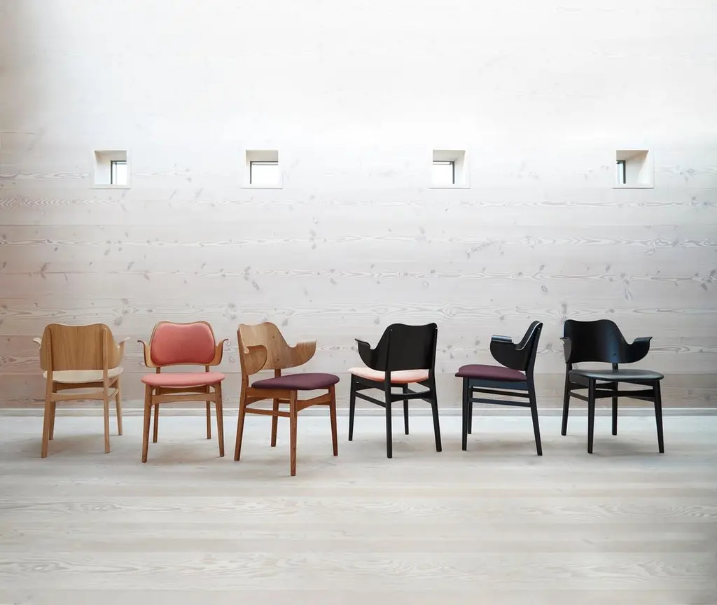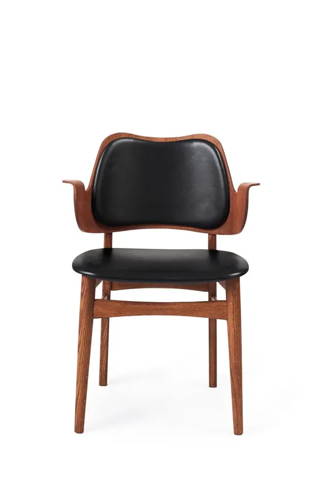 Gesture chair teak oiled oak black leather by Warm NordicDimensions: D 56 x W 53 x H 80 cmMaterial: Teak or white oiled solid oak, Black lacquered solid beech, Veneer seat and back, leather upholsteryWeight: 7.5 kgAlso available in different colours and finishes.This beautiful, moulded Gesture Chair, designed in the 1950s, was the work of the acclaimed Danish architect, Hans Olsen. Gesture Chair is now available in an exclusive anniversary edition with a sustainable fabric launched to celebrate the 100th anniversary of Hans Olsen. With its welcoming design, the Gesture Chair creates a warm atmosphere around a dining table or at a desk in the living room, where it does not hurt if a chair is something special. The armrests invite you to sit down and relax in the moulded design and are also constructed so you cannot get too close to the table. Gesture is a designer chair with a certain weight, offset by its light, playful charm. As a tribute to the 1950s' adoration of colour, the Gesture Chair is available in an abundance of stunning colours and comes with upholstery on seat and back, upholstery on the seat; or a unique type of wood - depending on the desired look. Choose from high quality leather or several different exclusive fabrics in the most beautiful colours from the Warm Nordic universe. The frame is available in several exclusive types of wood and a variety of surface treatments. The anniversary edition of the Gesture Chair is constructed of black lacquered beech with leather upholstery on the back and a sustainable fabric from Kvadrat on the seat. The fabric, Merit by Maharam, is available in four exclusively selected colours with a modern lightness. The back and seat are made of FSC-certified wood on the anniversary edition of the chair.Warm Nordic is an ambitious design brand anchored in Nordic design history and with a timeless, aesthetic style that inspires you to appreciate the little things in life. The company is the result of several years’ intense work on developing a new design brand with design history, quality and personality at its core. Warm Nordic boasts a colourful and charming universe of furniture, lamps and accessories full of personality. Our designs encapsulate the Nordic spirit, which in its essence is timeless, inclusive and warm.