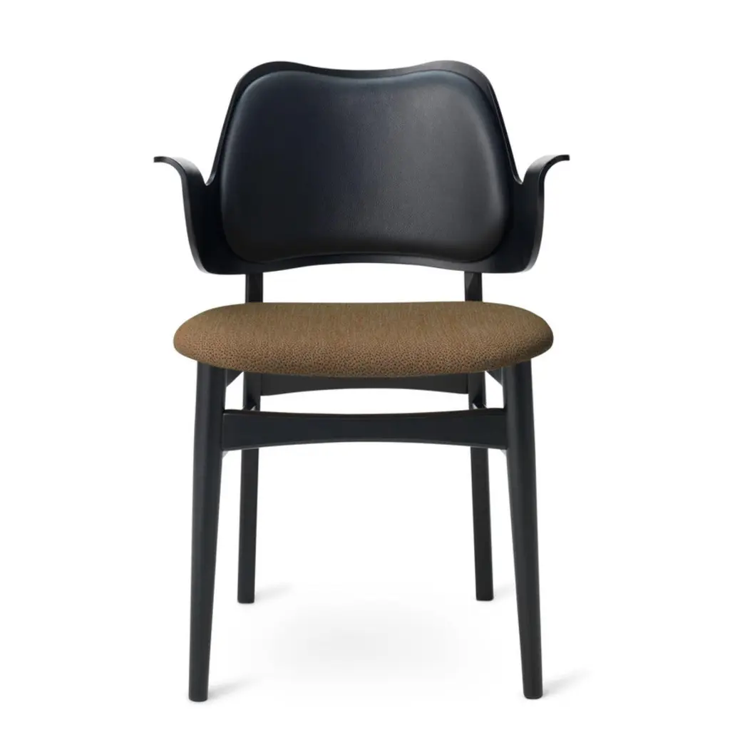 Gesture Chair Teak Oiled Oak Black Leather Cappuccino Brown by Warm NordicDimensions: D56 x W53 x H 80 cmMaterial: Teak or white oiled solid oak, Black lacquered solid beech, Veneer seat and back, leather upholsteryWeight: 7.5 kgAlso available in different colours and finishes. Please contact us.This beautiful, moulded Gesture Chair, designed in the 1950s, was the work of the acclaimed Danish architect, Hans Olsen. Gesture Chair is now available in an exclusive anniversary edition with a sustainable fabric launched to celebrate the 100th anniversary of Hans Olsen. With its welcoming design, the Gesture Chair creates a warm atmosphere around a dining table or at a desk in the living room, where it does not hurt if a chair is something special. The armrests invite you to sit down and relax in the moulded design and are also constructed so you cannot get too close to the table. Gesture is a designer chair with a certain weight, offset by its light, playful charm. As a tribute to the 1950s' adoration of colour, the Gesture Chair is available in an abundance of stunning colours and comes with upholstery on seat and back, upholstery on the seat; or a unique type of wood - depending on the desired look. Choose from high quality leather or several different exclusive fabrics in the most beautiful colours from the Warm Nordic universe. The frame is available in several exclusive types of wood and a variety of surface treatments. The anniversary edition of the Gesture Chair is constructed of black lacquered beech with leather upholstery on the back and a sustainable fabric from Kvadrat on the seat. The fabric, Merit by Maharam, is available in four exclusively selected colours with a modern lightness. The back and seat are made of FSC-certified wood on the anniversary edition of the chair.Warm Nordic is an ambitious design brand anchored in Nordic design history and with a timeless, aesthetic style that inspires you to appreciate the little things in life. The company is the result of several years’ intense work on developing a new design brand with design history, quality and personality at its core. Warm Nordic boasts a colourful and charming universe of furniture, lamps and accessories full of personality. Our designs encapsulate the Nordic spirit, which in its essence is timeless, inclusive and warm.