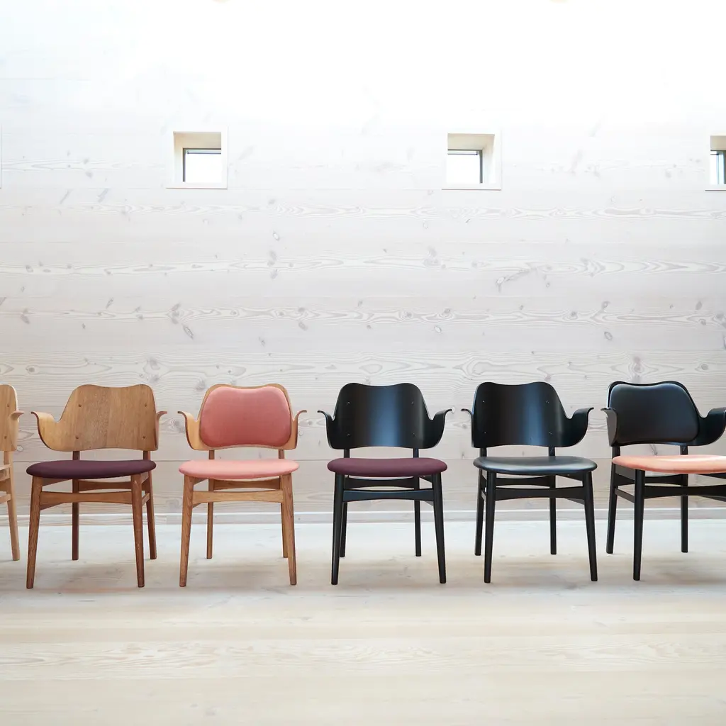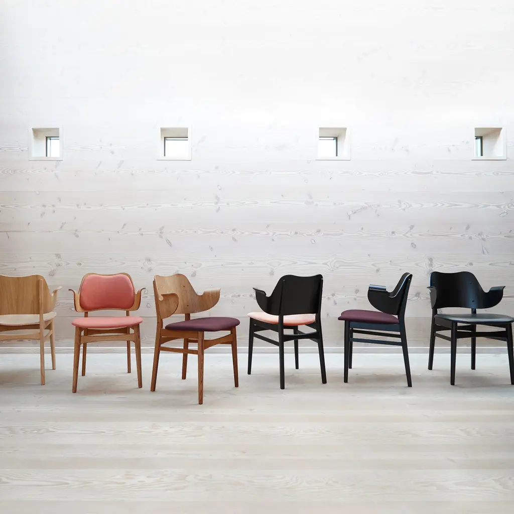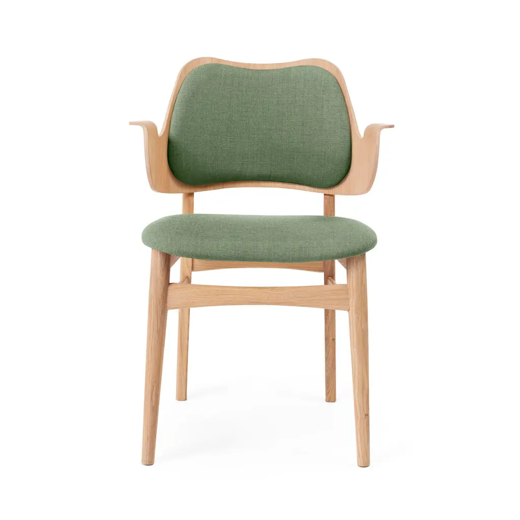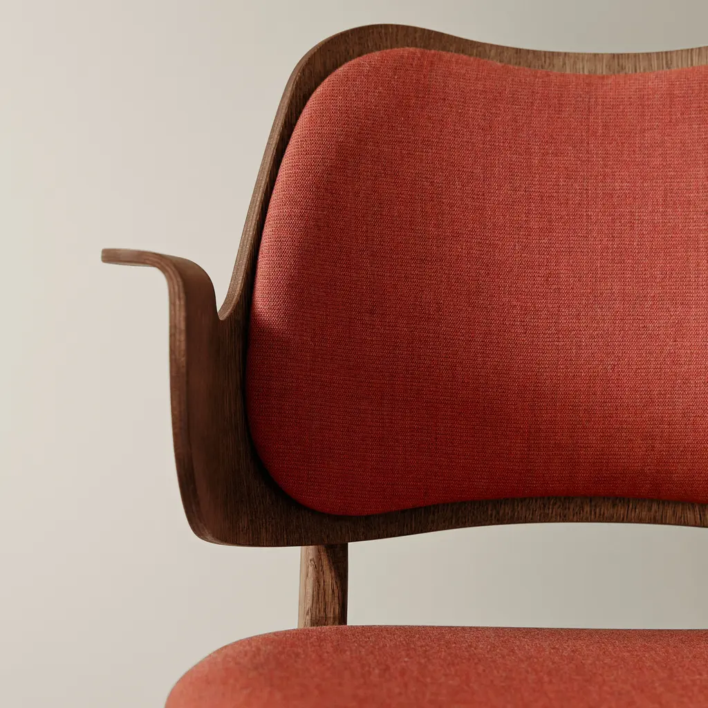 The Gesture Dining Chair is a 1957 design by renowned Danish architect Hans Olsen. This chair stands out for its distinctive curved form and welcoming design, making it a perfect fit for both dining and living spaces. Upholstered in high-quality fabric, the chair offers exceptional comfort with both the seat and backrest fully padded. The solid wood frame is available in finishes such as teak oiled oak, white oiled oak or black lacquered beech.