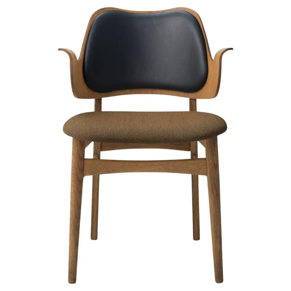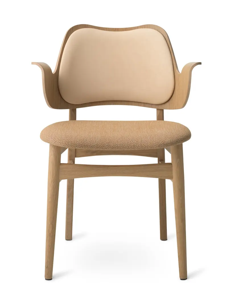 This beautiful, moulded Gesture Chair, designed in the 1950s, was the work of the acclaimed Danish architect, Hans Olsen. With its welcoming design, the Gesture Chair creates a warm atmosphere around a dining table or at a desk in the living room, where it does not hurt if a chair is something special. The armrests invite you to sit down and relax in the moulded design and are also constructed so you cannot get too close to the table. Gesture is a designer chair with a certain weight, offset by its light, playful charm. As a tribute to the 1950s’ adoration of color, the Gesture Chair is available in an abundance of stunning colors and comes with upholstery on seat and back, upholstery on the seat; or a unique type of wood – depending on the look you after.Additional information:Materials: Wood, foam, and upholstery Frame Finish: White oiled solid oakAvailable colors: Leather black/brown; leather nature/latteDimensions: W. 59.2 x D. 54.3 x H. 80.5Seat height: 46.
