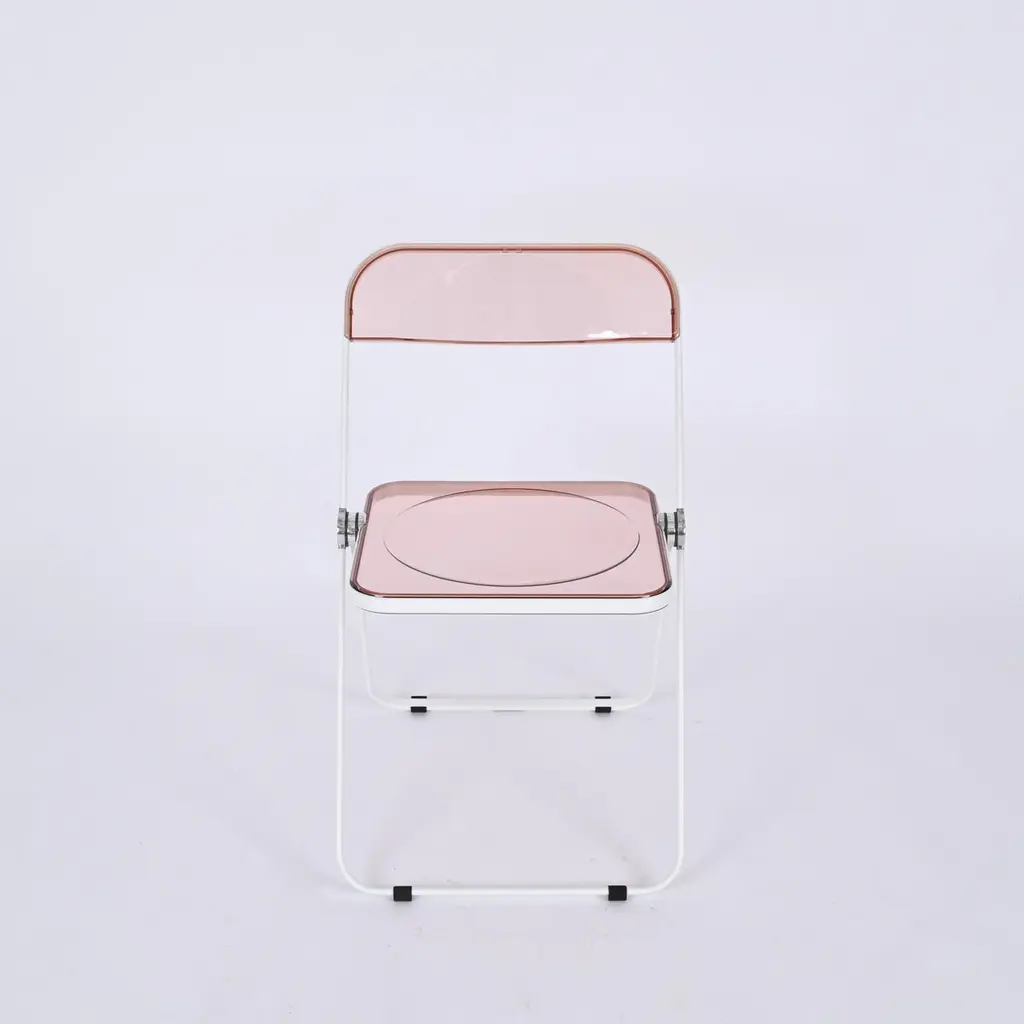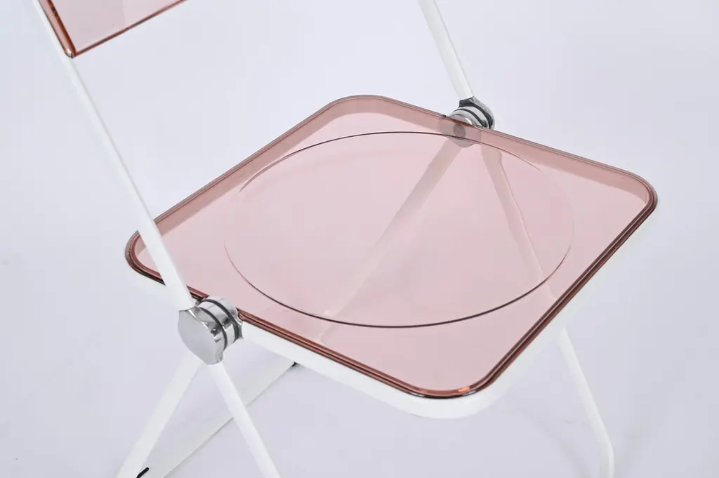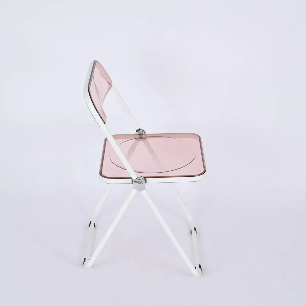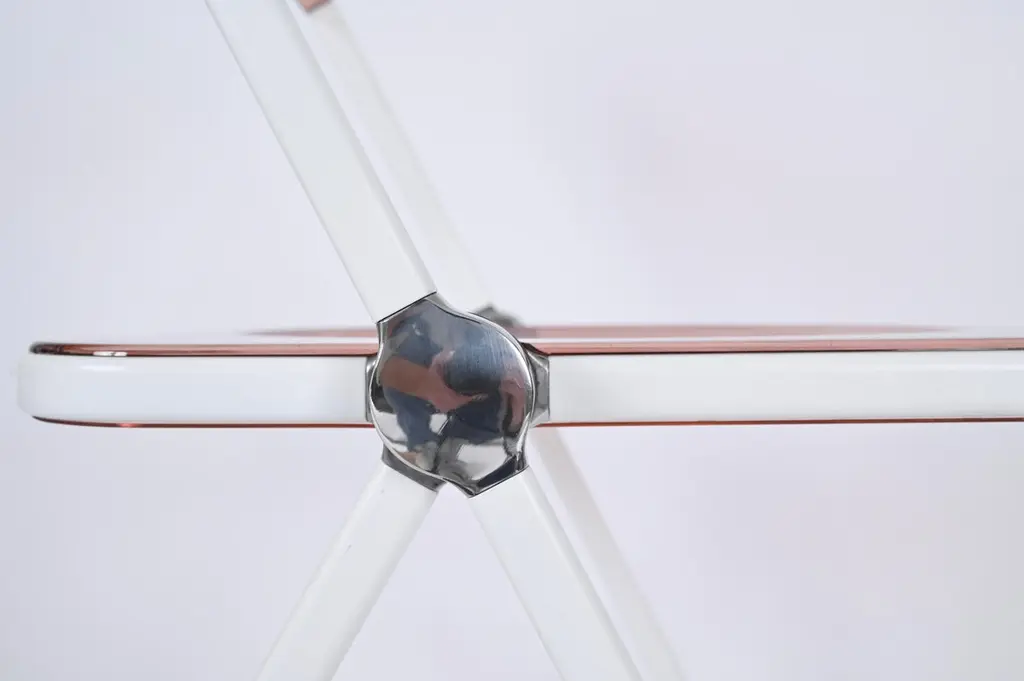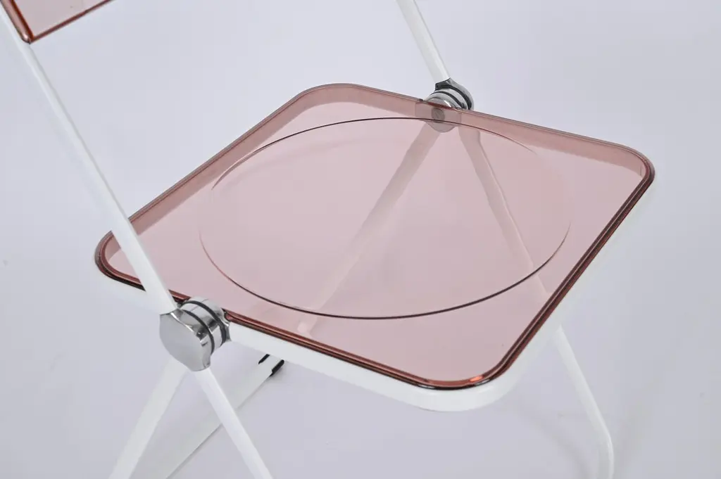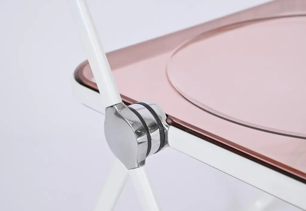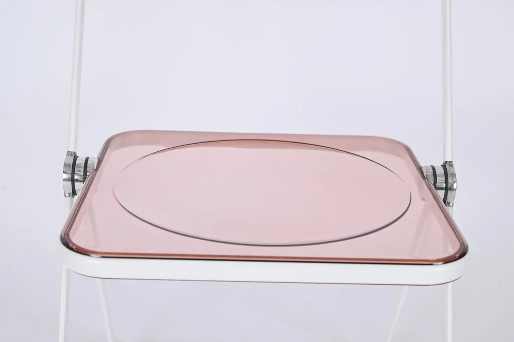 Original and signed "Plia" folding chairs in the gorgeous version with white metal structure and pink lucite. In perfect conditions, NOS (new old stock). This fantastic set was designed by Giancarlo Piretti for Castelli in 1967.The white metal structure pairs amazingly with the pink lucite, making this versatile folding chair extremely elegant and perfect for a Mid-Century Modern style project.PLIA, the symbol of a new era focused on plastic: This is how the plia chair from 1967 was welcomed when it was presented at the Salone del Mobile in Milan. At the fair, the session was so popular that many visitors walked away from the stand taking samples without even asking for permission ... following this unorthodox compliment, the chairs were tied with a chain for safety.The "Plia" folding chair is a true design classic as it has won numerous awards and is also part of the MoMA collection. The "Plia" chair has a fantastic folding mechanism which allows the chair to be folded very flat so that it can be stored easily. Each chair in this set is signed and engraved with the manufacturer's mark. A multipurpose and iconic set that will be perfect for a modern or minimal project. Giancarlo Piretti was born in Bologna in 1940. he He attended the Bologna State Institute of Art, where he obtained the title of Professor of Design. In 1960 he attended the Academy of Fine Arts in Bologna. Subsequently, for seven years, he was a lecturer in Industrial Design at the State Art Institute of Bologna. In the same period, for 12 years, he worked as an interior designer for Anonima Castelli, designing their lines of furniture for the home, office and community, for which he has registered numerous industrial and mechanical invention patents. His best-known projects include PLIA, a folding chair, PLATONE, a folding table, DSC (106-AXIS), a seating system for collective and institutional spaces, and SISTEMA 61, a modular sofa system. Giancarlo Piretti participates in numerous Italian design competitions, obtaining prizes and special mentions. In 1971 he received the SMAU award and the BIO 5 Distinction at the Ljubljana biennial, Slovenia for Plia. In 1973 he was awarded, as always for PLIA, the GUTE FORM mention by the Chamber of Commerce of the Federal Republic of Germany, and a special mention by the British Government. In 1971 PLANO won the IBD gold medal (USA). For the VERTEBRA seating system: in 1977 he was awarded, together with Emilio Ambasz, the gold medal of BD (USA), the SMAU prize in 1979 and the Compasso d'Oro (Italy) in 1981. As always together with Ambasz, in 1980 receives the "National Industrial Design Award" (USA) for LOGOTEC, a lighting system. In 1975 Giancarlo Piretti was appointed member of the Scientific-Didactic Committee of the Higher Institute for Artistic Industries of Florence. His work is often published in numerous international journals.