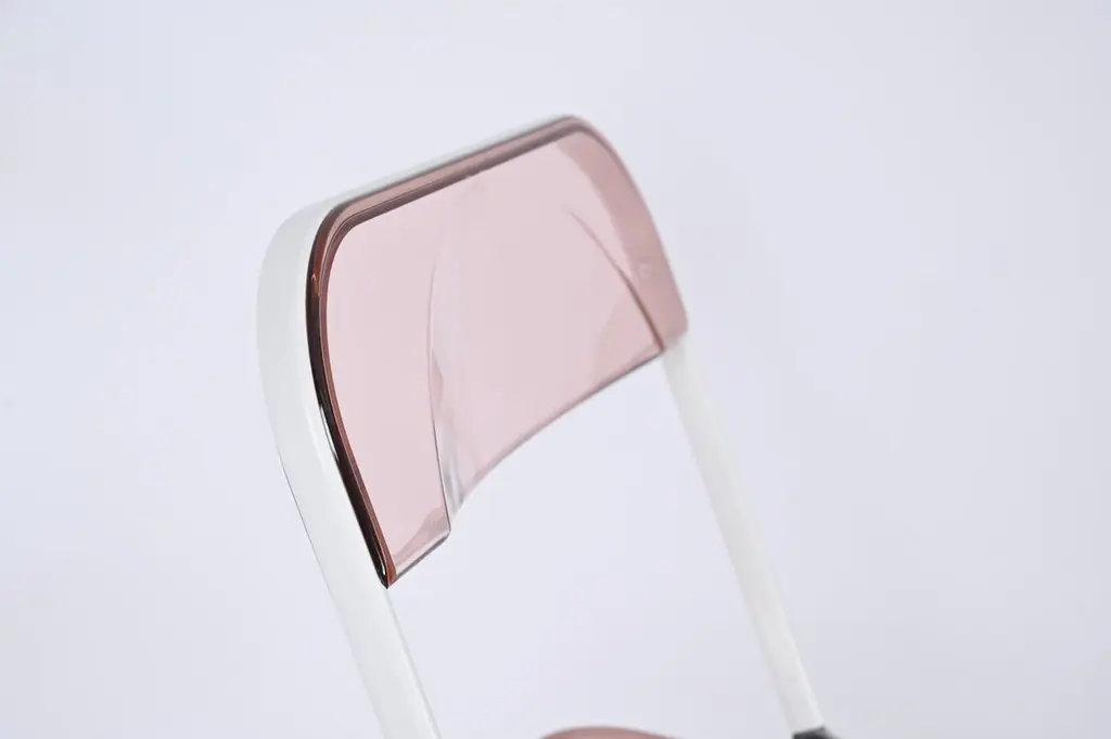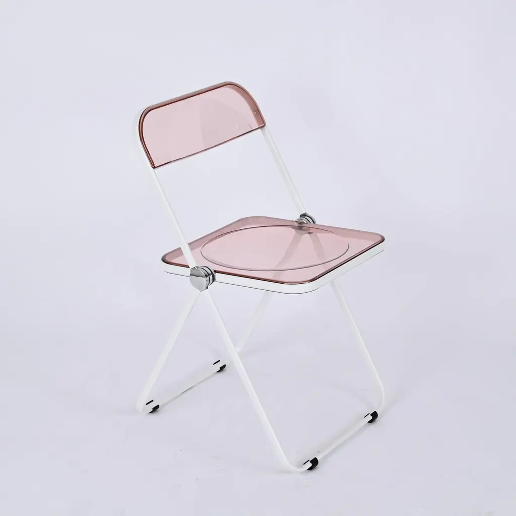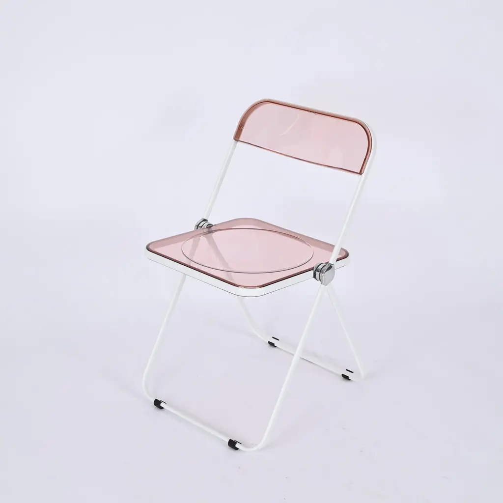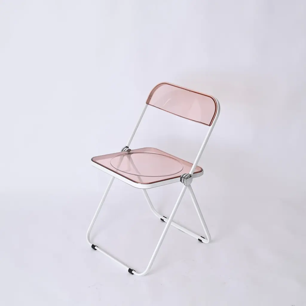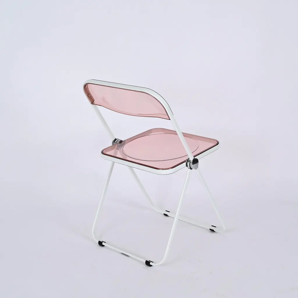 Original and signed "Plia" folding chairs in the gorgeous version with white metal structure and pink lucite. In perfect conditions, NOS (new old stock). This fantastic set was designed by Giancarlo Piretti for Castelli in 1967.The white metal structure pairs amazingly with the pink lucite, making this versatile folding chair extremely elegant and perfect for a Mid-Century Modern style project.PLIA, the symbol of a new era focused on plastic: This is how the plia chair from 1967 was welcomed when it was presented at the Salone del Mobile in Milan. At the fair, the session was so popular that many visitors walked away from the stand taking samples without even asking for permission ... following this unorthodox compliment, the chairs were tied with a chain for safety.The "Plia" folding chair is a true design classic as it has won numerous awards and is also part of the MoMA collection. The "Plia" chair has a fantastic folding mechanism which allows the chair to be folded very flat so that it can be stored easily. Each chair in this set is signed and engraved with the manufacturer's mark. A multipurpose and iconic set that will be perfect for a modern or minimal project. Giancarlo Piretti was born in Bologna in 1940. he He attended the Bologna State Institute of Art, where he obtained the title of Professor of Design. In 1960 he attended the Academy of Fine Arts in Bologna. Subsequently, for seven years, he was a lecturer in Industrial Design at the State Art Institute of Bologna. In the same period, for 12 years, he worked as an interior designer for Anonima Castelli, designing their lines of furniture for the home, office and community, for which he has registered numerous industrial and mechanical invention patents. His best-known projects include PLIA, a folding chair, PLATONE, a folding table, DSC (106-AXIS), a seating system for collective and institutional spaces, and SISTEMA 61, a modular sofa system. Giancarlo Piretti participates in numerous Italian design competitions, obtaining prizes and special mentions. In 1971 he received the SMAU award and the BIO 5 Distinction at the Ljubljana biennial, Slovenia for Plia. In 1973 he was awarded, as always for PLIA, the GUTE FORM mention by the Chamber of Commerce of the Federal Republic of Germany, and a special mention by the British Government. In 1971 PLANO won the IBD gold medal (USA). For the VERTEBRA seating system: in 1977 he was awarded, together with Emilio Ambasz, the gold medal of BD (USA), the SMAU prize in 1979 and the Compasso d'Oro (Italy) in 1981. As always together with Ambasz, in 1980 receives the "National Industrial Design Award" (USA) for LOGOTEC, a lighting system. In 1975 Giancarlo Piretti was appointed member of the Scientific-Didactic Committee of the Higher Institute for Artistic Industries of Florence. His work is often published in numerous international journals.