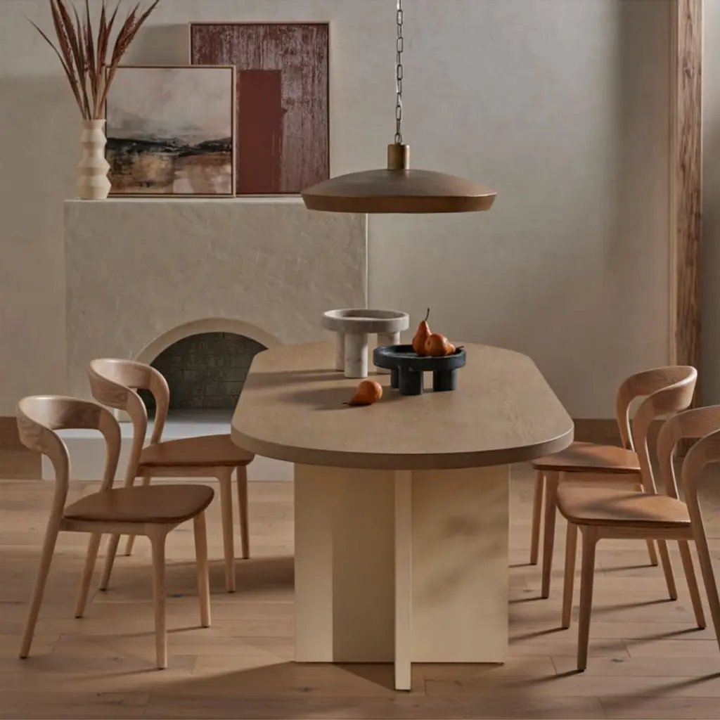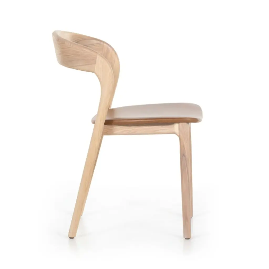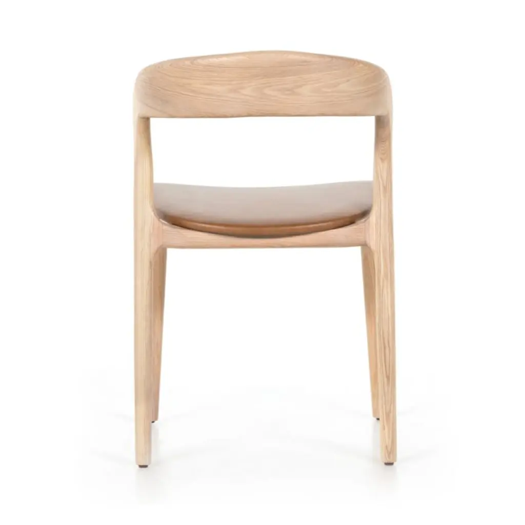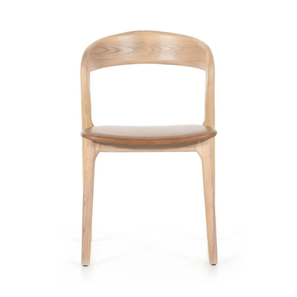 The natural beauty of wood and leather find perfect expression in the Scandinavian-inspired lines of our Gillie dining chair. Beautifully grained solid ash flows the simple, open frame, curving the chair's rounded back and angled legs. A slim saddle of top-grain leather in warm butterscotch provides a sleek and seamless seat. With its classic modern design, this wood and leather dining chair pairs beautifully with any of our dining tables.