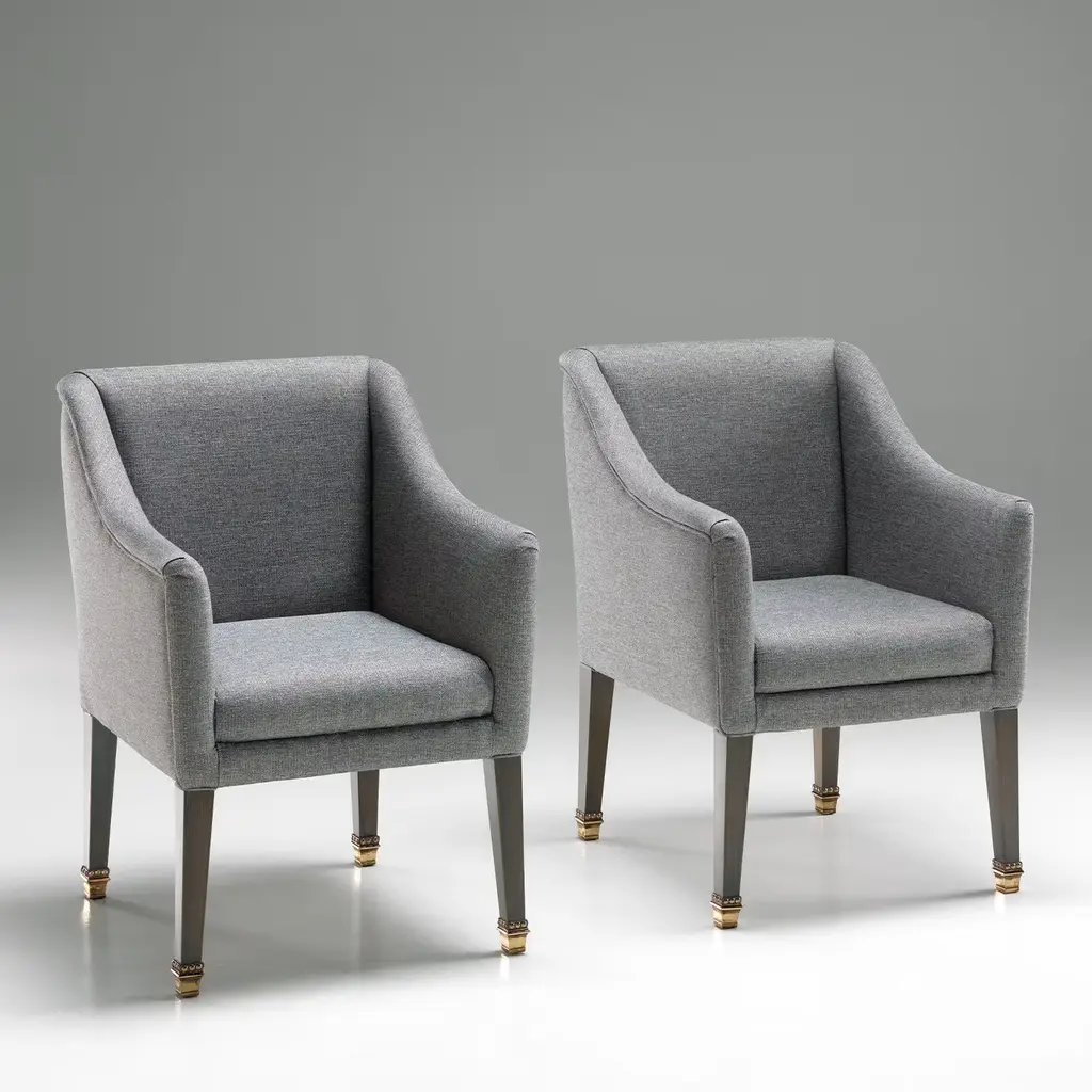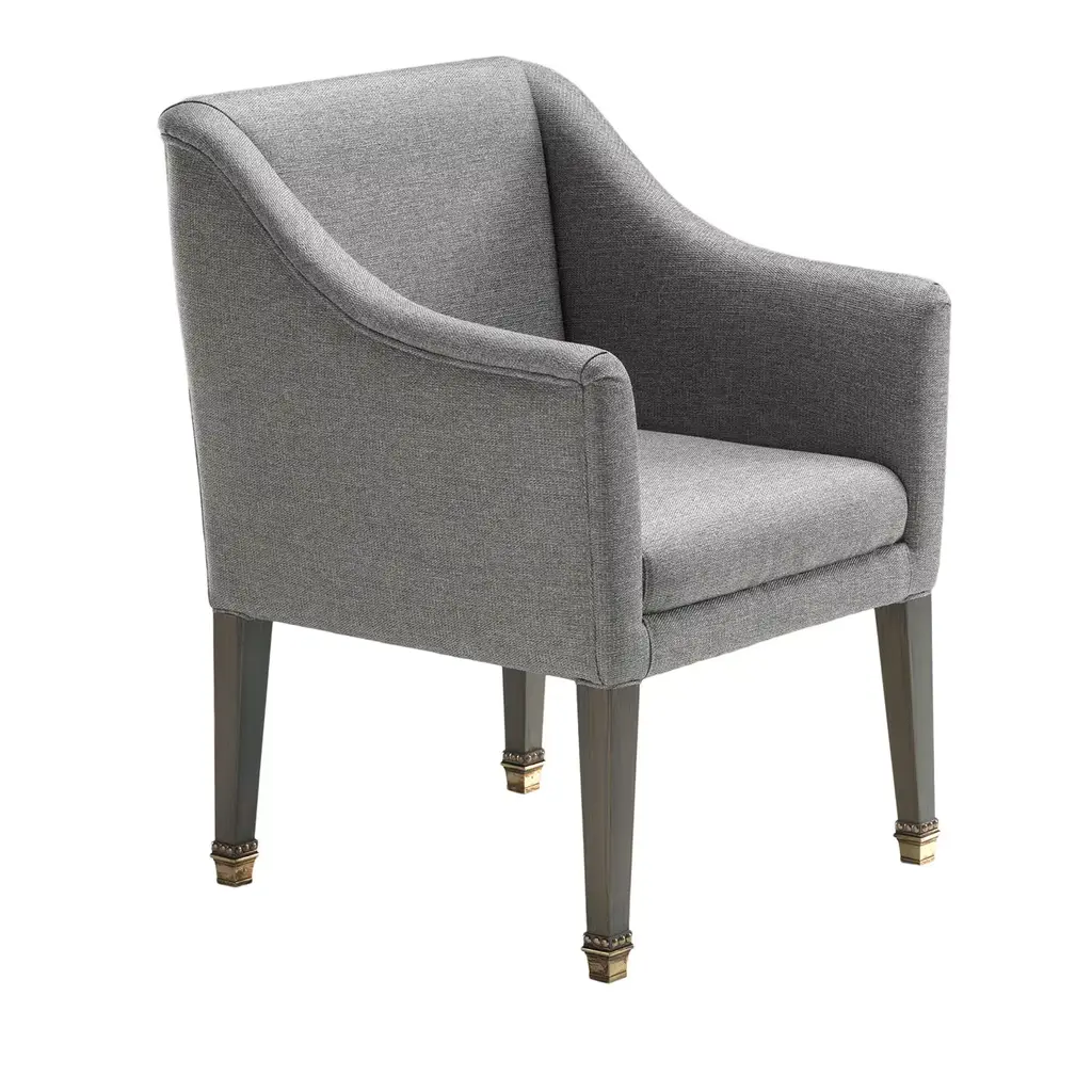 Sleek and clean lines of utmost sophistication define this timeless design, an office or living armchair of versatile character. Handmade of solid wood, the structure is upholstered with gray fabric, showcasing wooden legs and brass feet. Please consult the Concierge for further information and customization options.