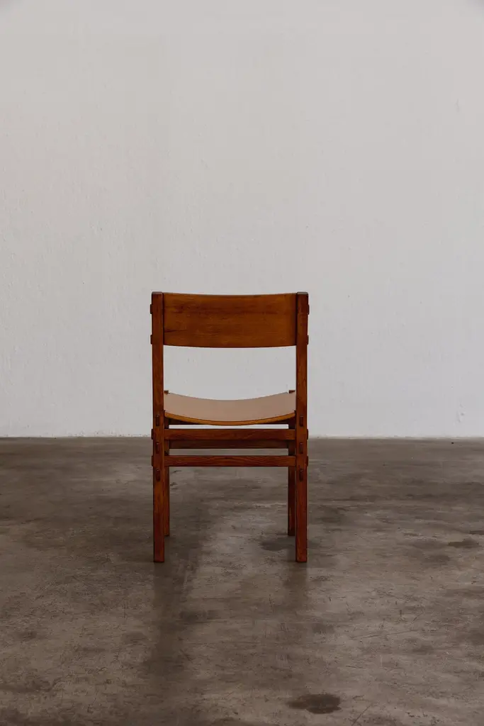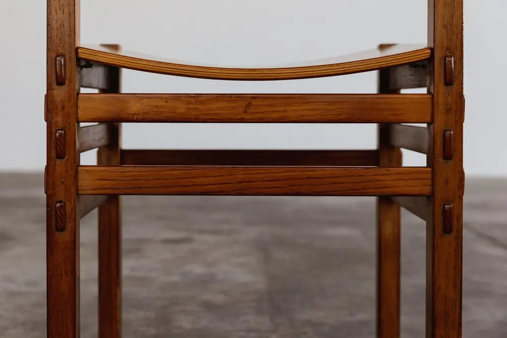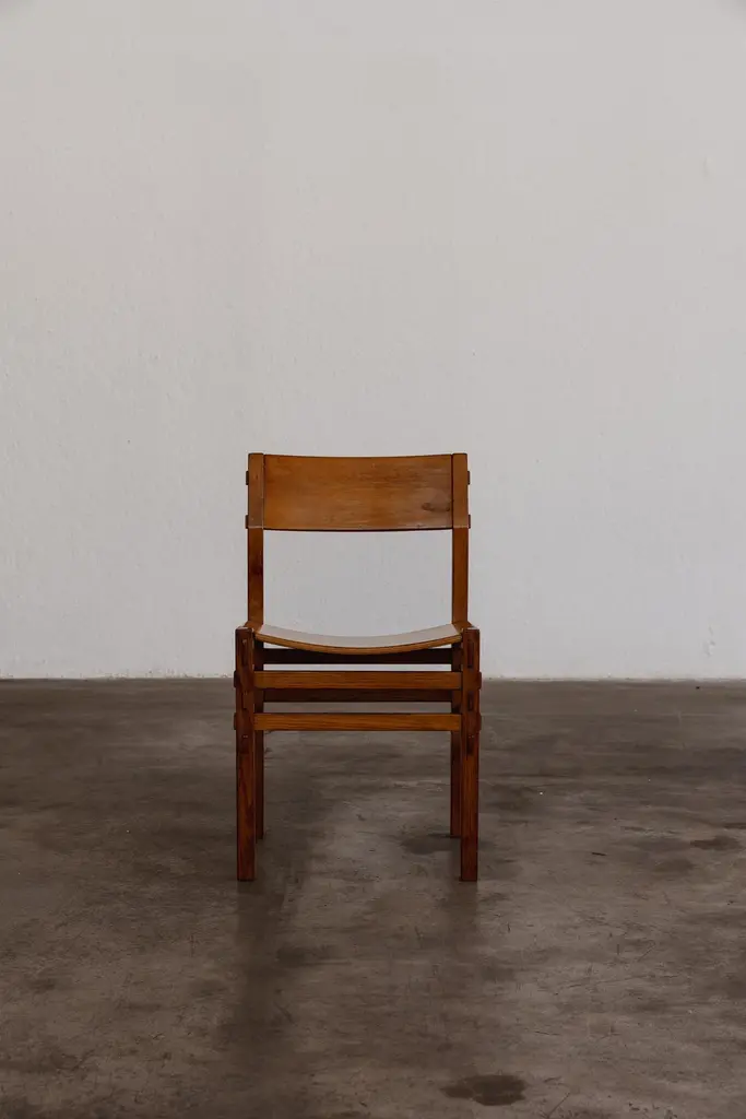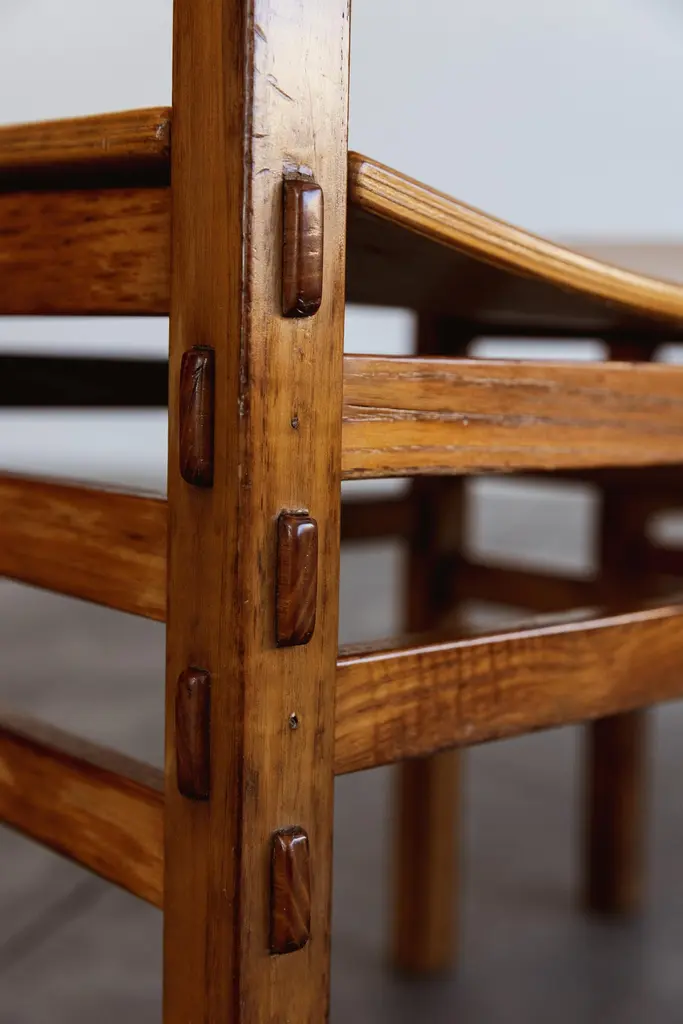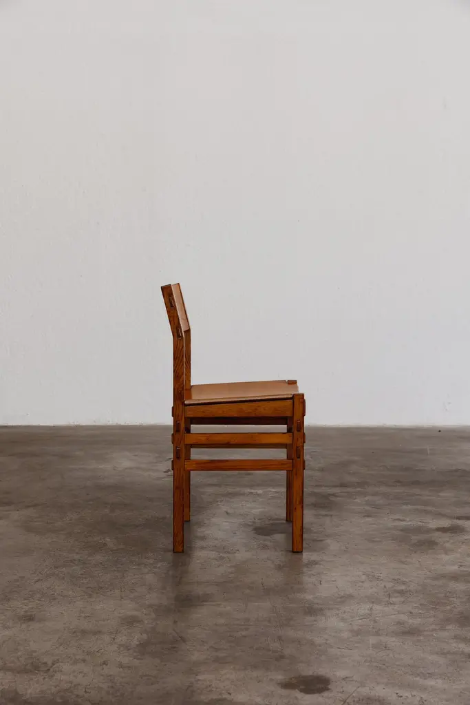 Giuseppe Rivadossi dining chair for Officina Rivadossi, 1980These Giuseppe Rivadossi dining chairs, crafted for Officina Rivadossi in 1980, embody masterful woodworking through an entirely interlocking construction. Made from oak, the chairs feature an inset, curved seat in plywood for ergonomic support. The square legs are connected by spindles as stretchers, enhancing both stability and visual appeal. Visible joinery on the legs and backrest showcases traditional craftsmanship, while the backrest's gentle curve provides comfort. The design avoids a static appearance, offering instead a rich, warm aesthetic. This set of six chairs exudes a refined architectural presence, making them a statement in any interior setting, balancing functional design with artisanal detail.Our in-house atelier in Italy carefully double-checks each piece. Please contact us for additional information.