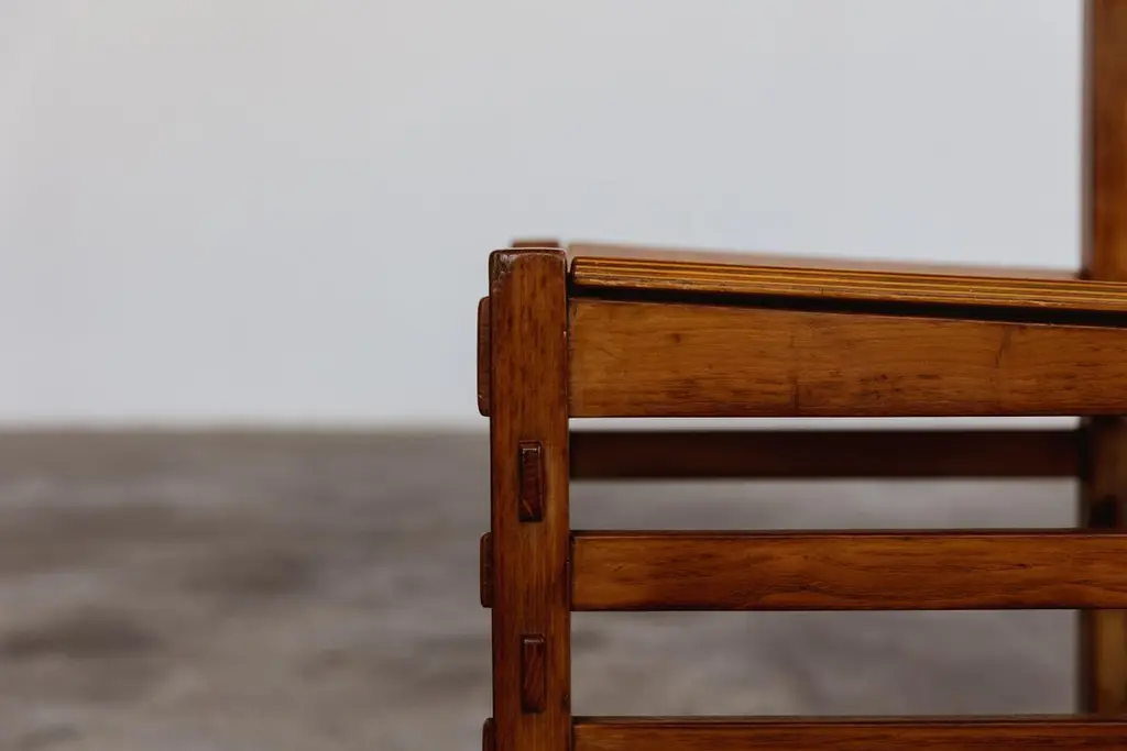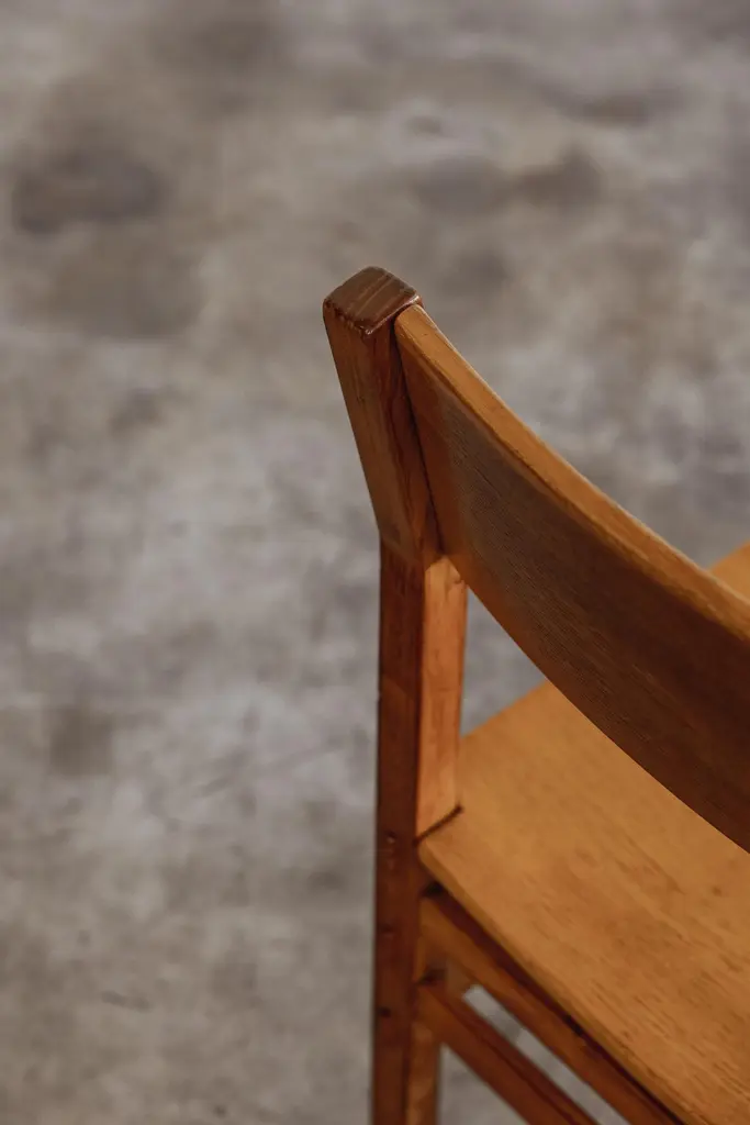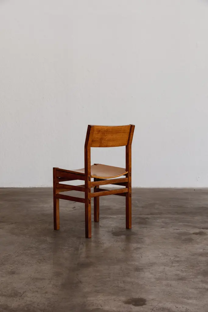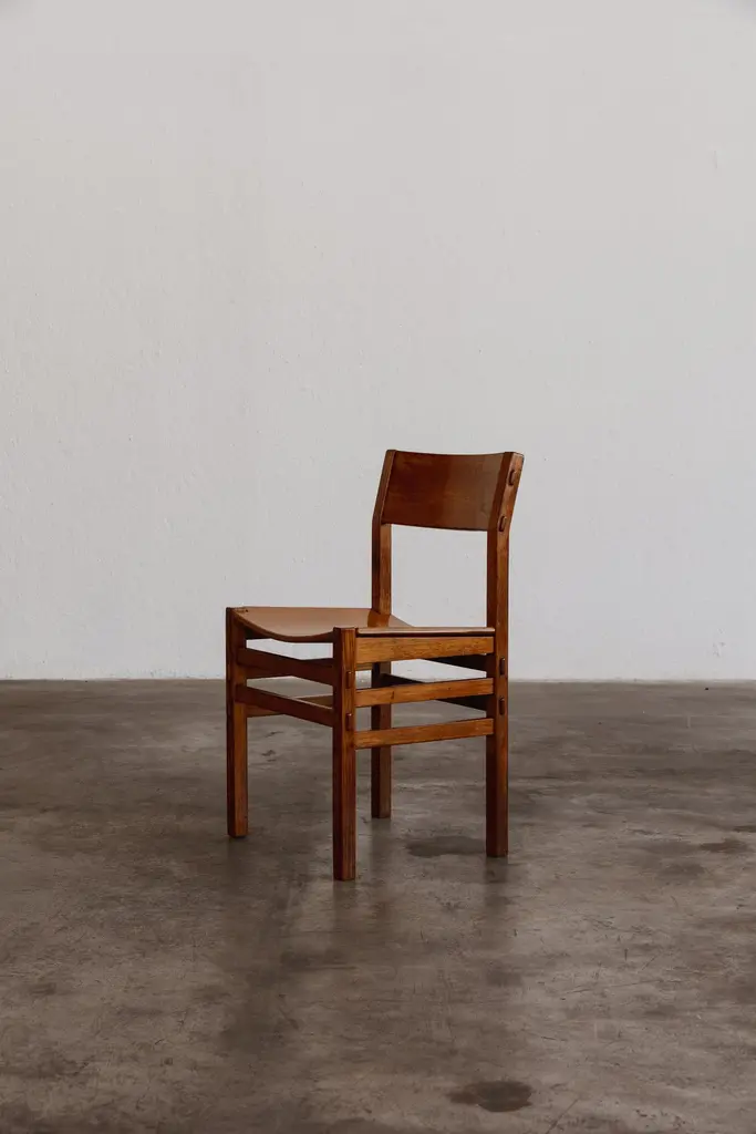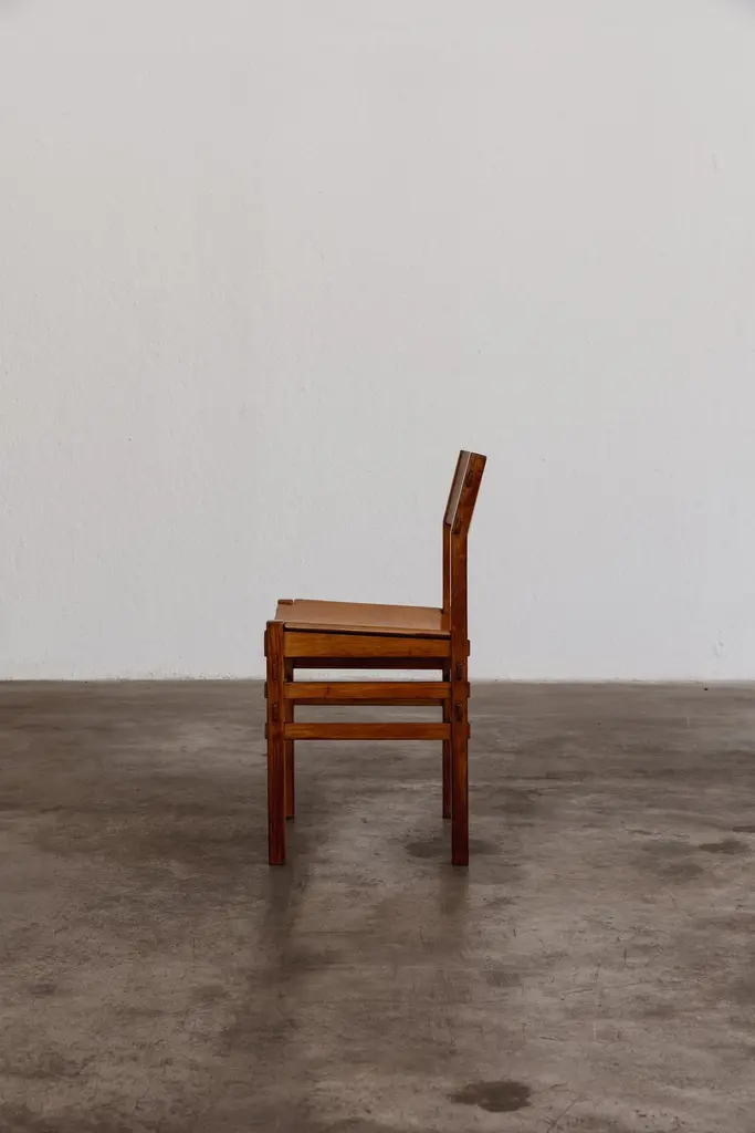 Giuseppe Rivadossi dining chair for Officina Rivadossi, 1980These Giuseppe Rivadossi dining chairs, crafted for Officina Rivadossi in 1980, embody masterful woodworking through an entirely interlocking construction. Made from oak, the chairs feature an inset, curved seat in plywood for ergonomic support. The square legs are connected by spindles as stretchers, enhancing both stability and visual appeal. Visible joinery on the legs and backrest showcases traditional craftsmanship, while the backrest's gentle curve provides comfort. The design avoids a static appearance, offering instead a rich, warm aesthetic. This set of six chairs exudes a refined architectural presence, making them a statement in any interior setting, balancing functional design with artisanal detail.Our in-house atelier in Italy carefully double-checks each piece. Please contact us for additional information.