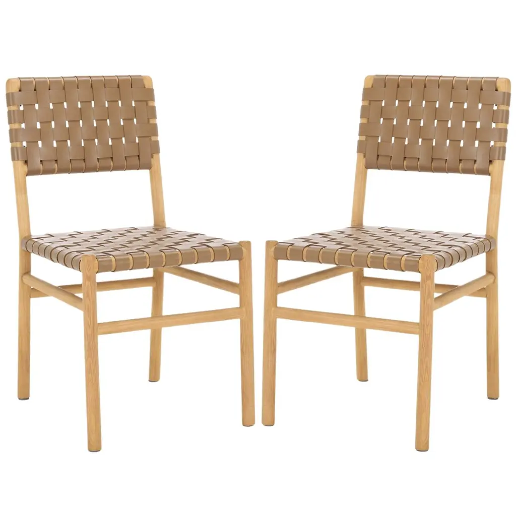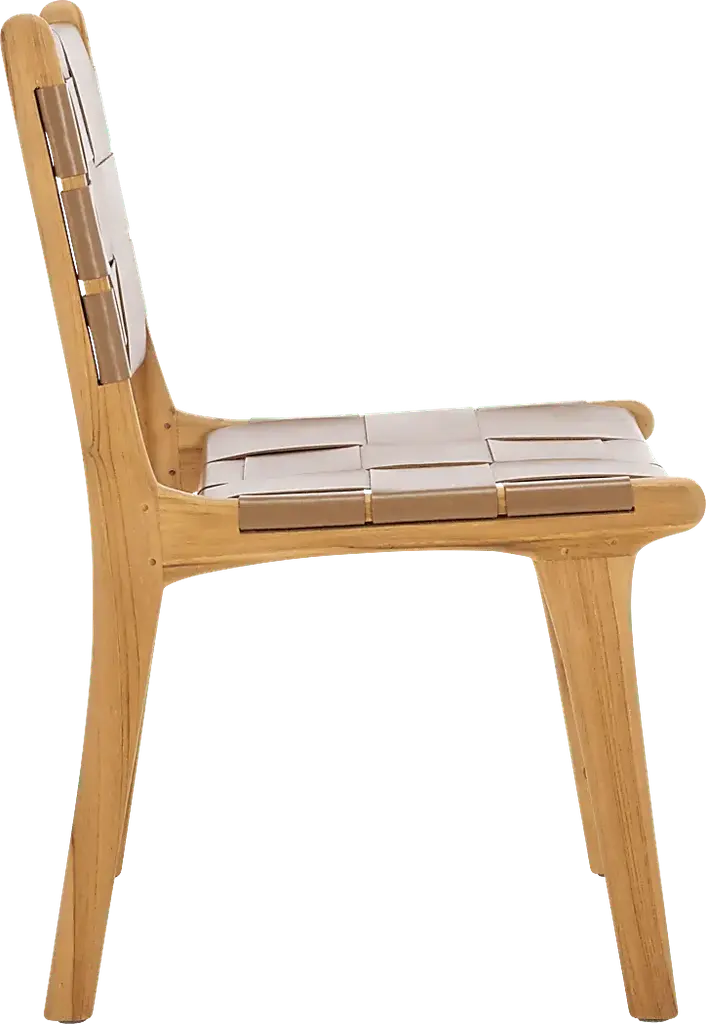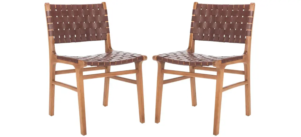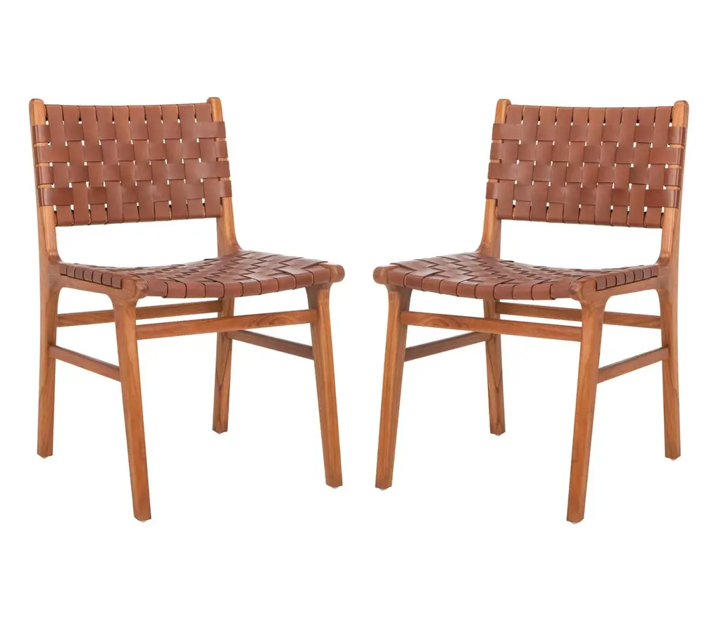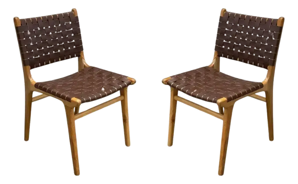 This Givernola brown side chair set blends traditional craftsmanship with modern design. Featuring a hand-woven black top grain leather seat and a sturdy teak wood frame, it offers lasting comfort and timeless style. A versatile piece that elevates any dining space. Customer assembly required.