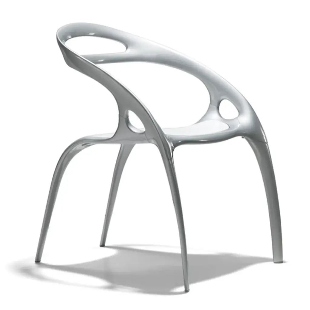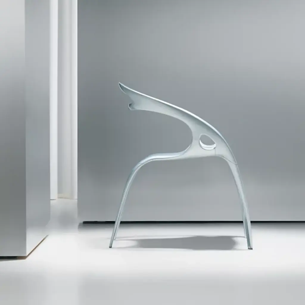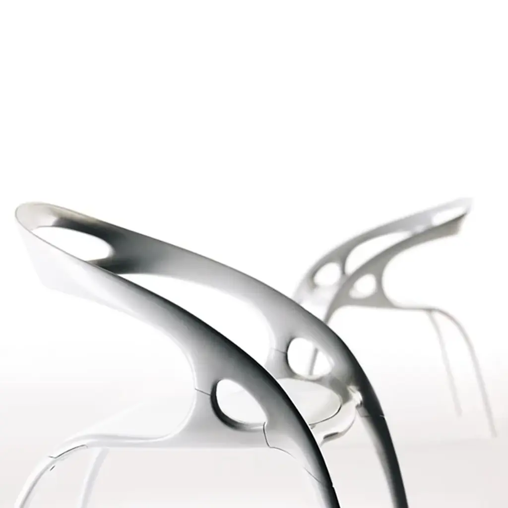 Not your ordinary chair. The Go Arm/Side Chair by Bernhardt Design is a show-stopping addition to your home or office. Designer Ross Lovegrove moved a standard chair's back legs to the front and its front legs to the back, and voila you have this artful piece. This stackable chair is as much as a seating option as it is a décor arrangement. The graceful profile with striking cutouts garners attention anywhere. It features a silver powder-coated magnesium frame with white polypropylene seat.